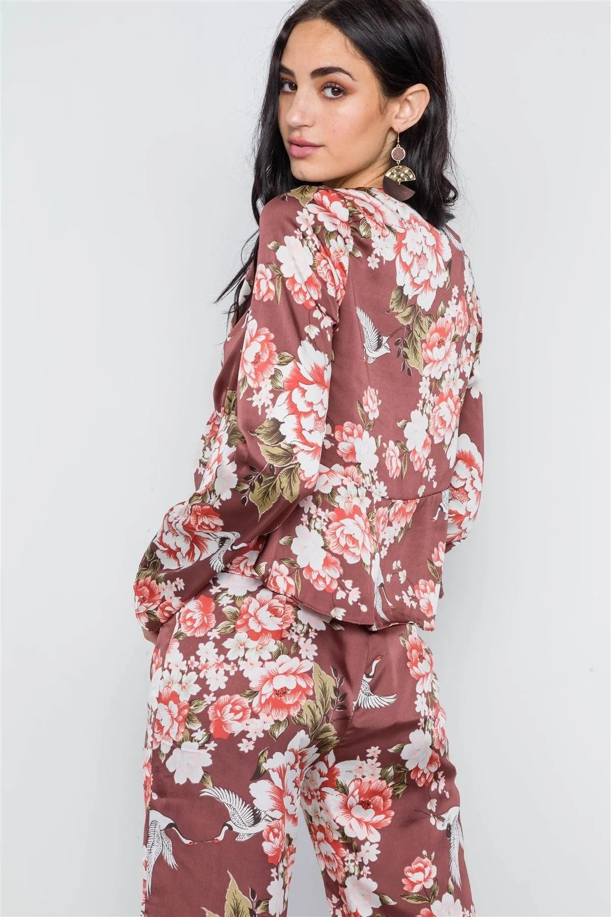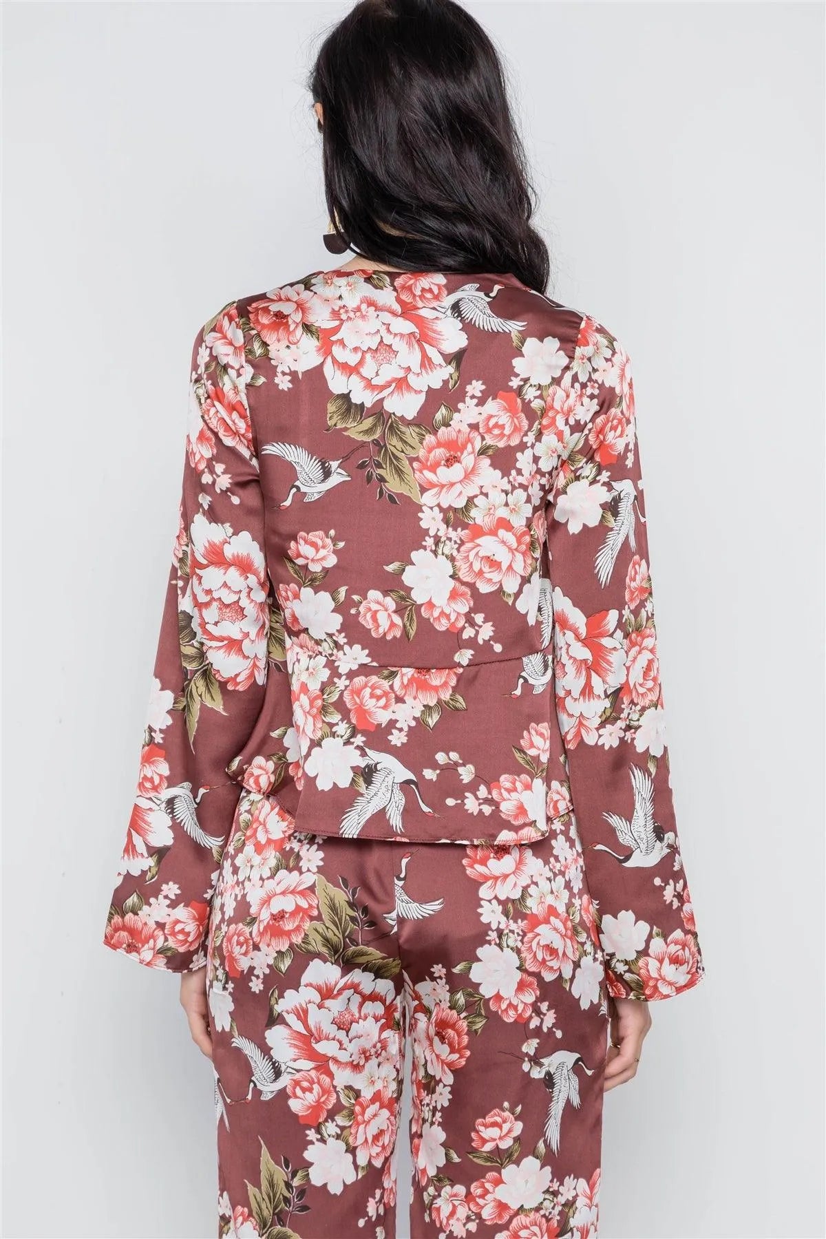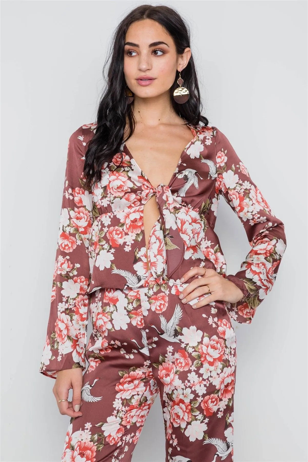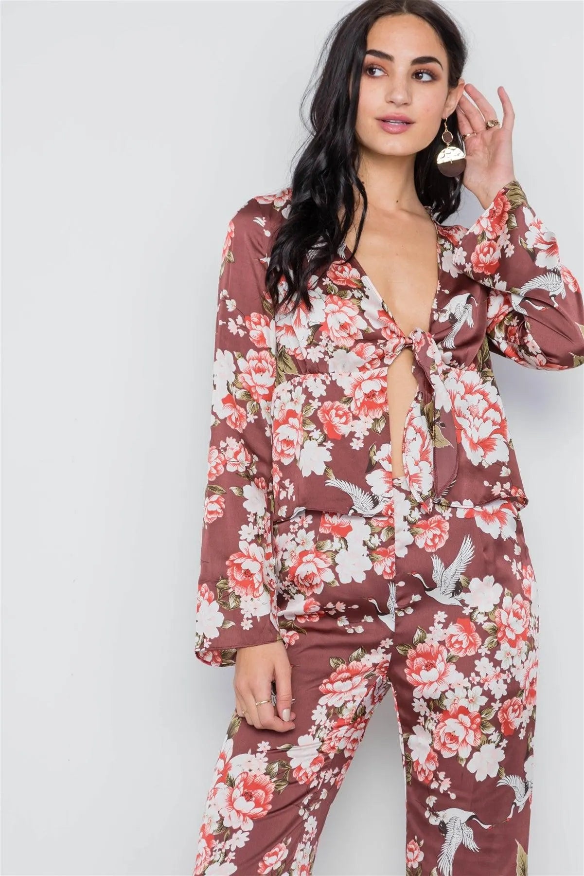 Brick Floral Print Bell Sleeve Front Tie Satin Top /3-2-1