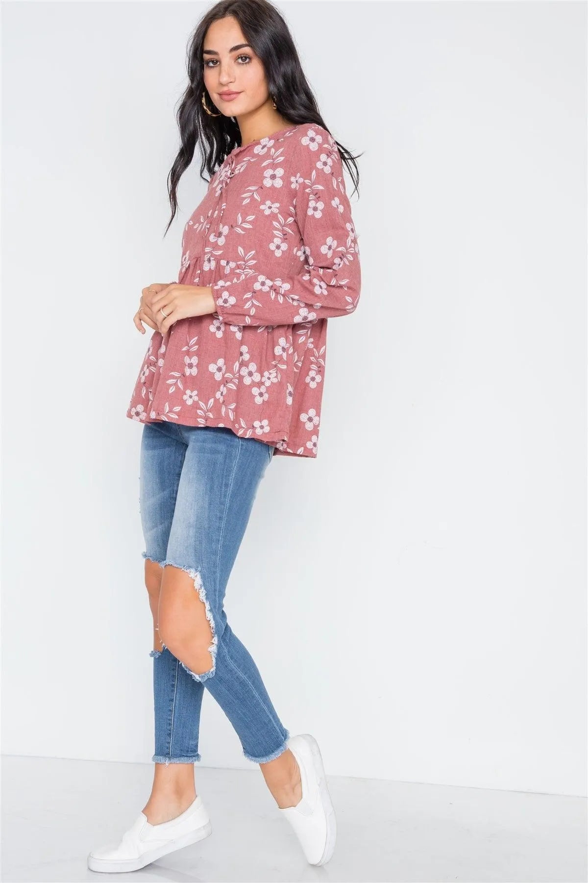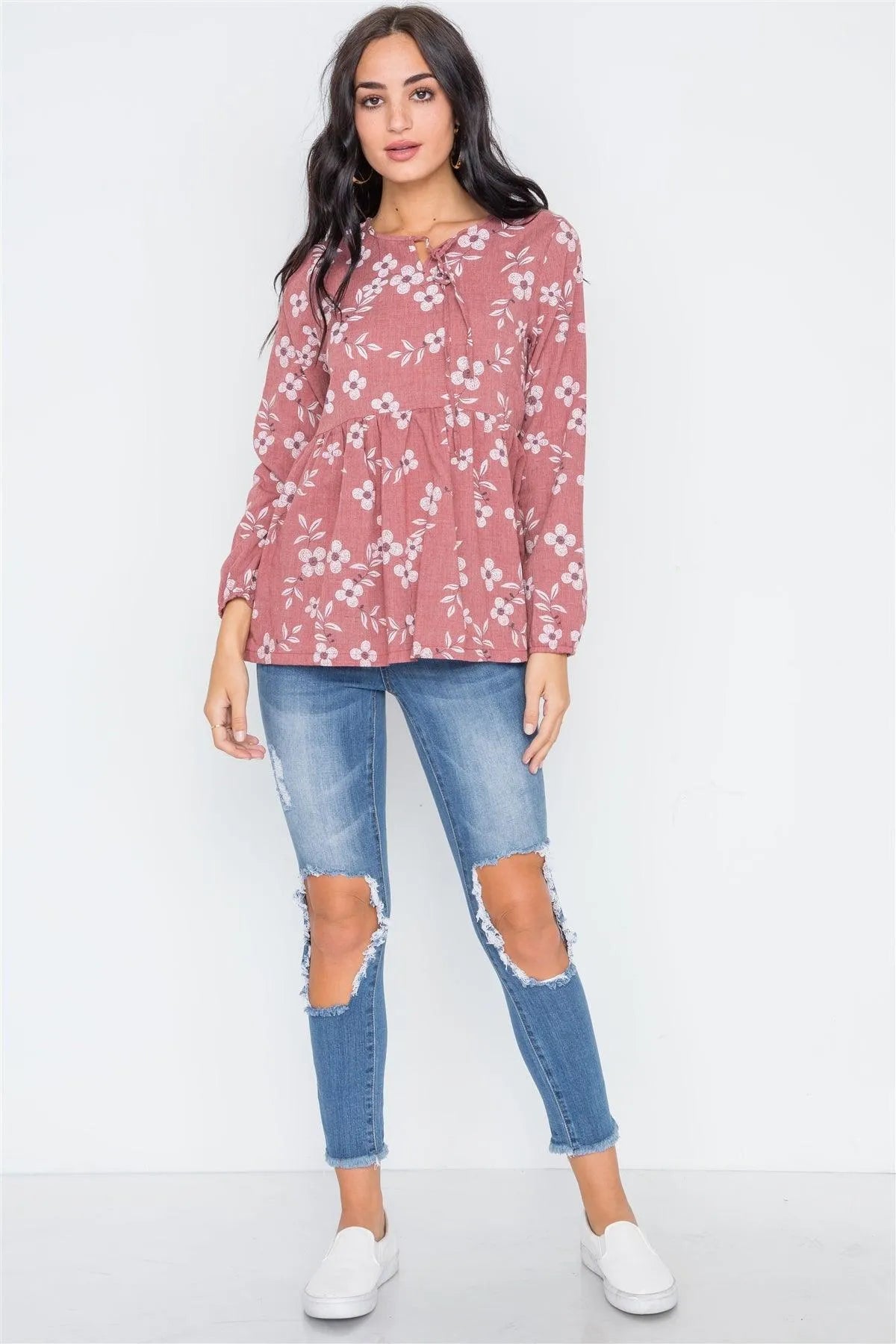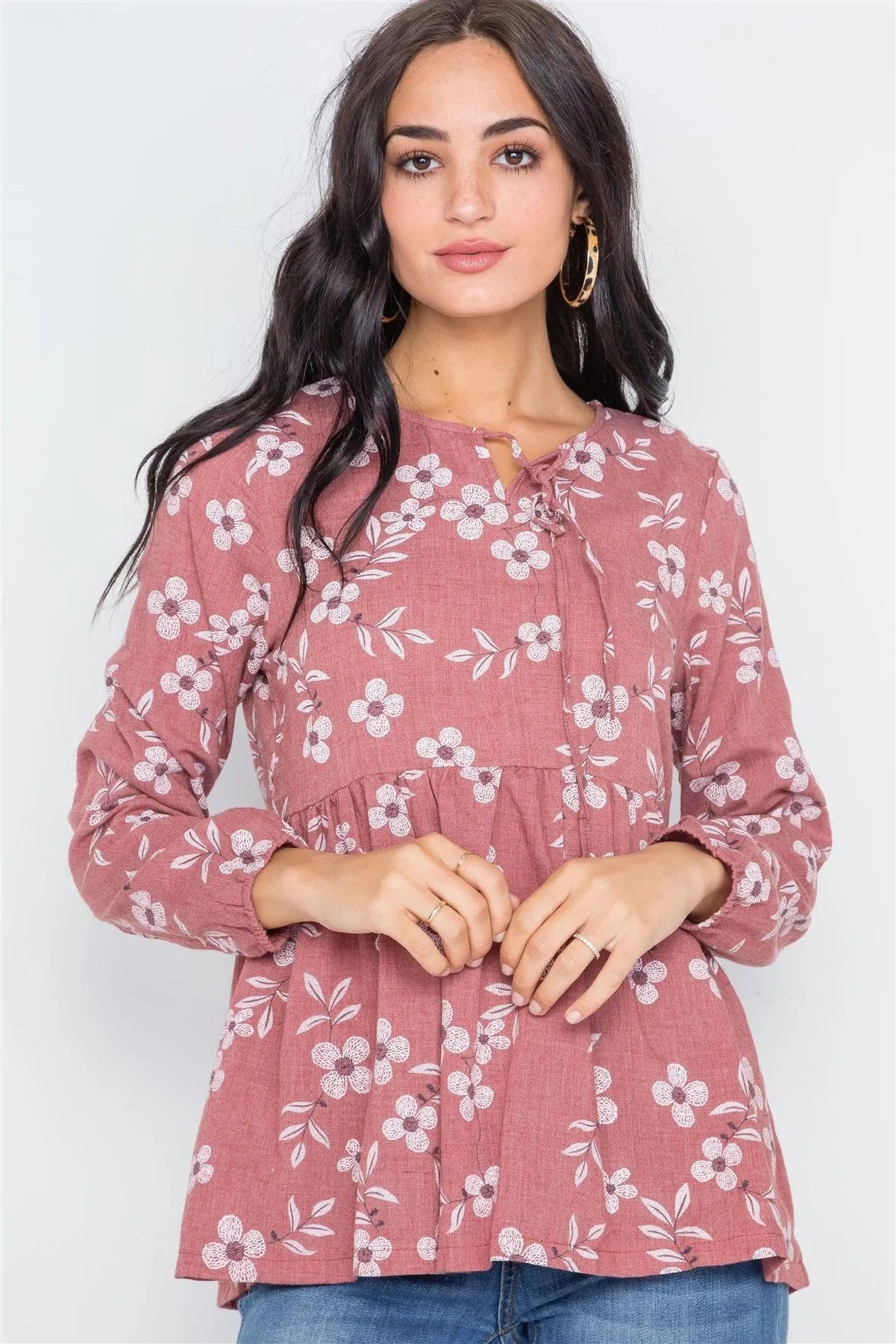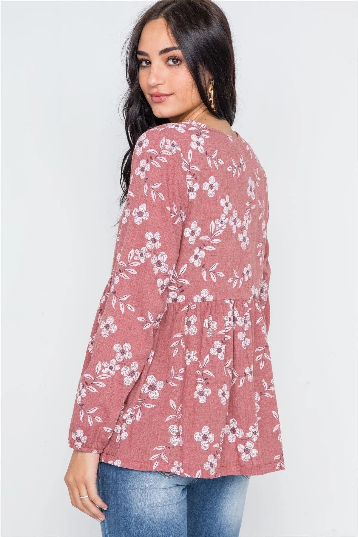Brick Long Sleeve Floral Print Shirred Hem Top /2-2-2