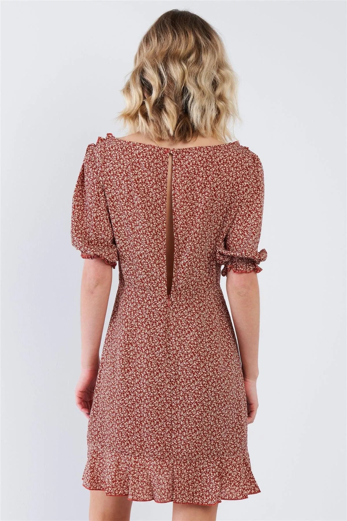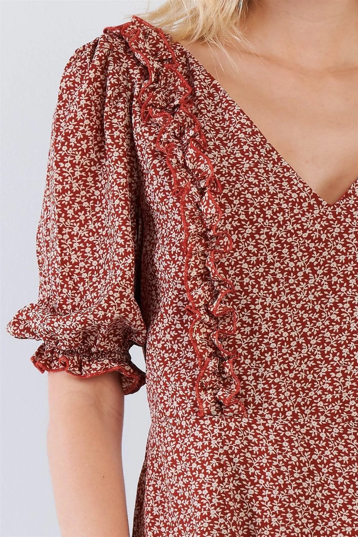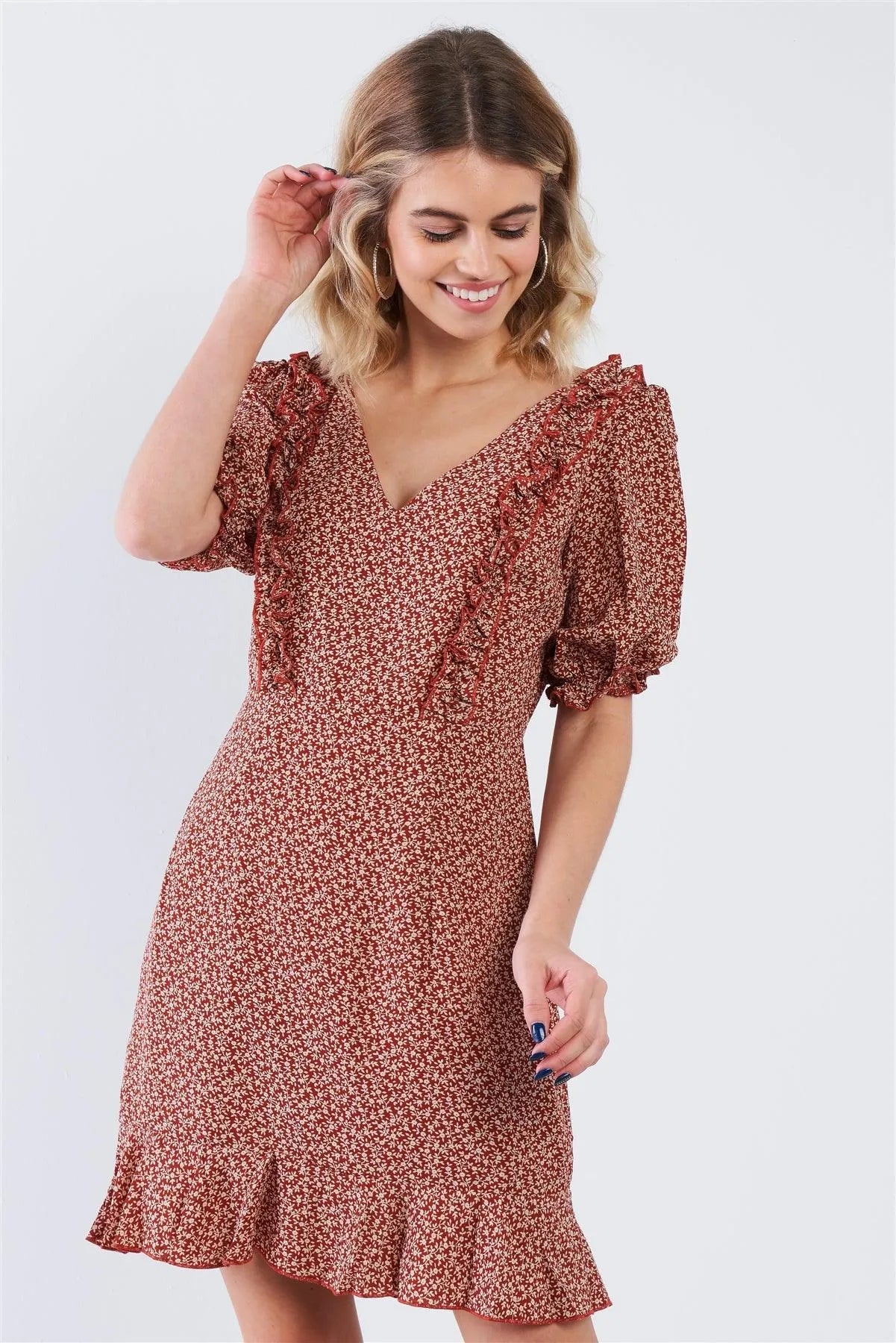 Brick Red Floral Flounce V-Neck Puff Sleeve Mini Boho Dress /3-2-1