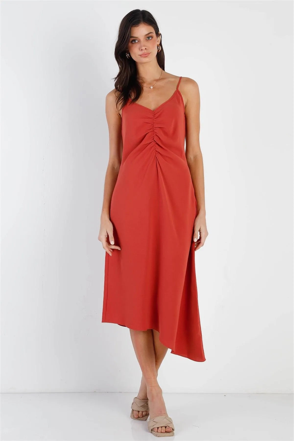 Brick Ruched Front Detail Back Crossover Straps Asymmetric Hem Midi Dress /2-2-2