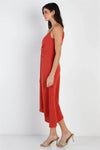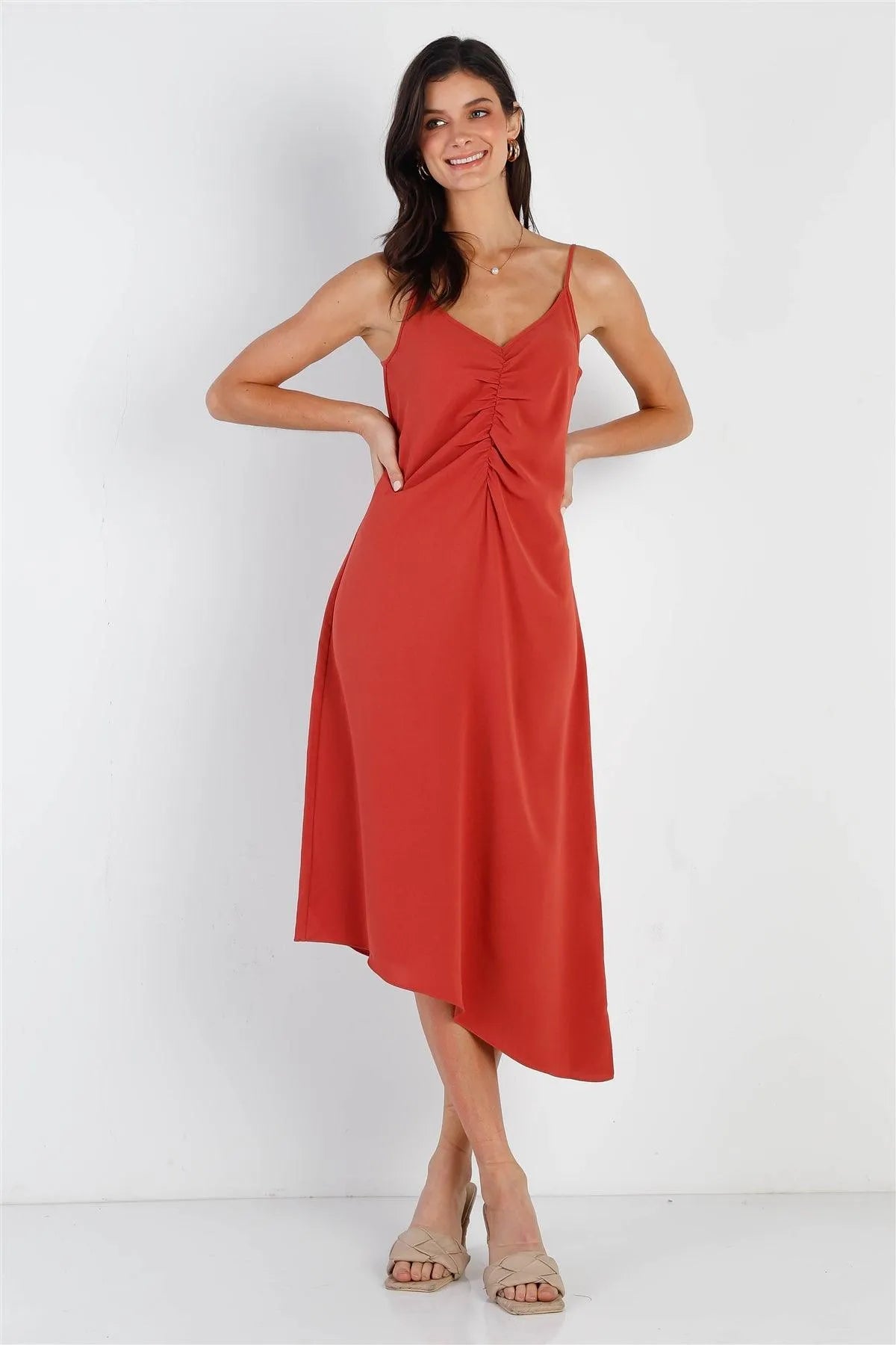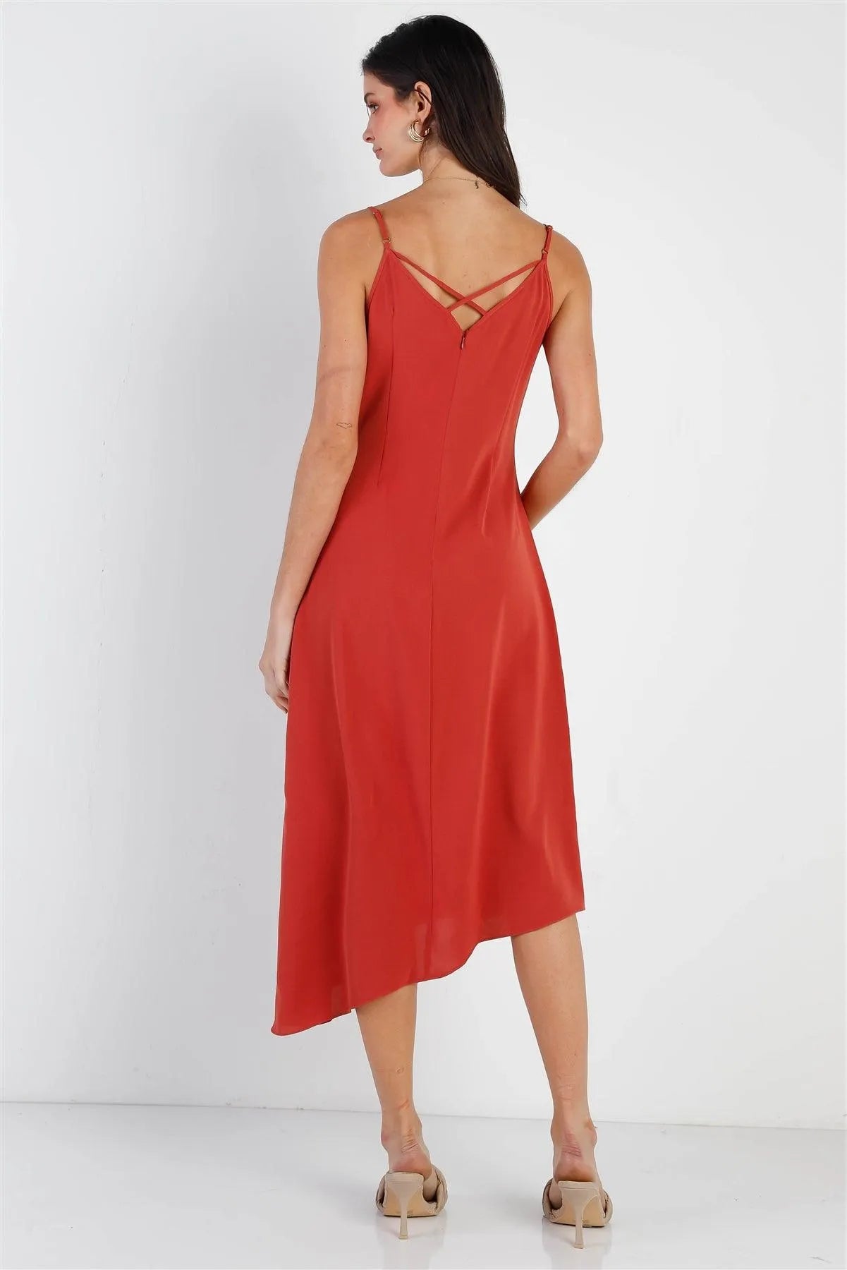 Brick Ruched Front Detail Back Crossover Straps Asymmetric Hem Midi Dress /3-2