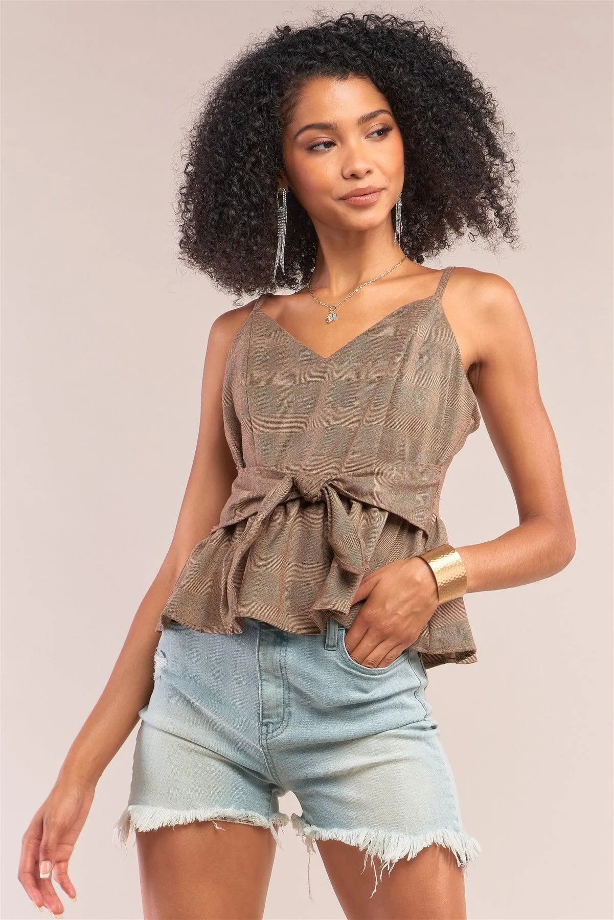 Brown Checkered Print Sleeveless V-Neck Self-Tie Waist Detail Flare Top /1-2-2-1