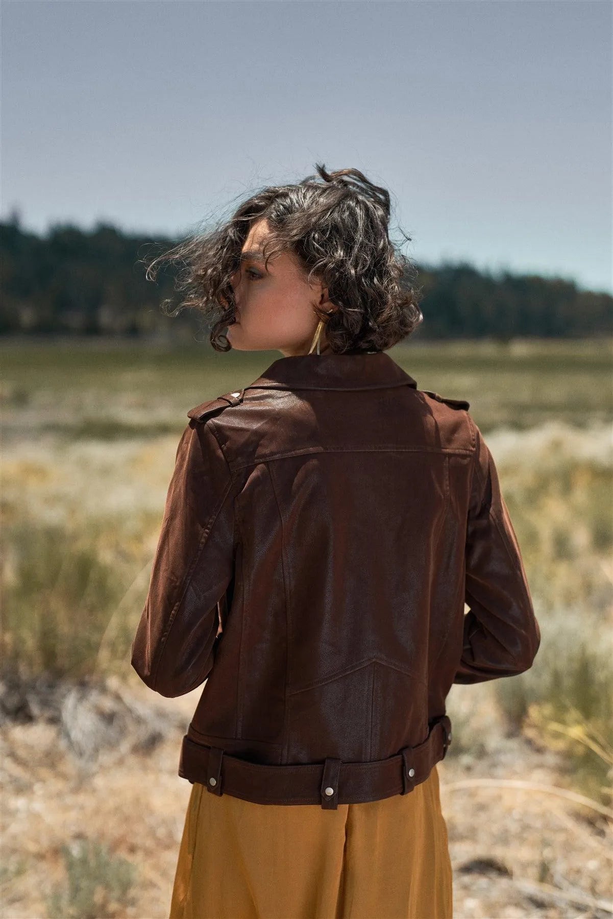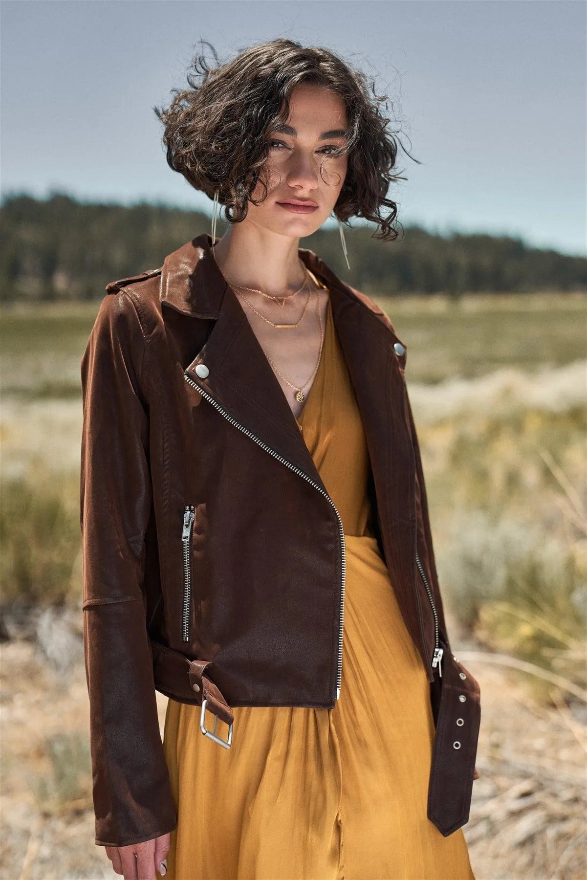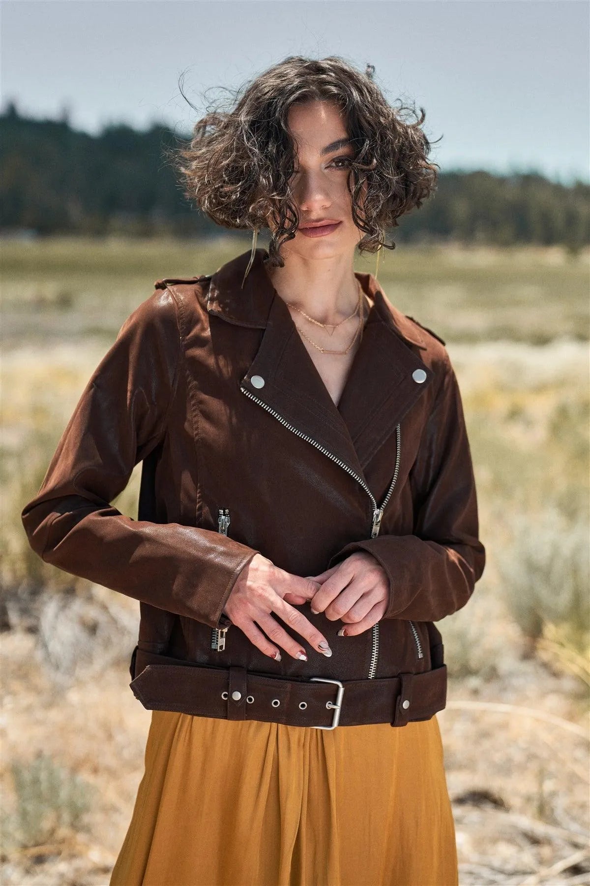 Brown Faux Suede Edgy Belted Hem Biker Jacket