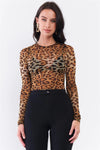 Brown Leopard Print Sheer Mesh Crew Neck Long Sleeve Bodysuit /3-2-1