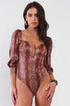 Brown Python Print Eco Leather Sweetheart Neckline Balloon Sleeve Bodysuit /3-2-1
