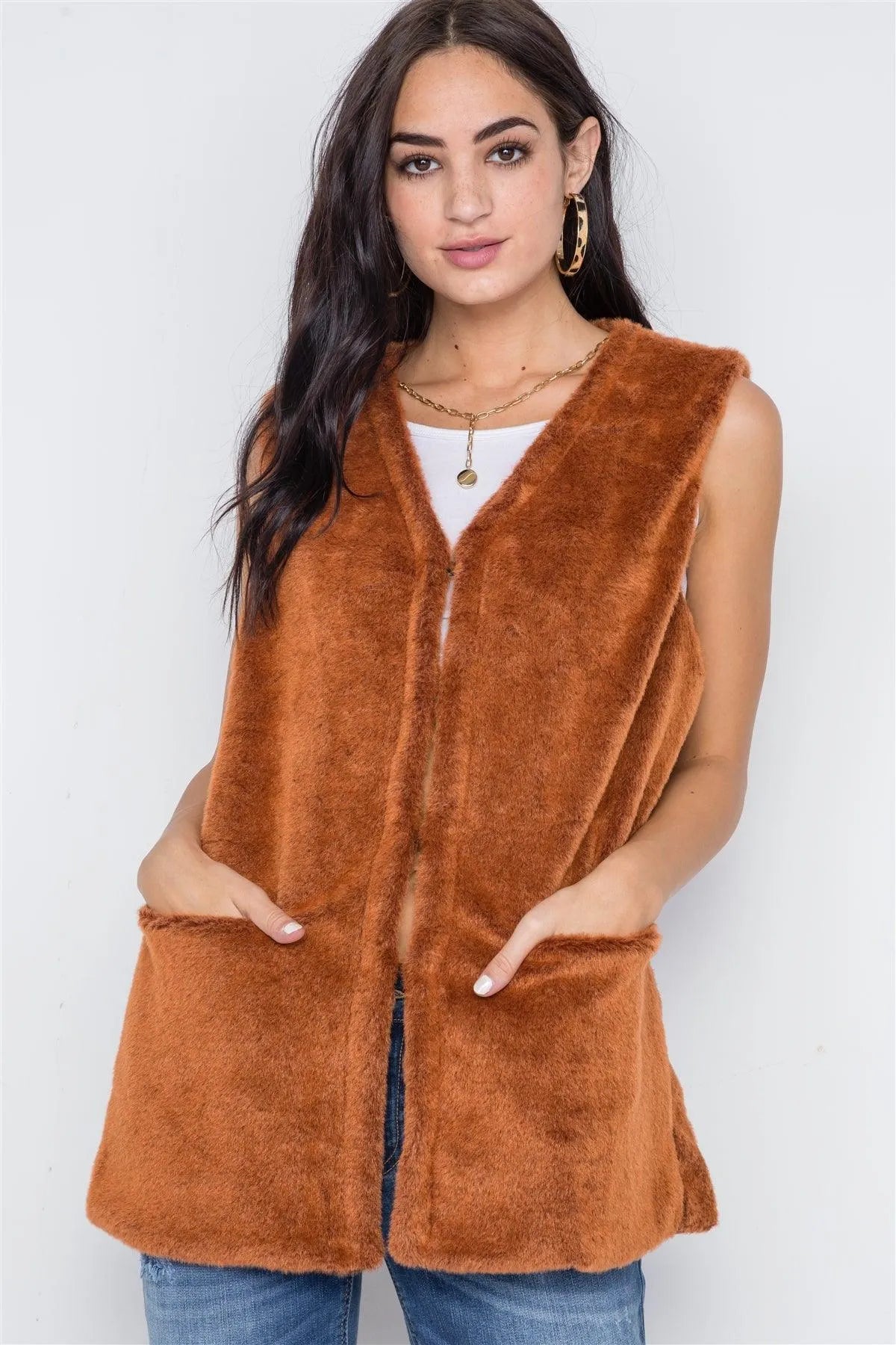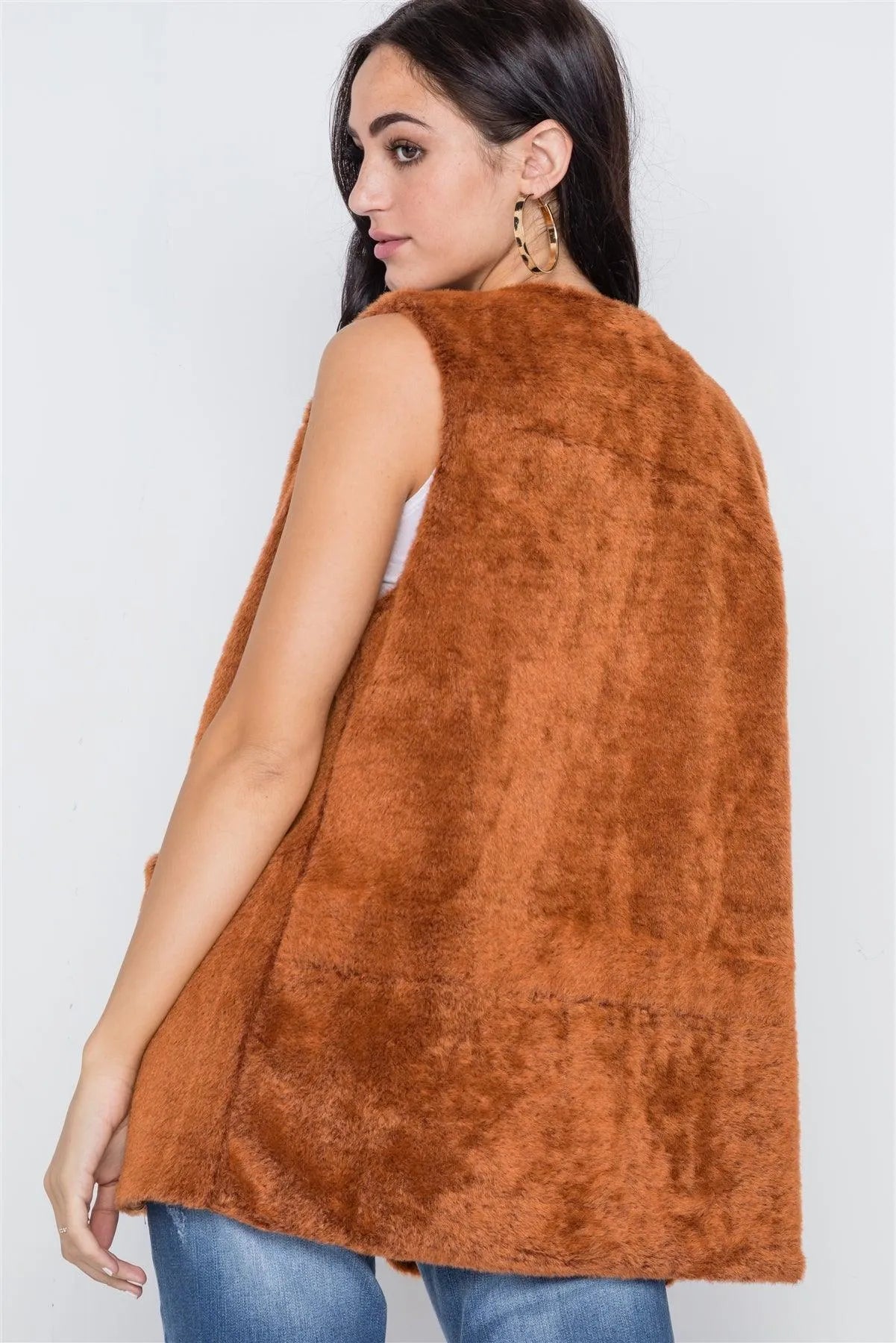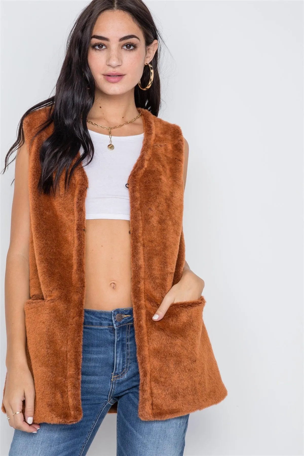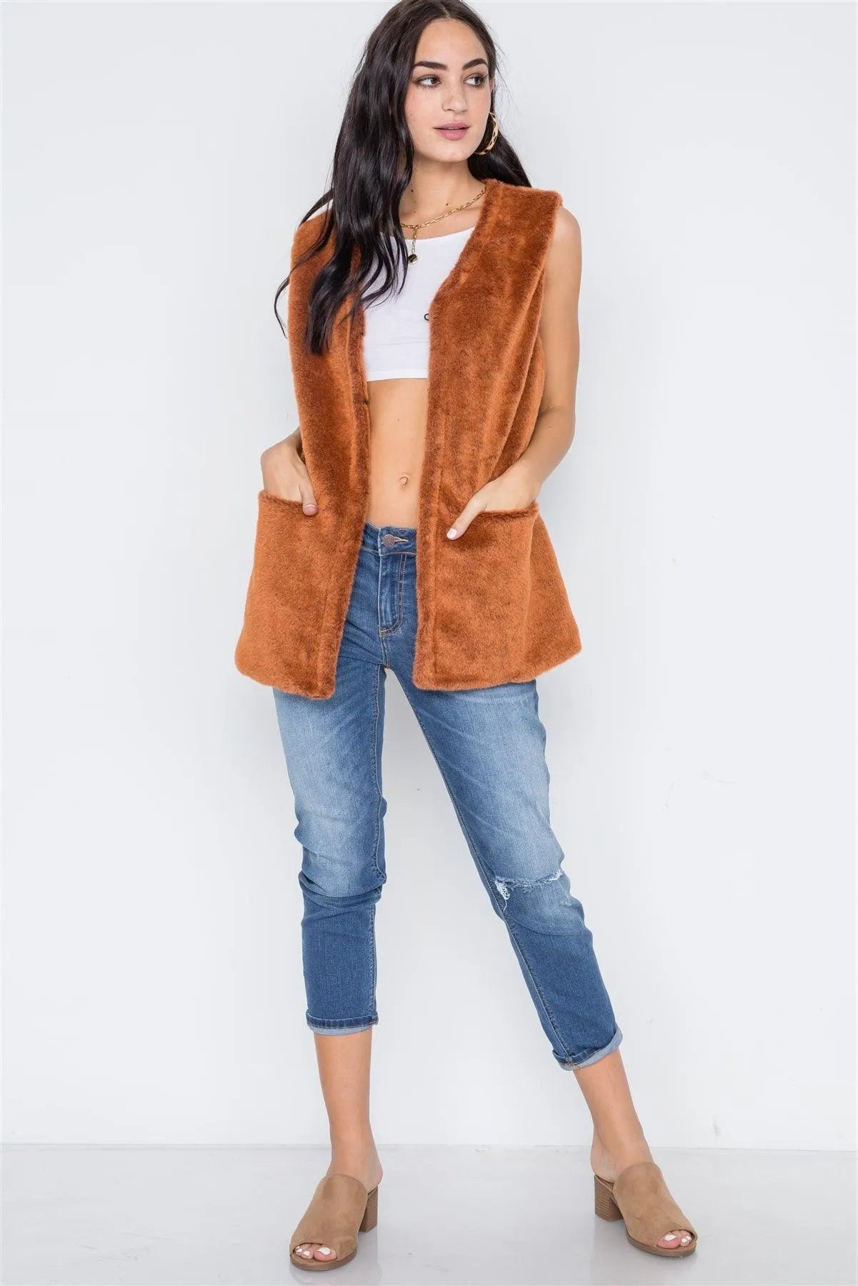 Women vest: burgundy, sleeveless, open front, faux fur pockets and shawl collar, boho style warm and cozy.