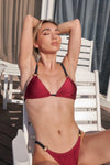 🖤 Item Features: Burgundy & black, solid, black straps, triangle shape, non-adjustable straps, open back, mid-rise bottom with gold rings detail, lined, stretchy, festival wear, sexy, hot