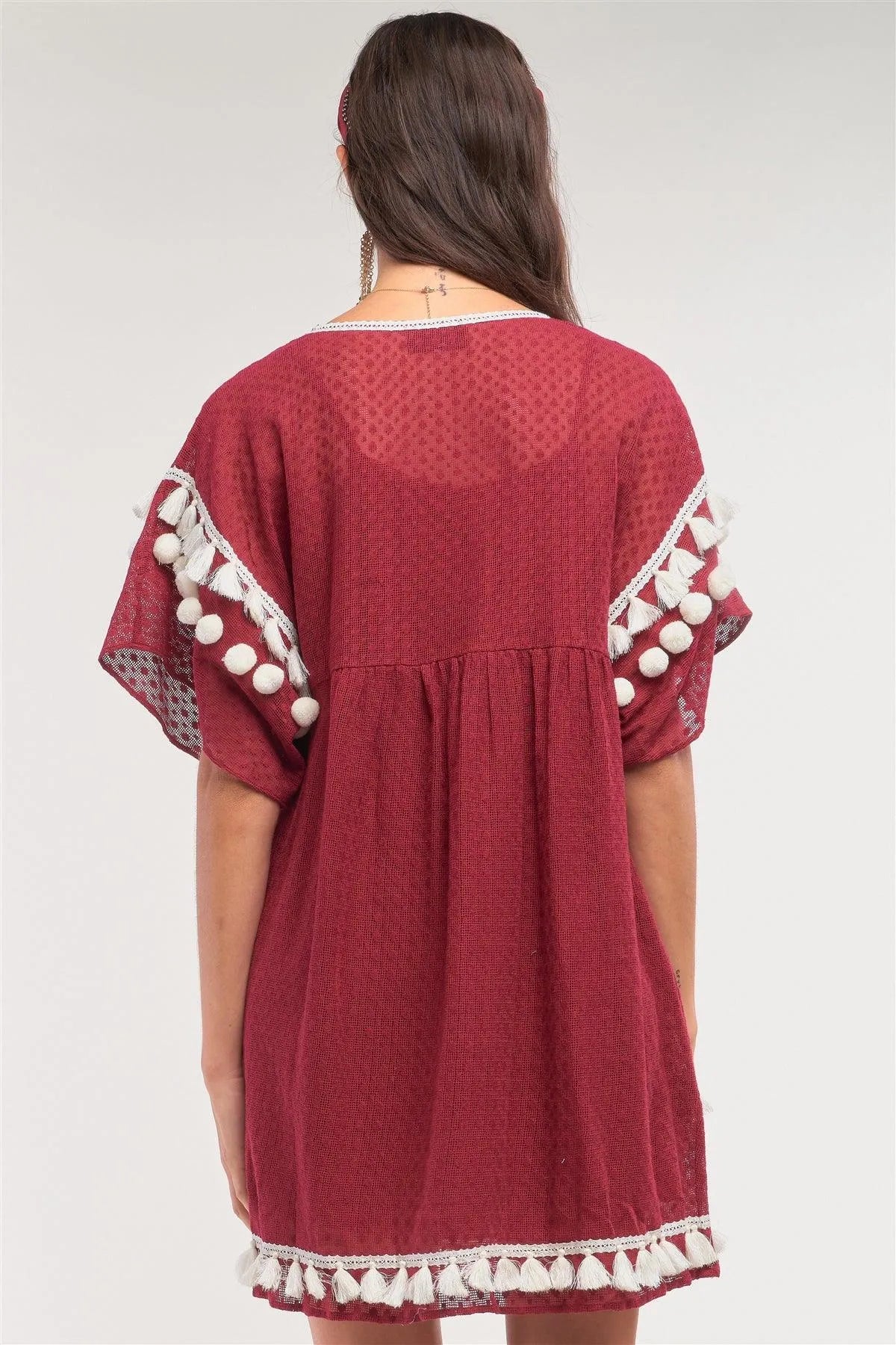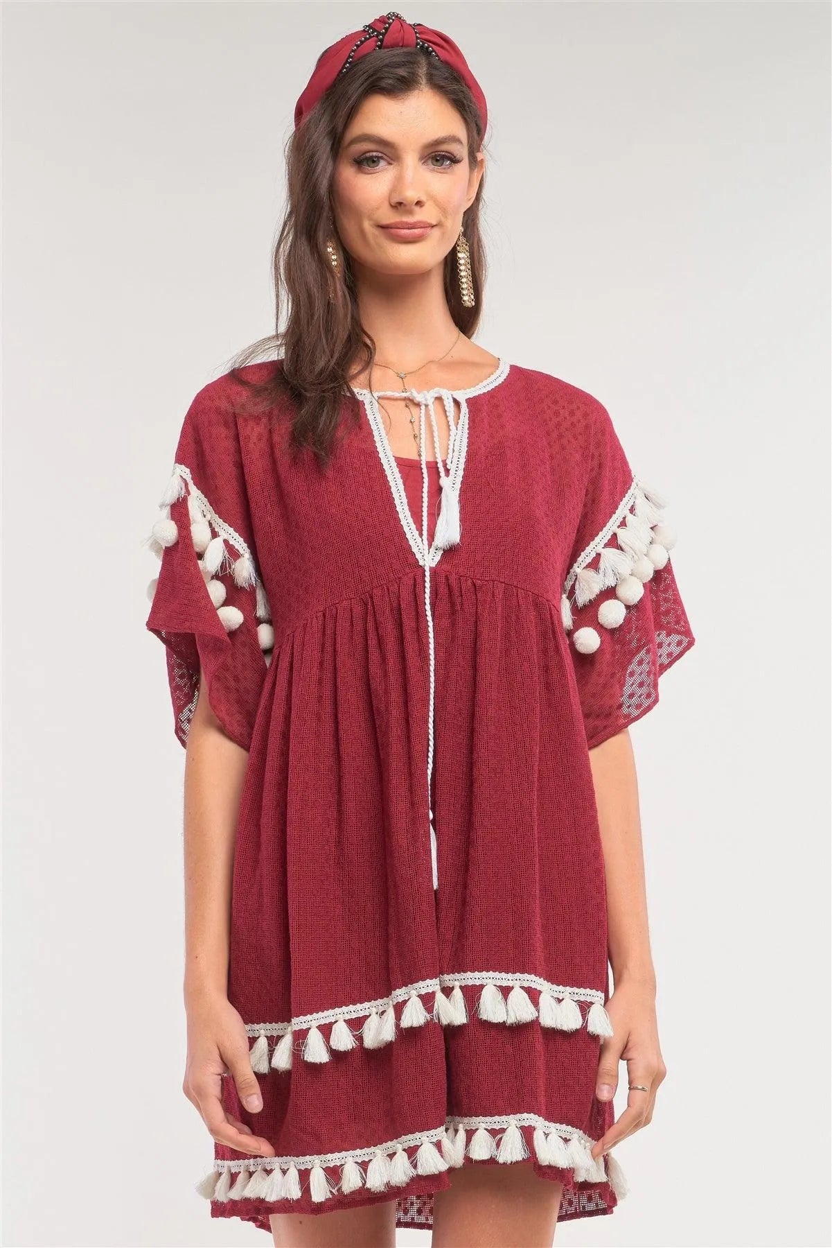 🖤 Item Features: Burgundy and white, contrast crochet mesh, pompoms and tassel tips trim, short wide sleeve, asymmetrical neckline with front mini rope self tie strings with tassel tips, loose fitting, lined, mini length, casual, summery, boho, festival wear, stylish, trendy, all new spring/summer collection