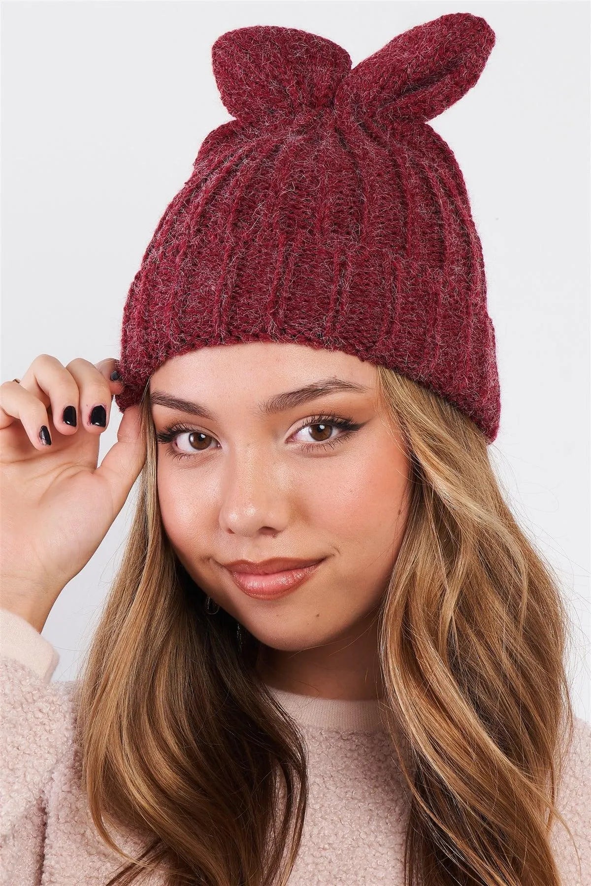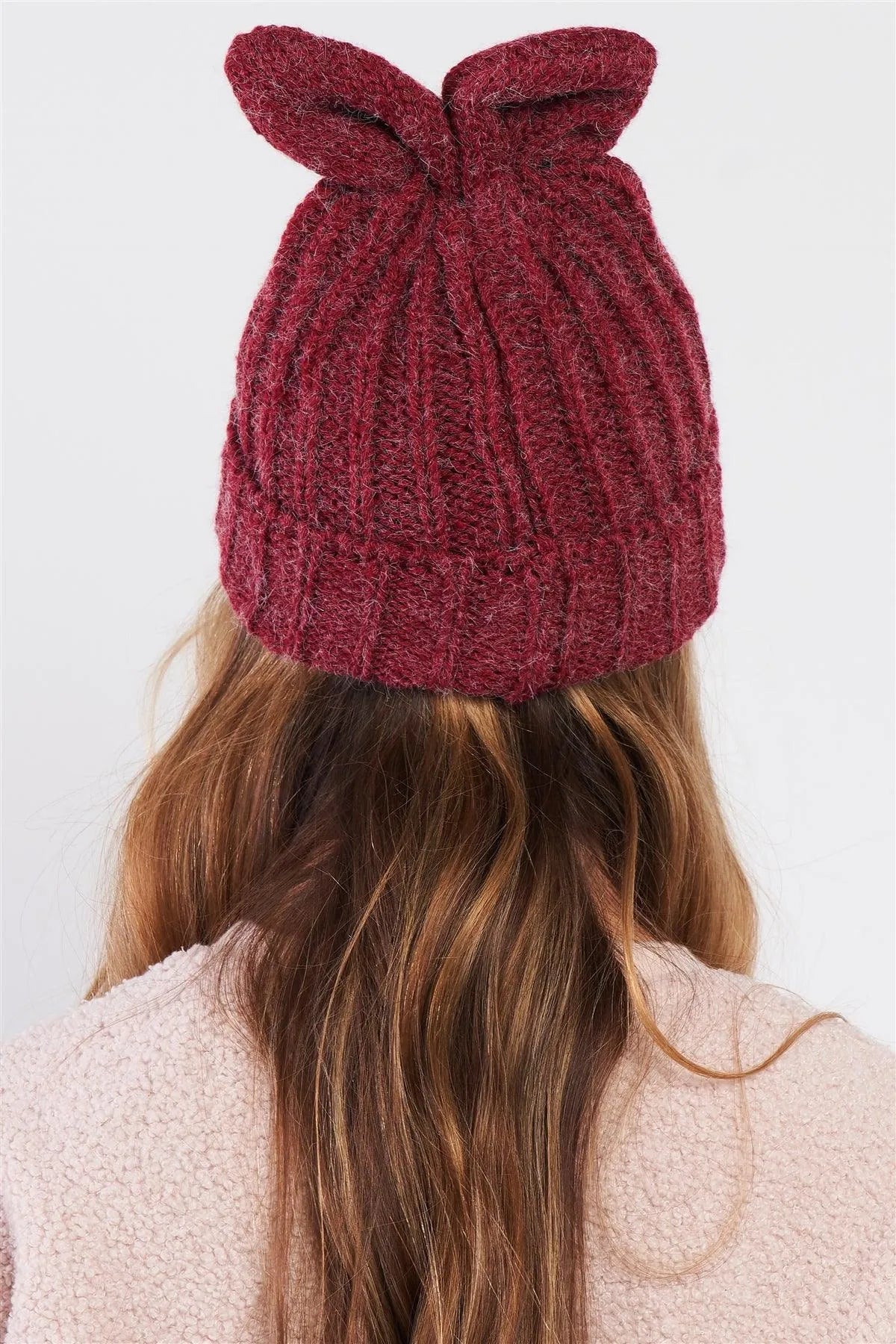 Burgundy Bunny Ears Detail Woven Winter Beanie /3 Pieces
