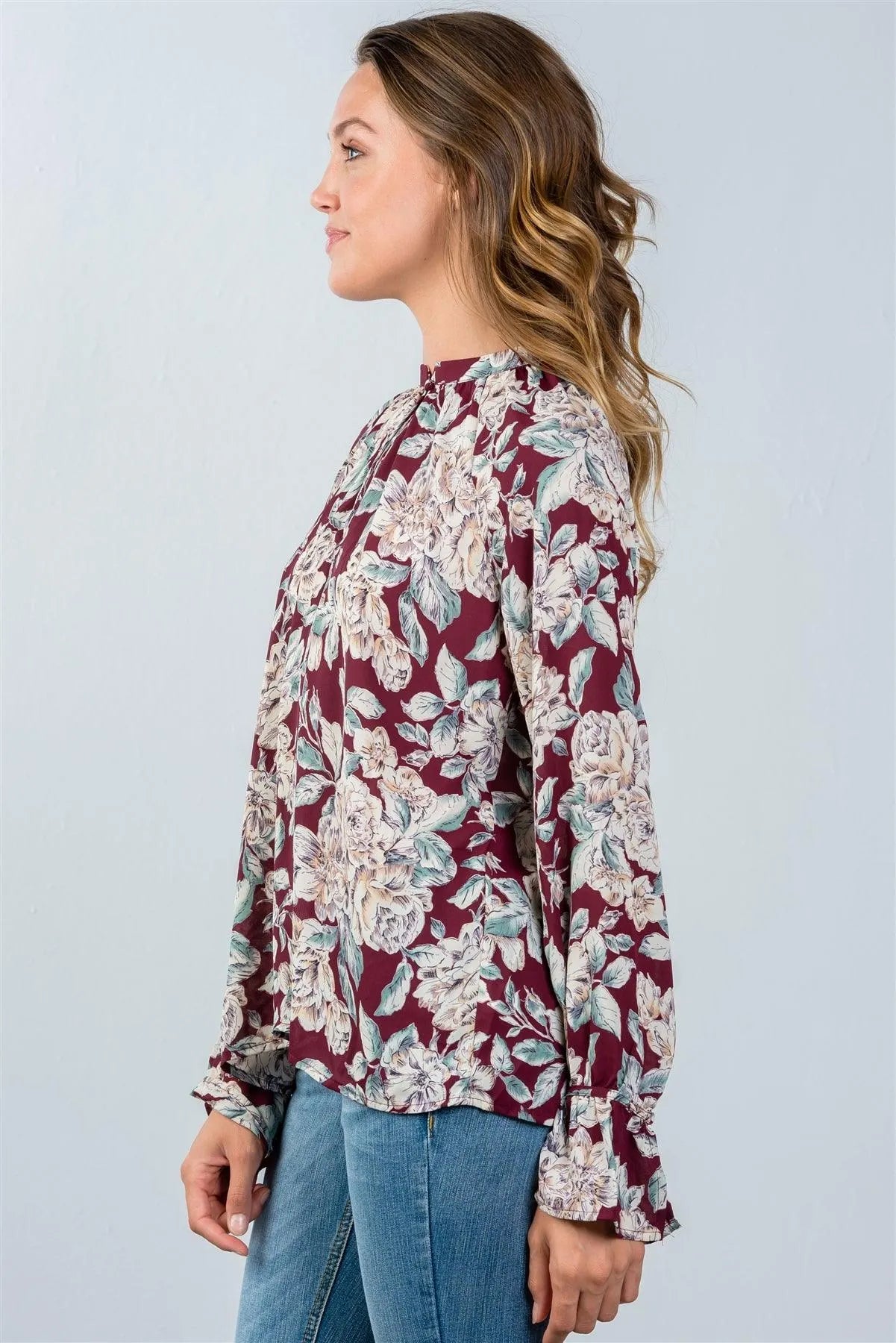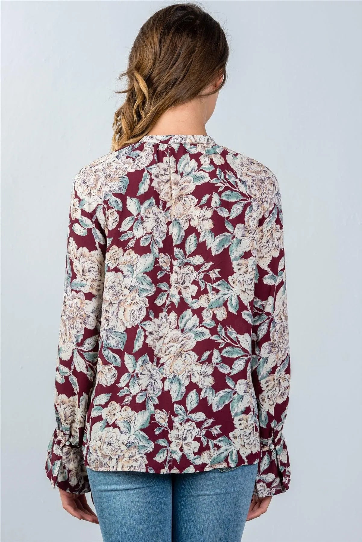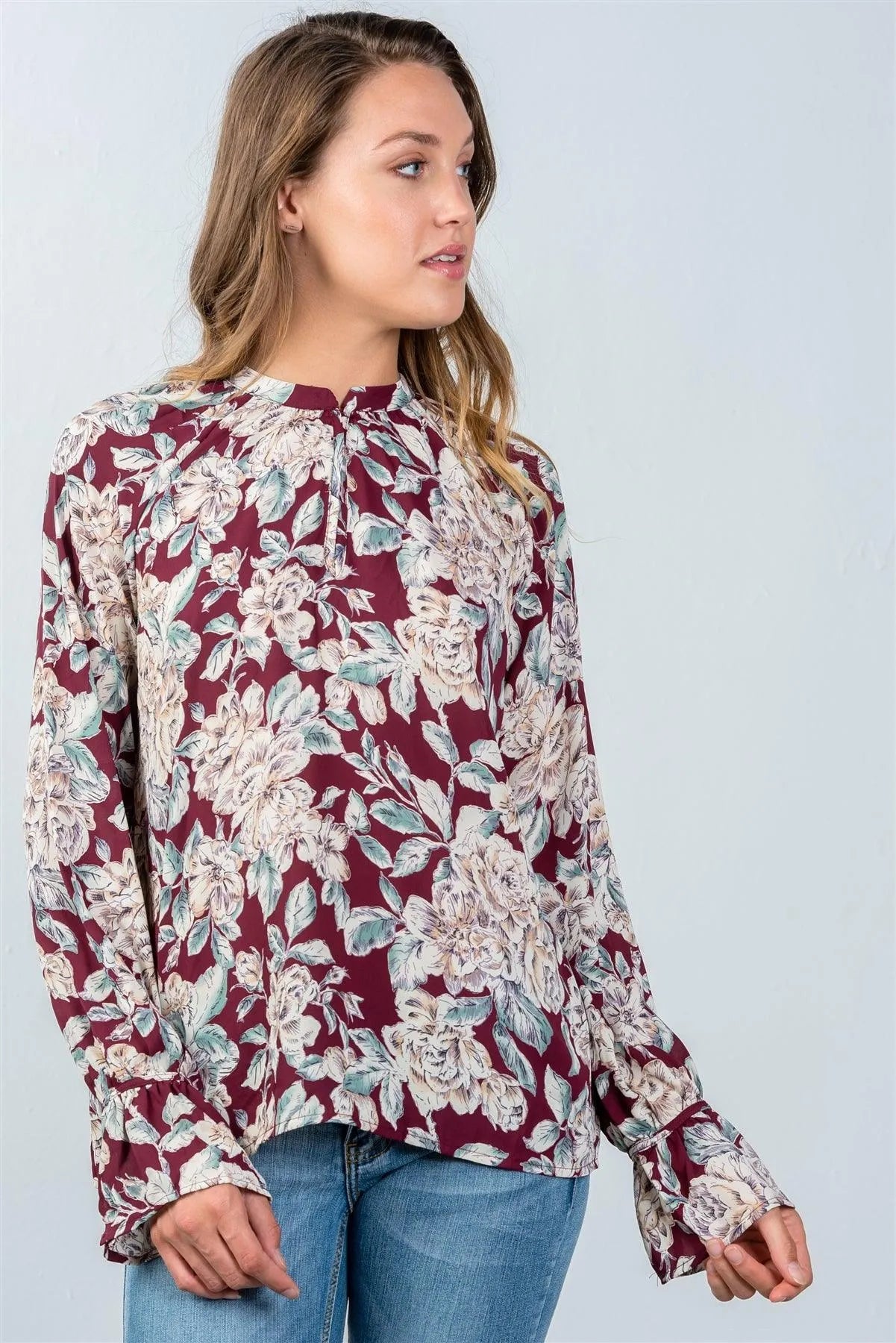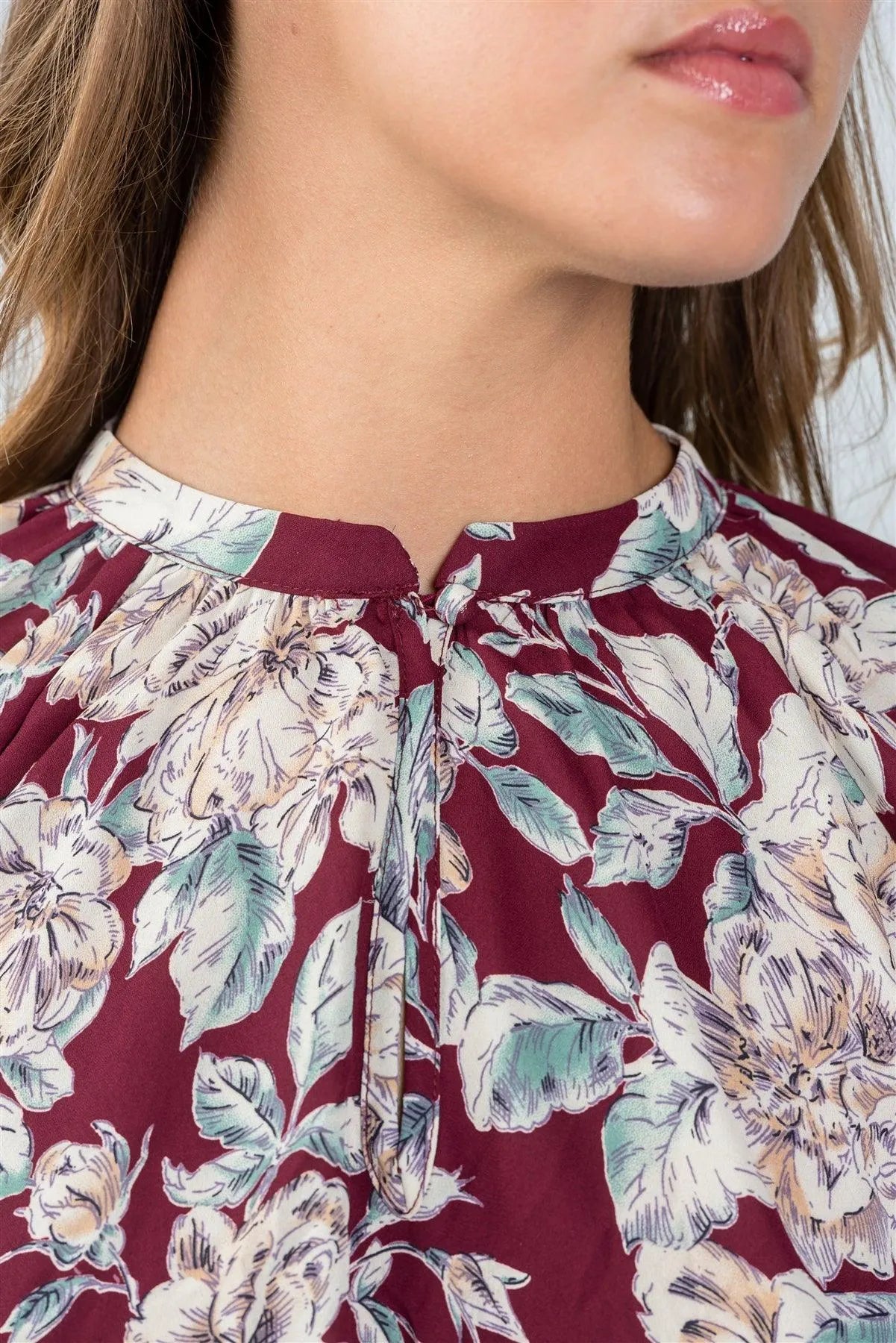 Burgundy Floral Print Front Keyhole Top / 2-2-2