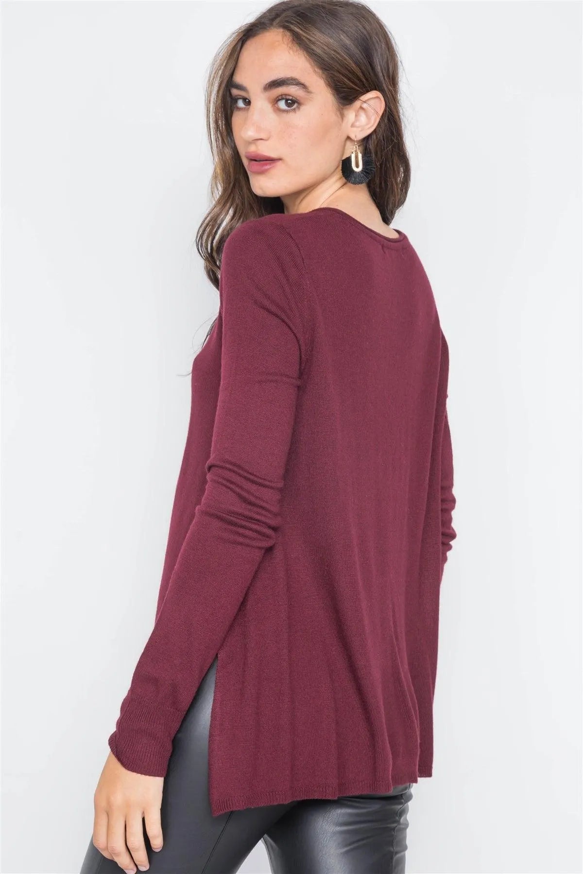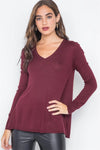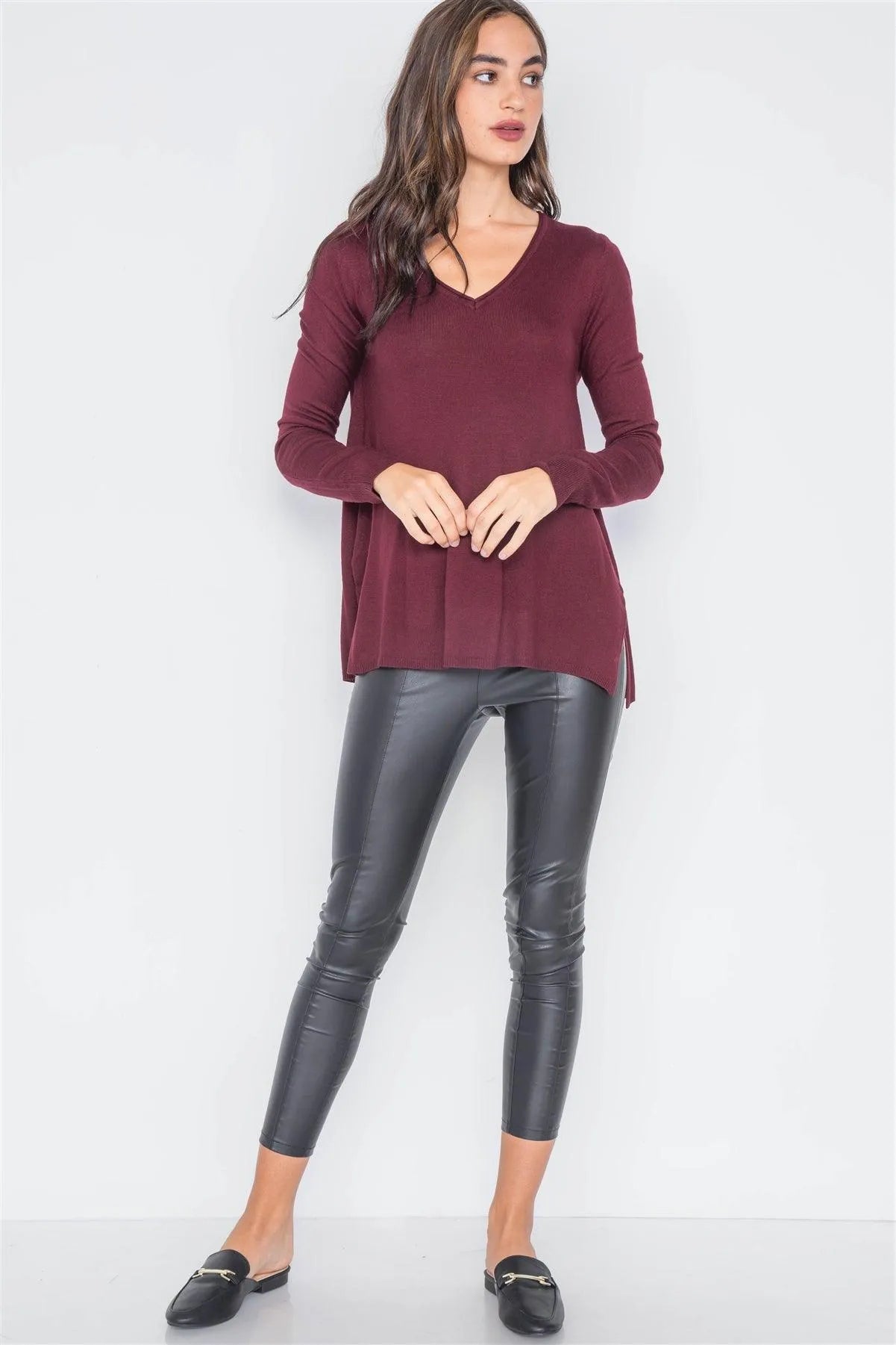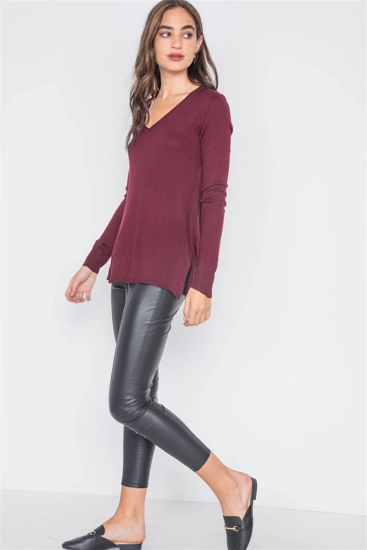 Women top: Sweater features: long sleeves, ribbed hem and cuffs, raw-cut v-neck, side slits, loose, casual look for every day.