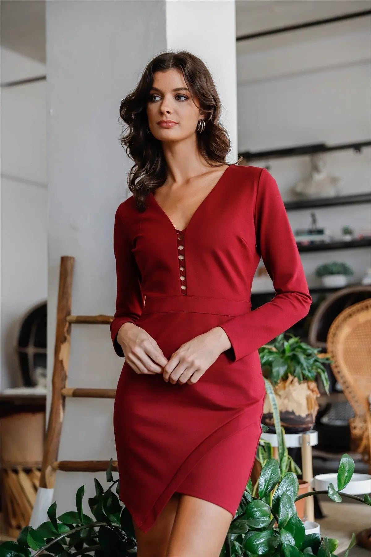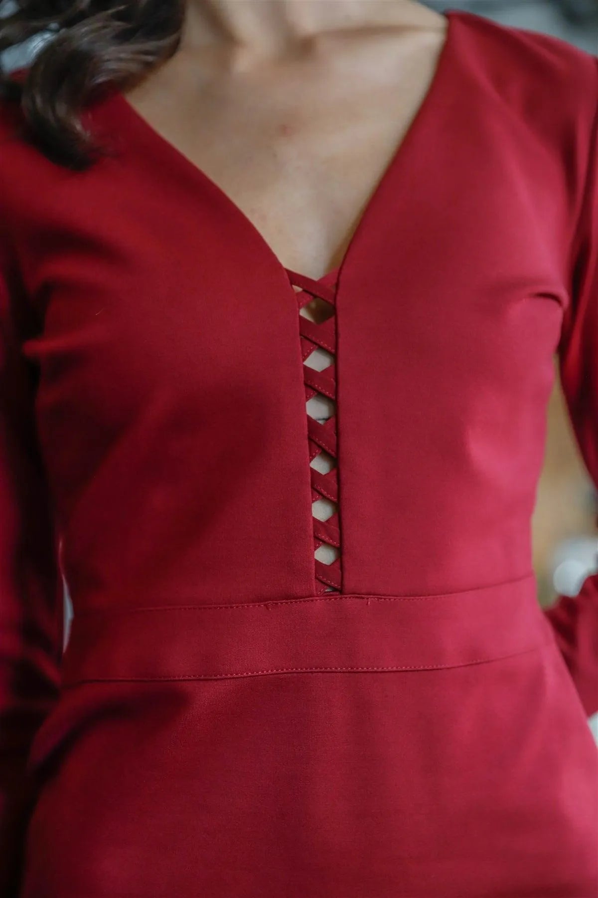 🖤 Item features: Burgundy, solid color, lace up cut out front bust details, v-neckline, asymmetrical hem, stitch waistband details, mini length, slim fit, long sleeves, partially lined, semi-stretchy, elegant, chic, trendy, business look