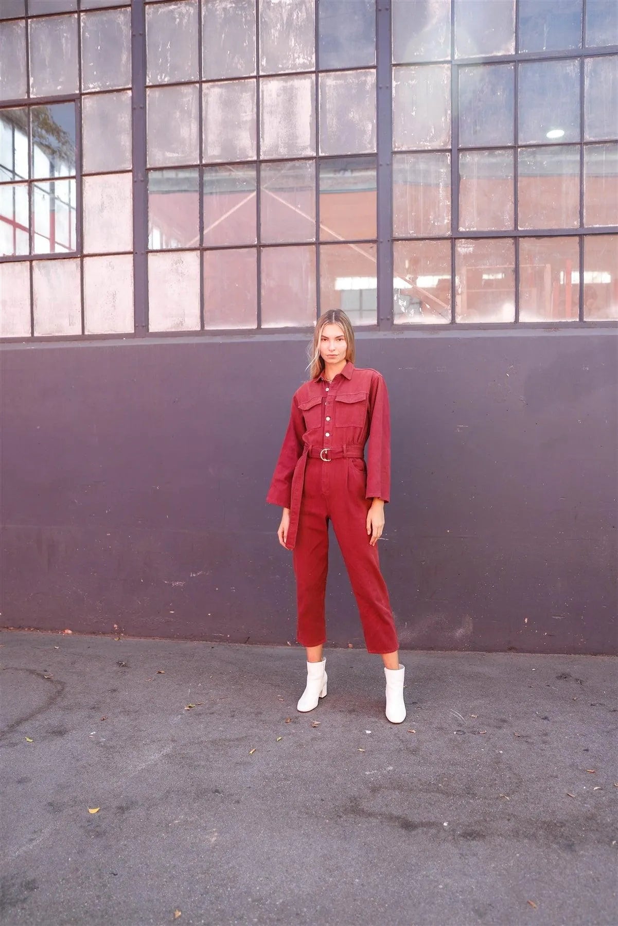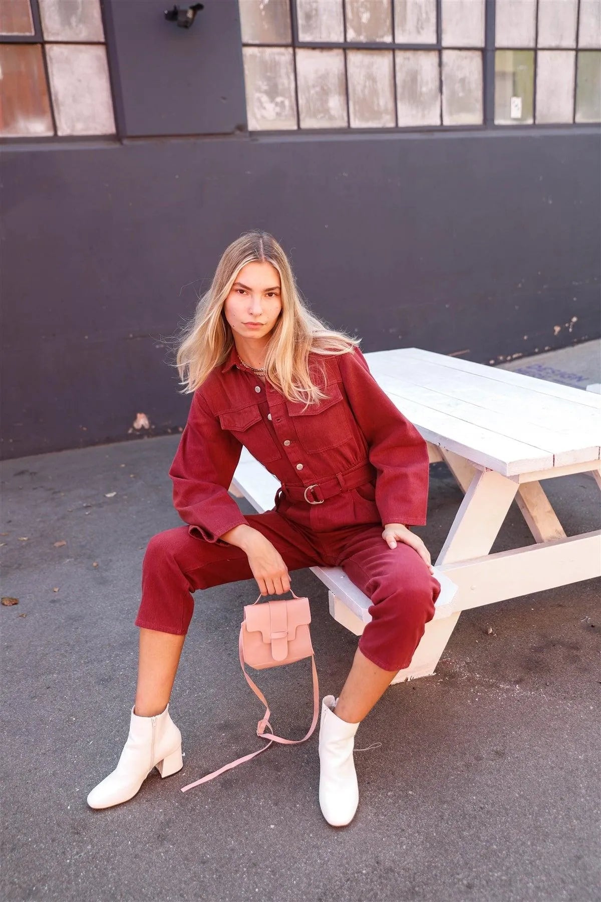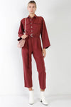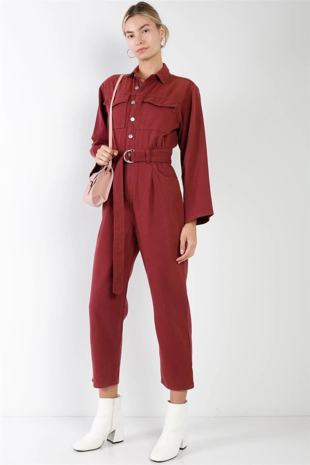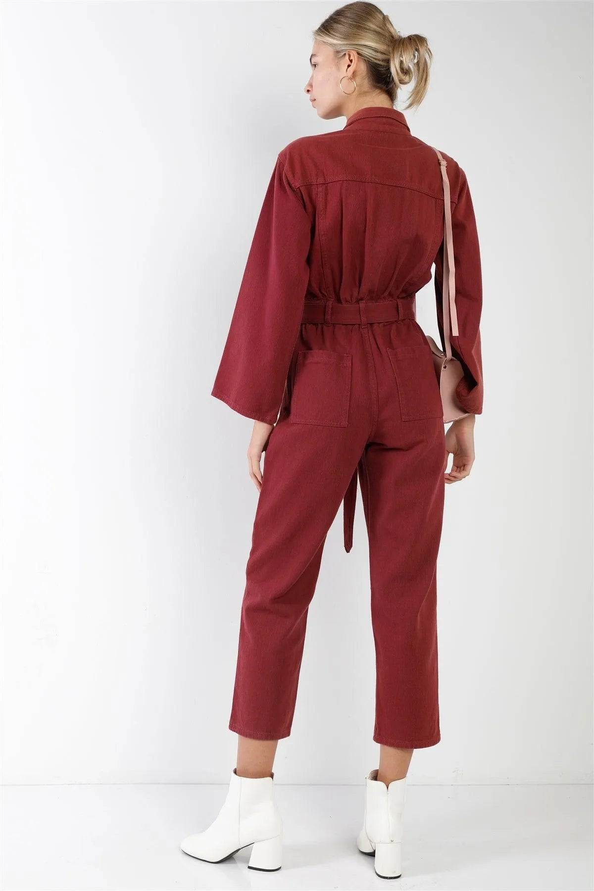 Burgundy Long Sleeve Denim Utility Front Button Down Self-Tie Belted Jumpsuit /3-1-1