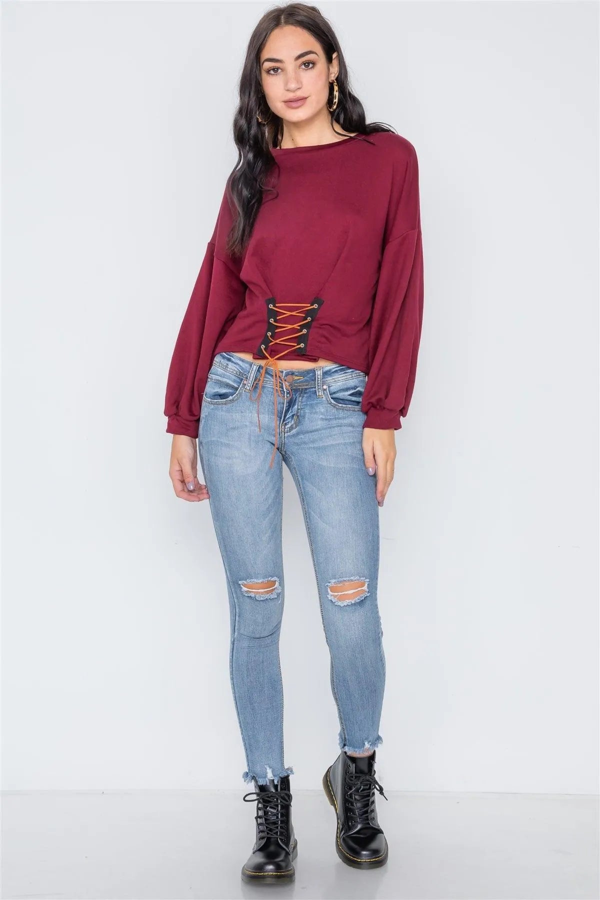 Burgundy Long Sleeve Lace Up Sweater /2-2-2
