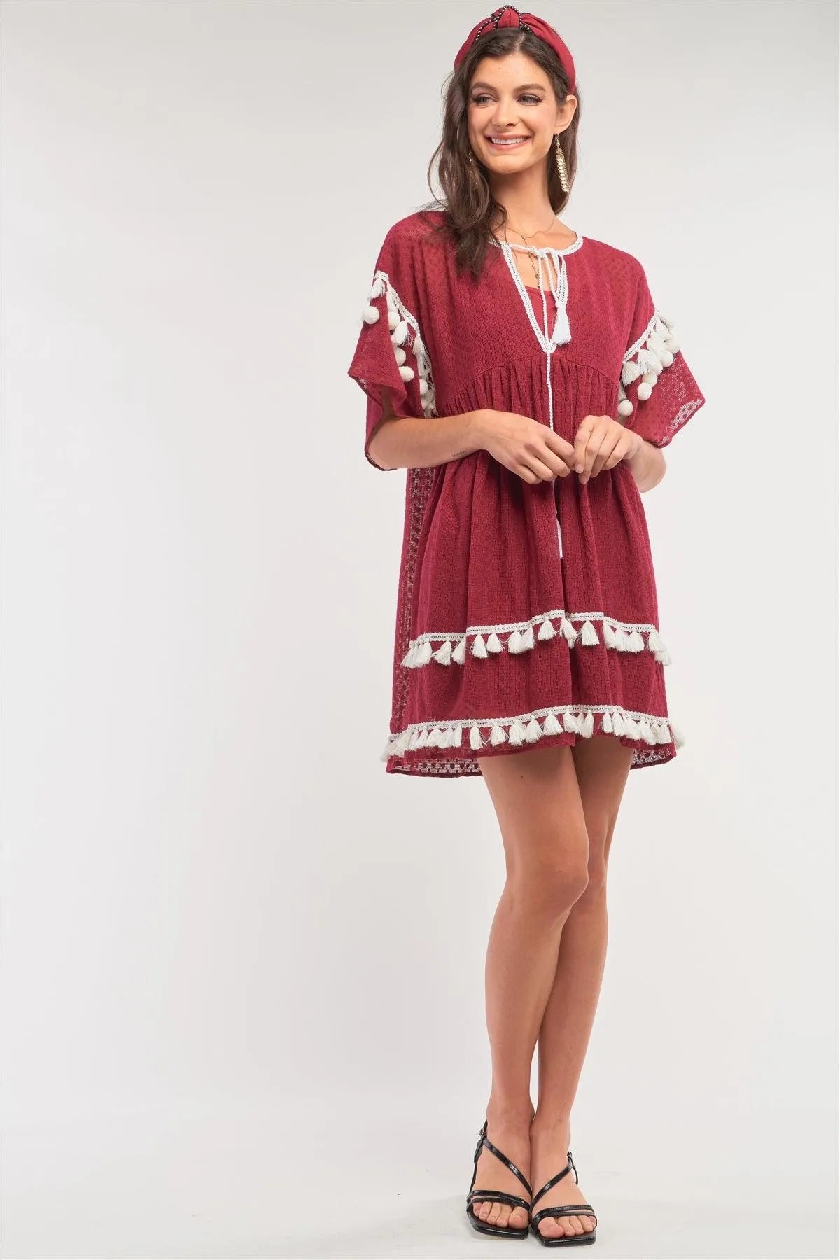 🖤 Item Features: Burgundy and white, contrast crochet mesh, pompoms and tassel tips trim, short wide sleeve, asymmetrical neckline with front mini rope self tie strings with tassel tips, loose fitting, lined, mini length, casual, summery, boho, festival wear, stylish, trendy, all new spring/summer collection
