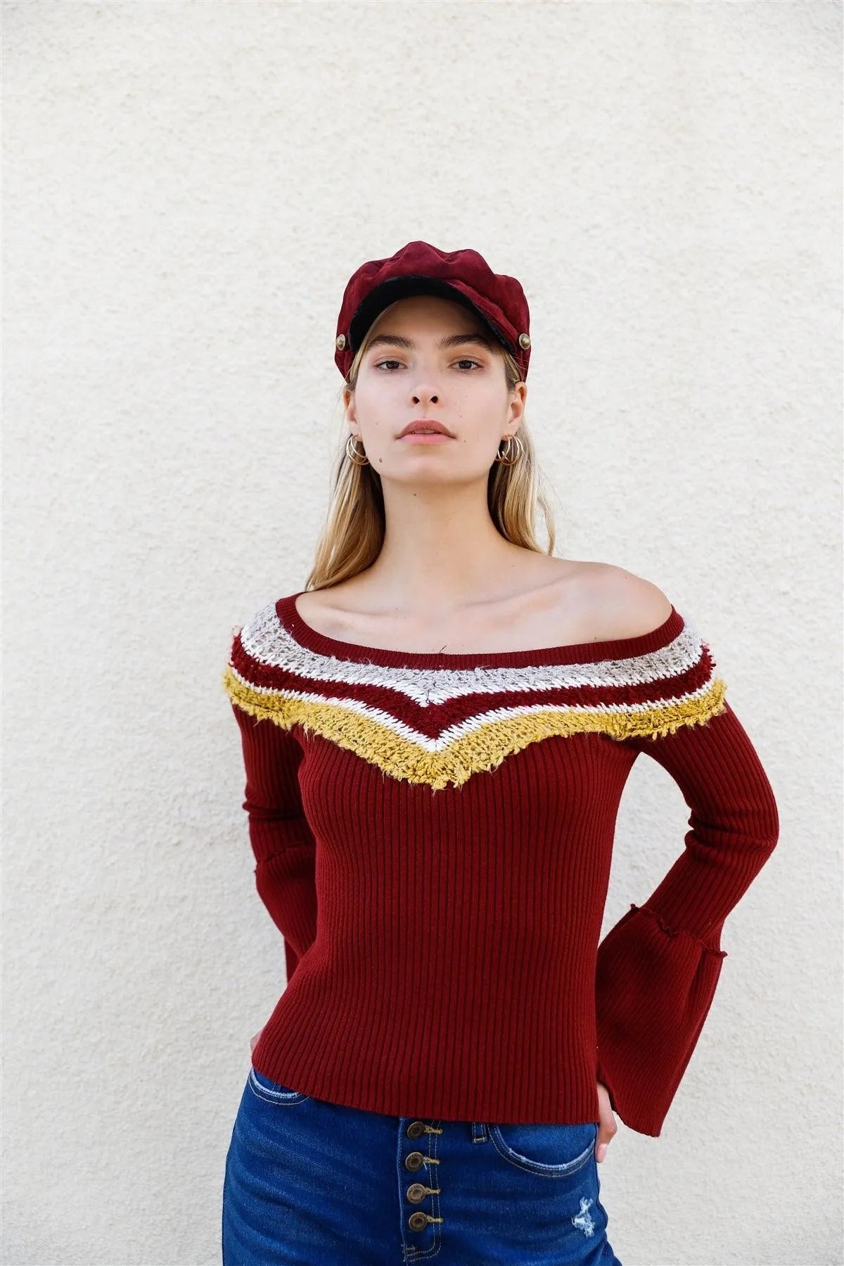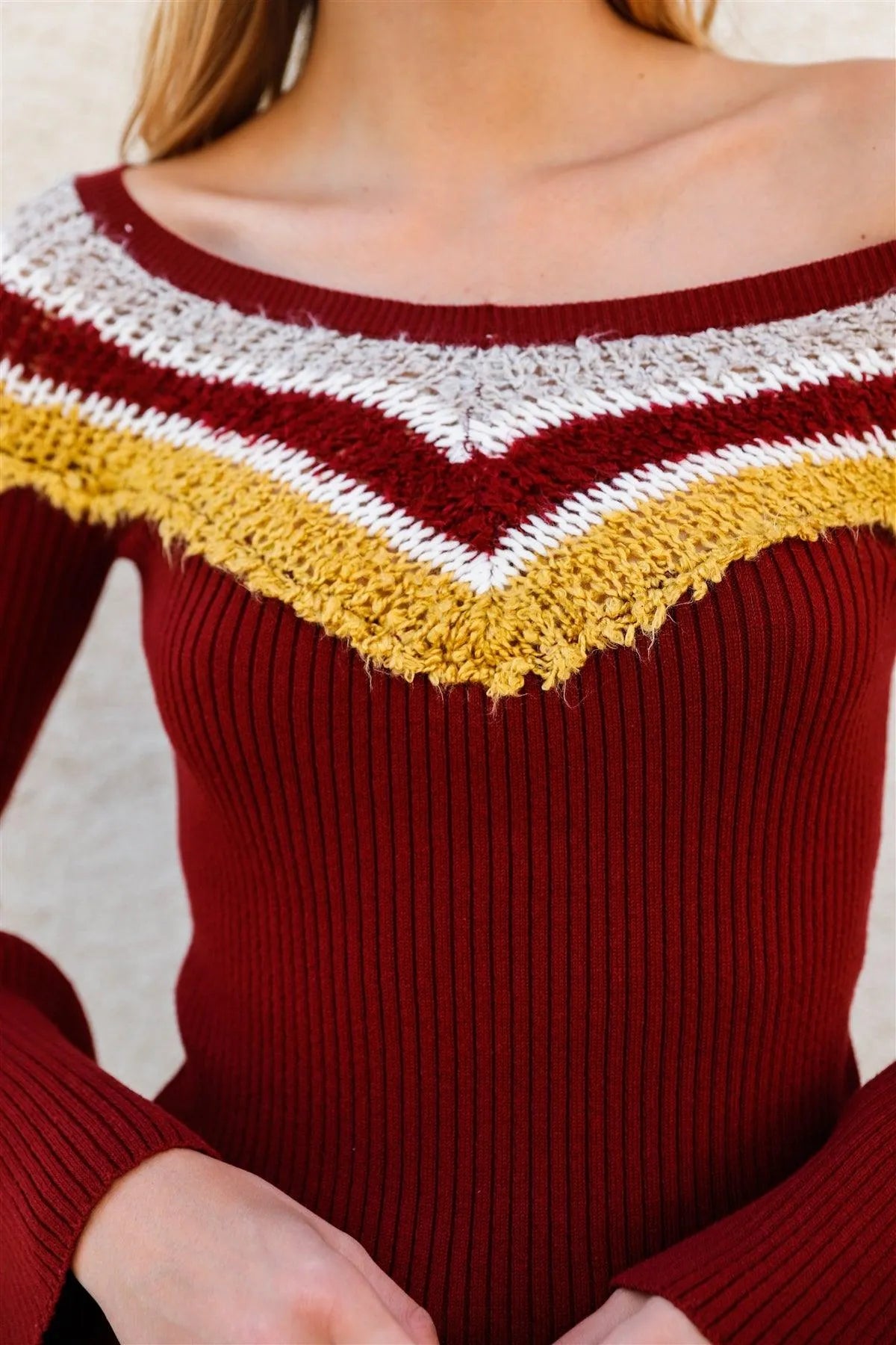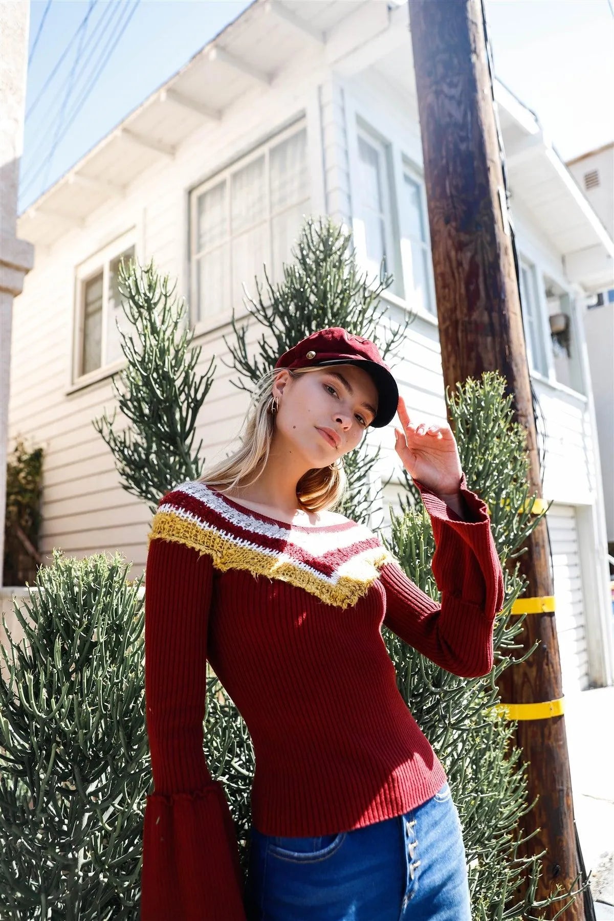 Burgundy Multi Stripe Knit Bell Sleeve Sweater /2-2-2