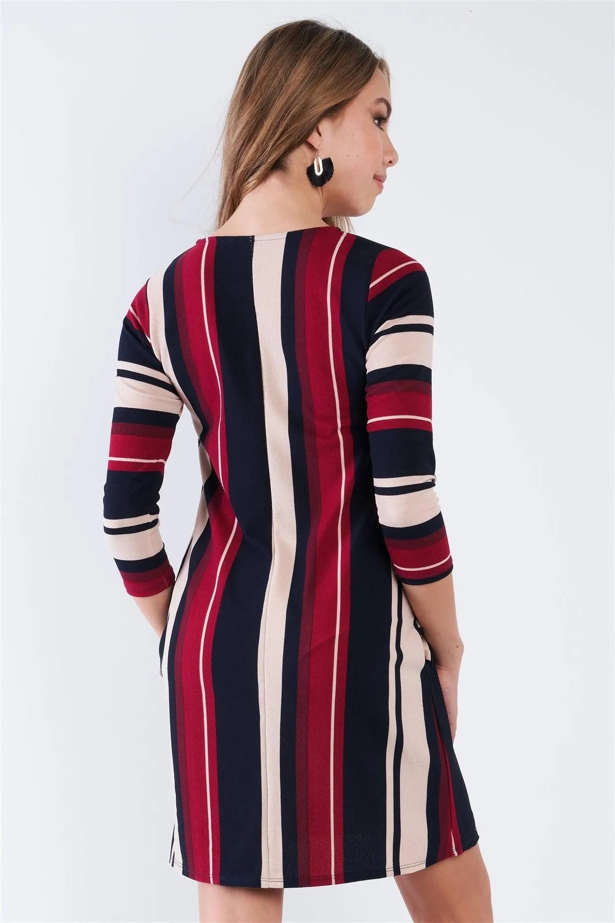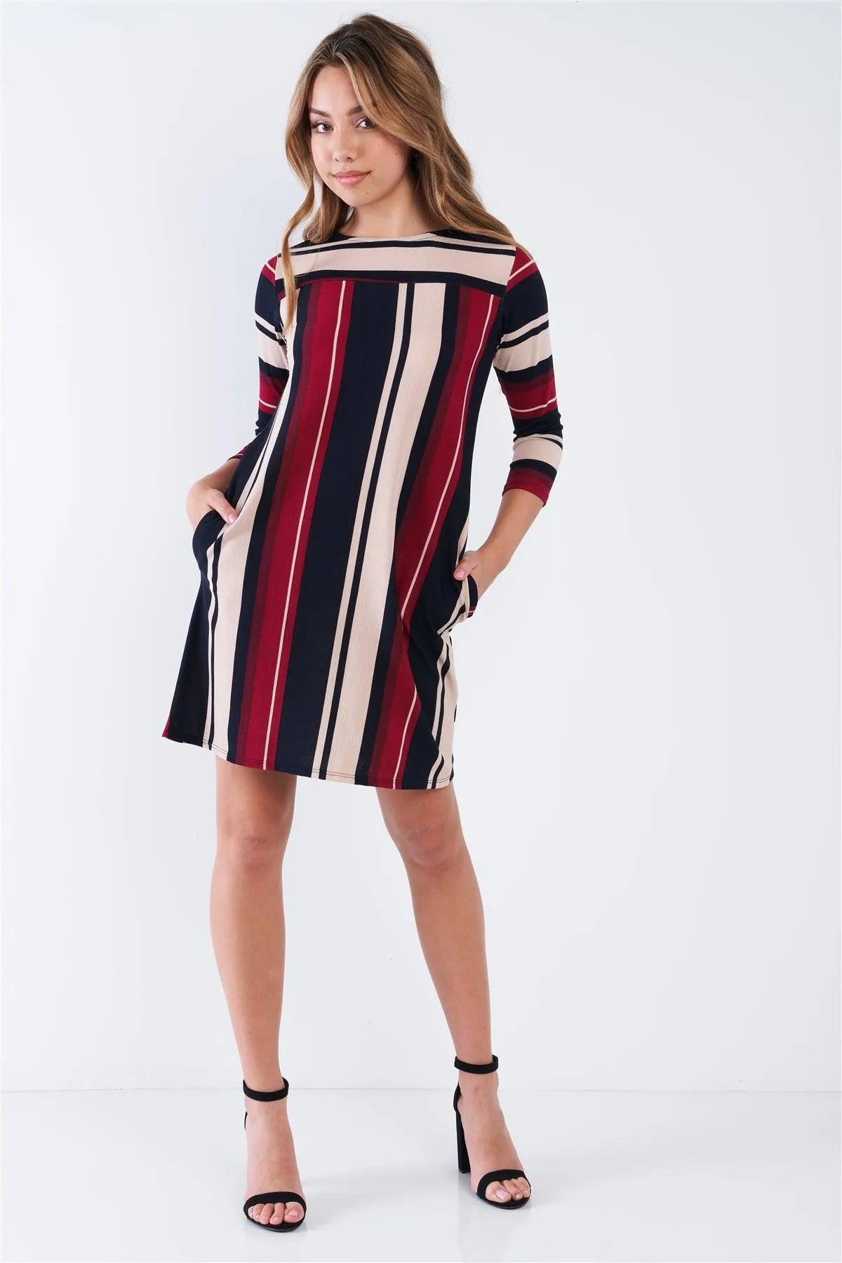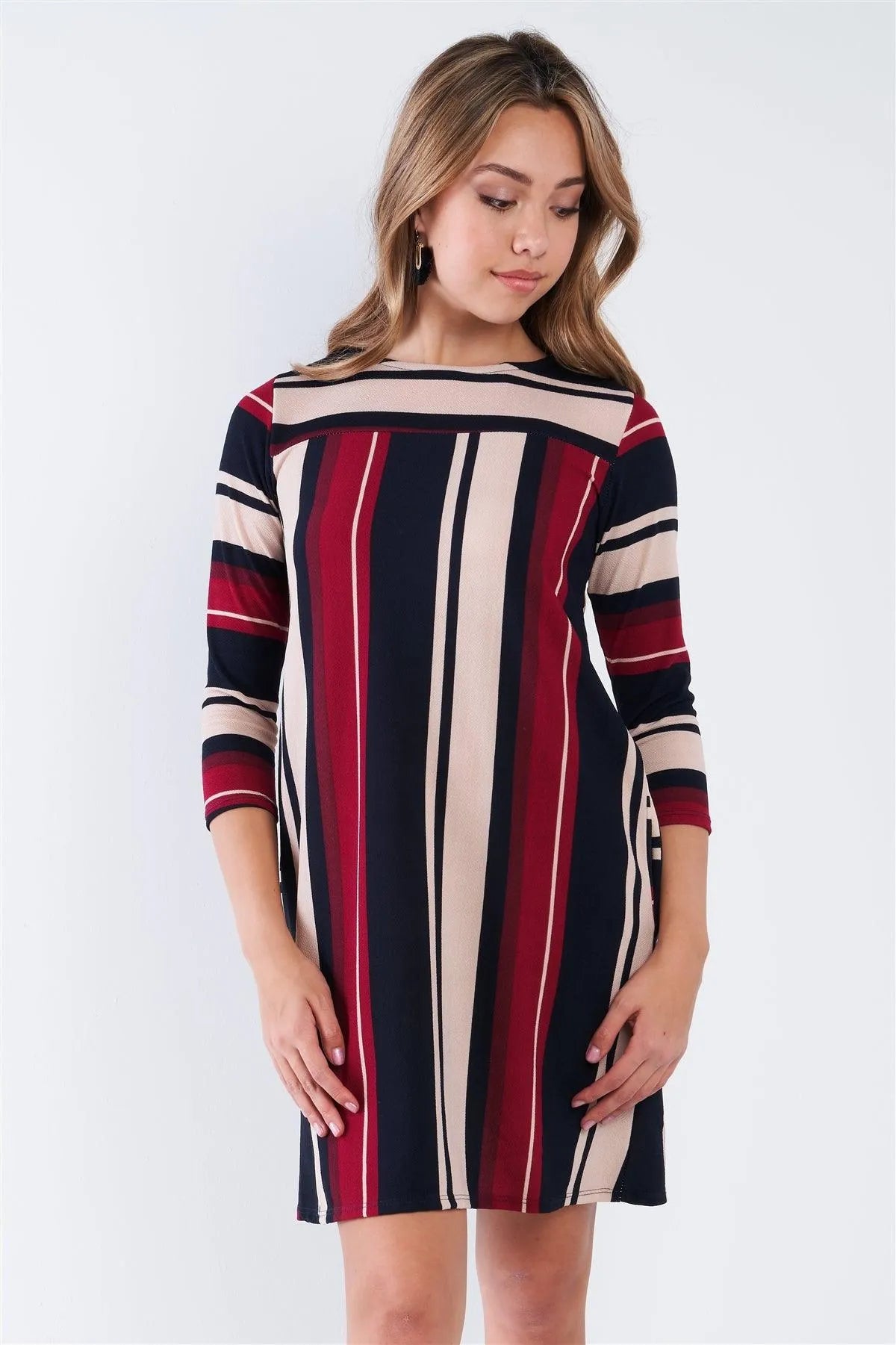 Burgundy Multi Stripe 3/4 Sleeve Shift Midi Dress
