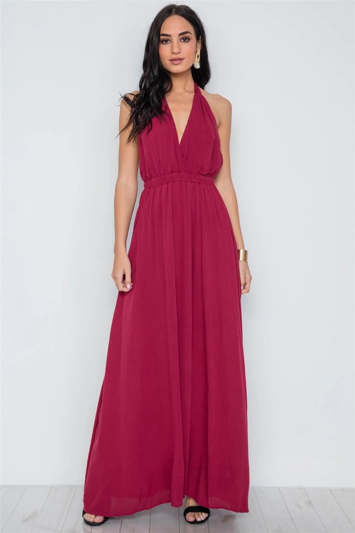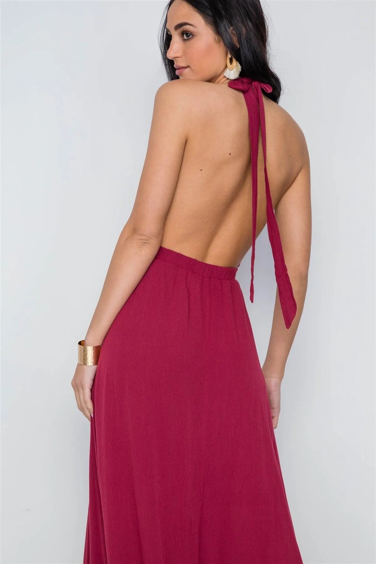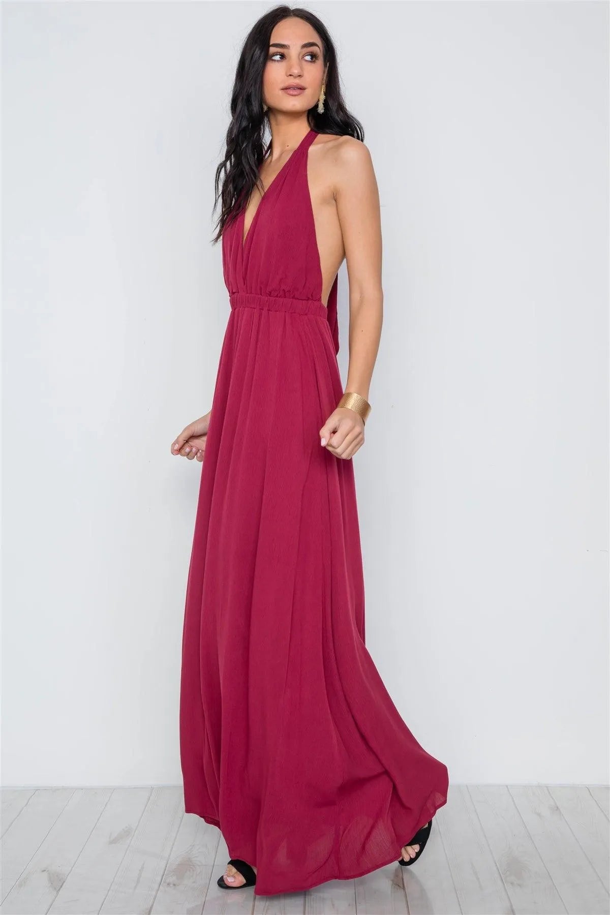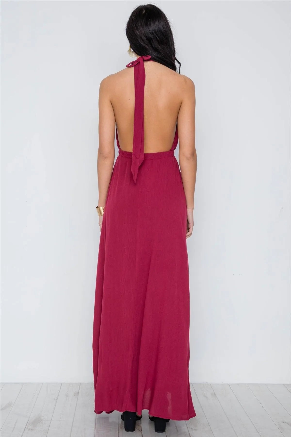 Burgundy Plunging Open Back Solid Maxi Dress /3-2-1