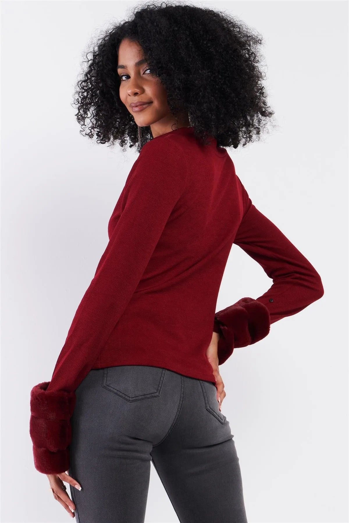 🖤 Item Features: Burgundy, solid, ribbed knit construction, semi-turtleneck, long sleeve with detachable snap button muff inspired faux fur cuff, unlined, super stretchy, fitted, casual, stylish, accent detail, trendy, business casual, chic, fall/winter collection