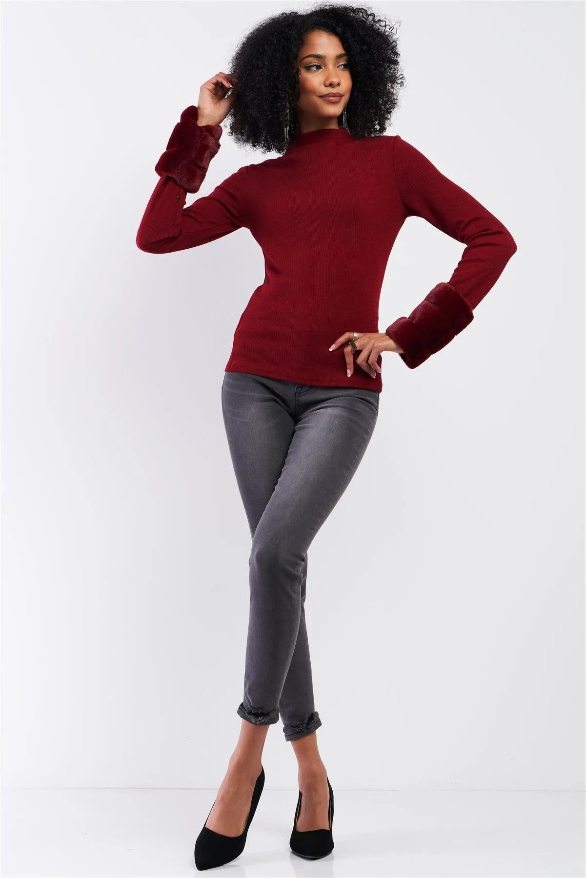 Burgundy Ribbed Long Faux Mink Fur Detachable Muff Inspired Detail Sleeve Semi-Turtleneck Sweater /2-2-2