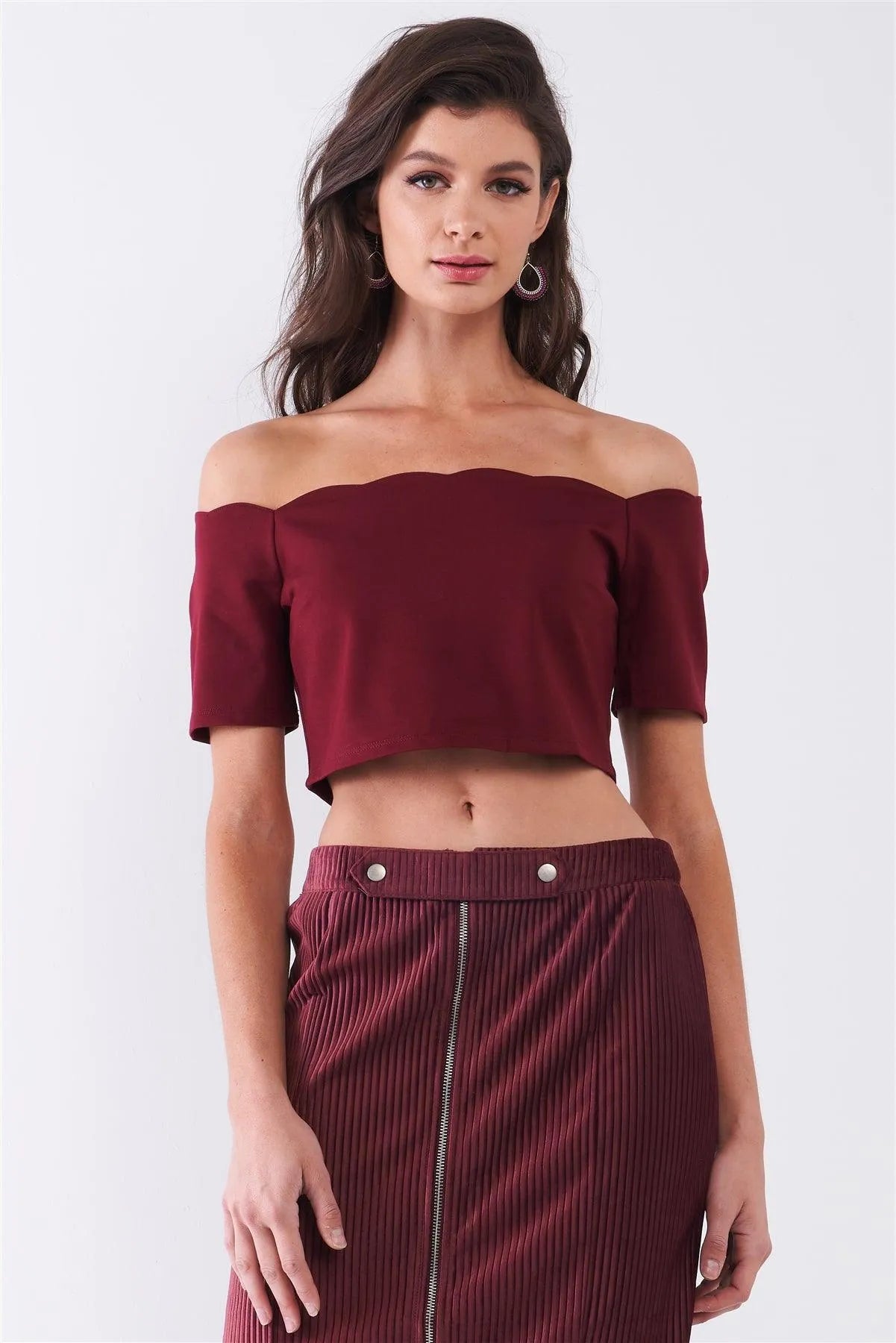 Burgundy Scallop Hem Off-The-Shoulder Short Sleeve Cropped Top /1-1-2-1