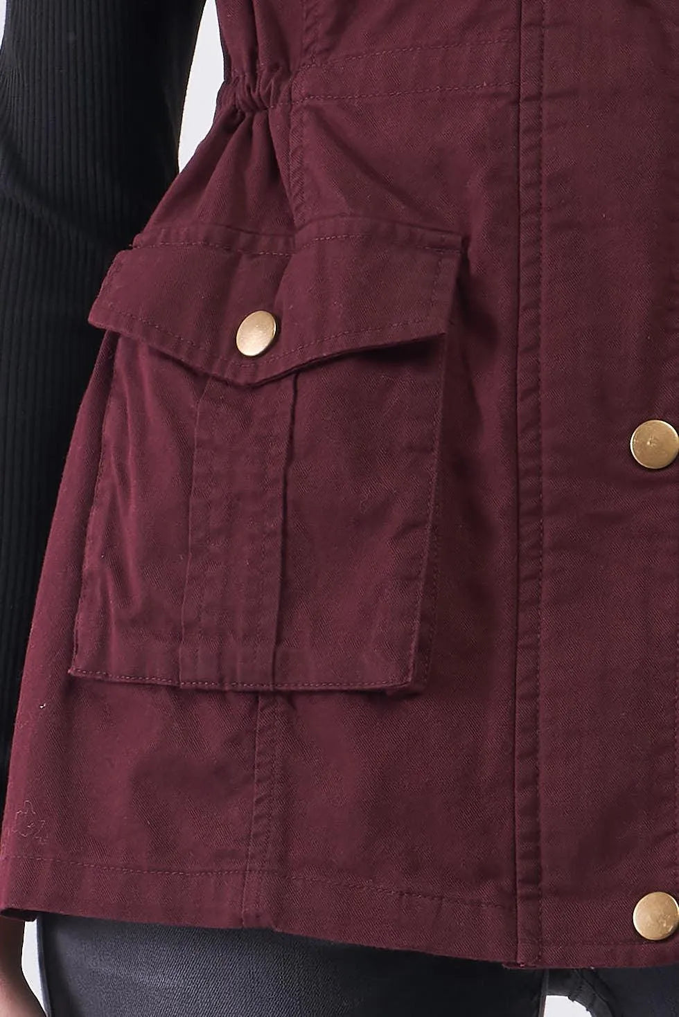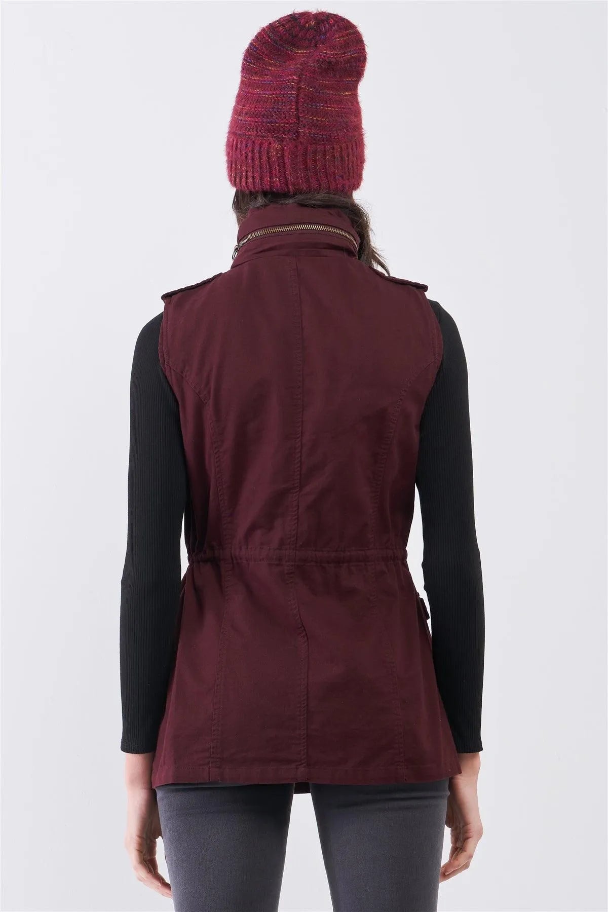 Burgundy Military Sleeveless Detachable Hoodie Vest Jacket