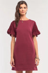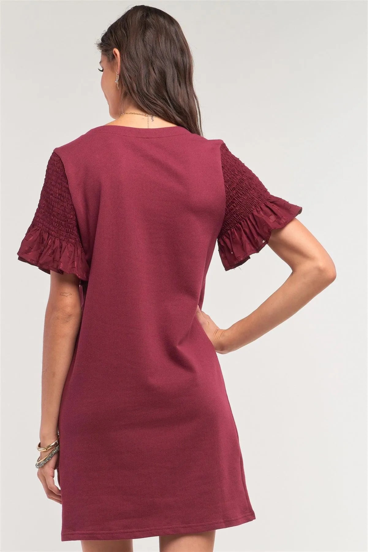 Burgundy Round Neck Smock Short Sleeve Mesh Frill Detail Tunic Mini Dress /1-2-2-1