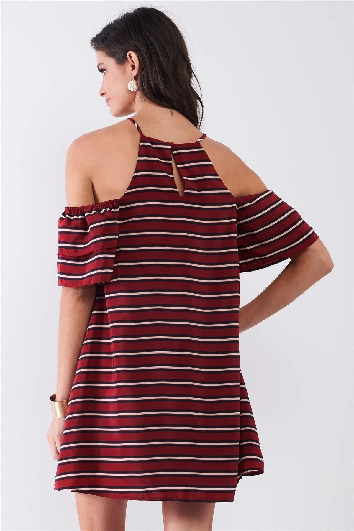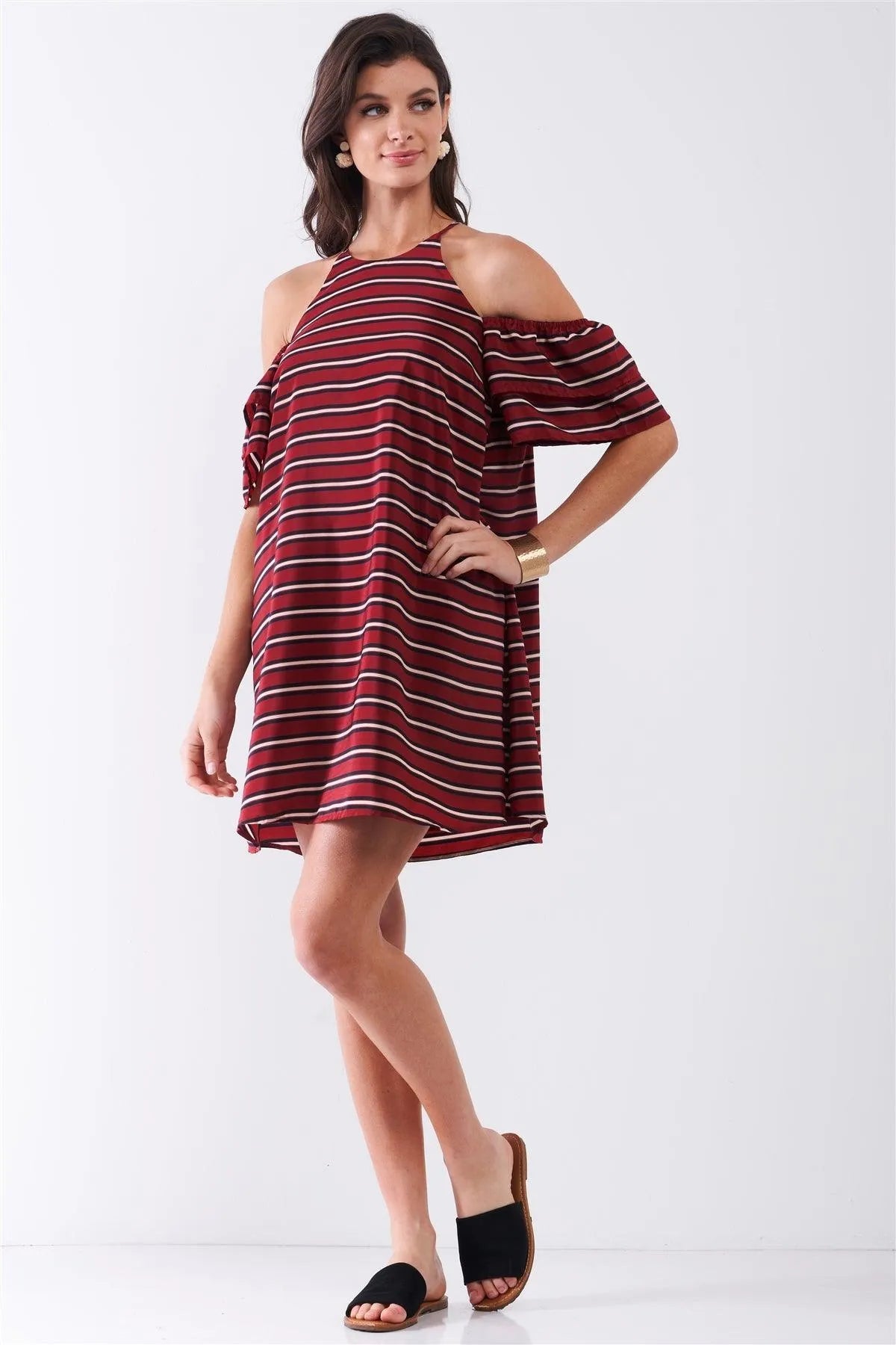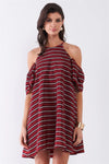 Burgundy Striped Print Cold Shoulder Puff Sleeve Racer Back Detail Relaxed Mini Dress /1-2-2