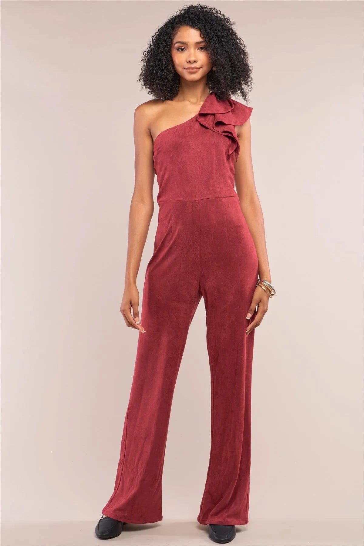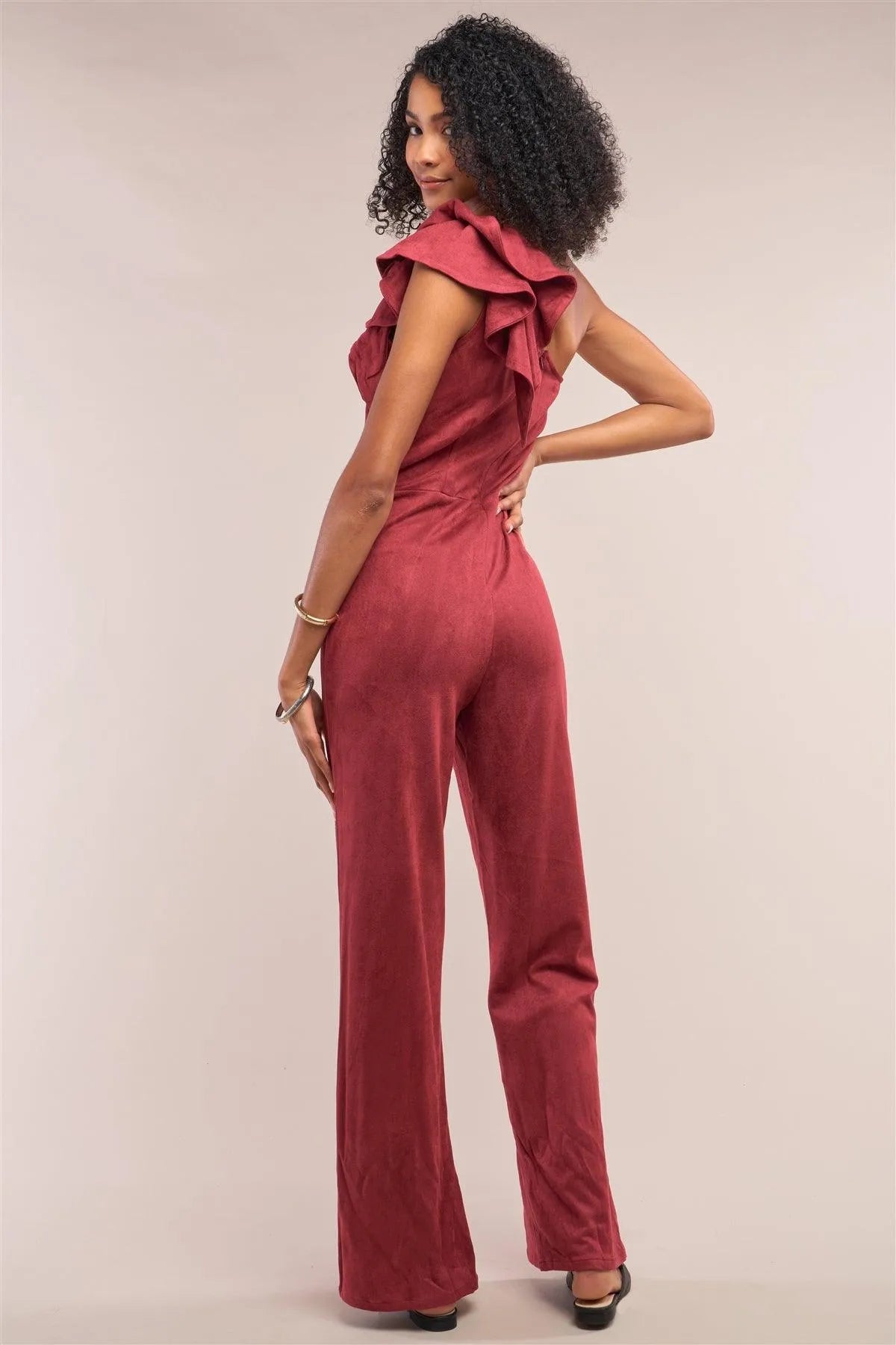 Burgundy Suede Sleeveless One-Shoulder Ruffle Detail Fitted Wide Leg Jumpsuit /3-1-1