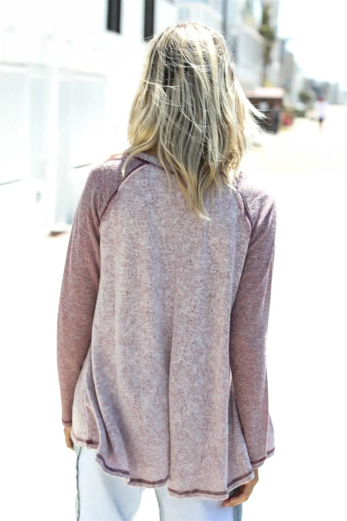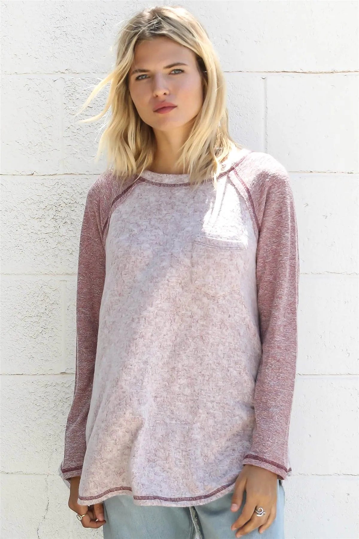 🖤 Item Features: Burgundy, textured material, raglan style, round neckline, long sleeves, inside out trim details, front pocket, relaxed fit, stretchy, not see through, unlined, casual, basic, comfy, must-have, everyday look, soft-to-touch