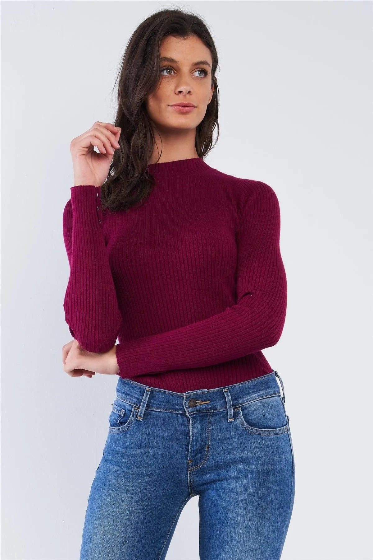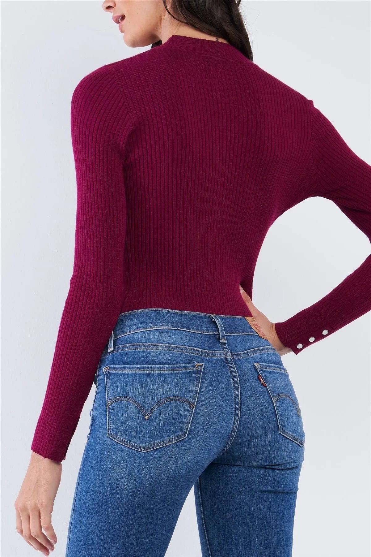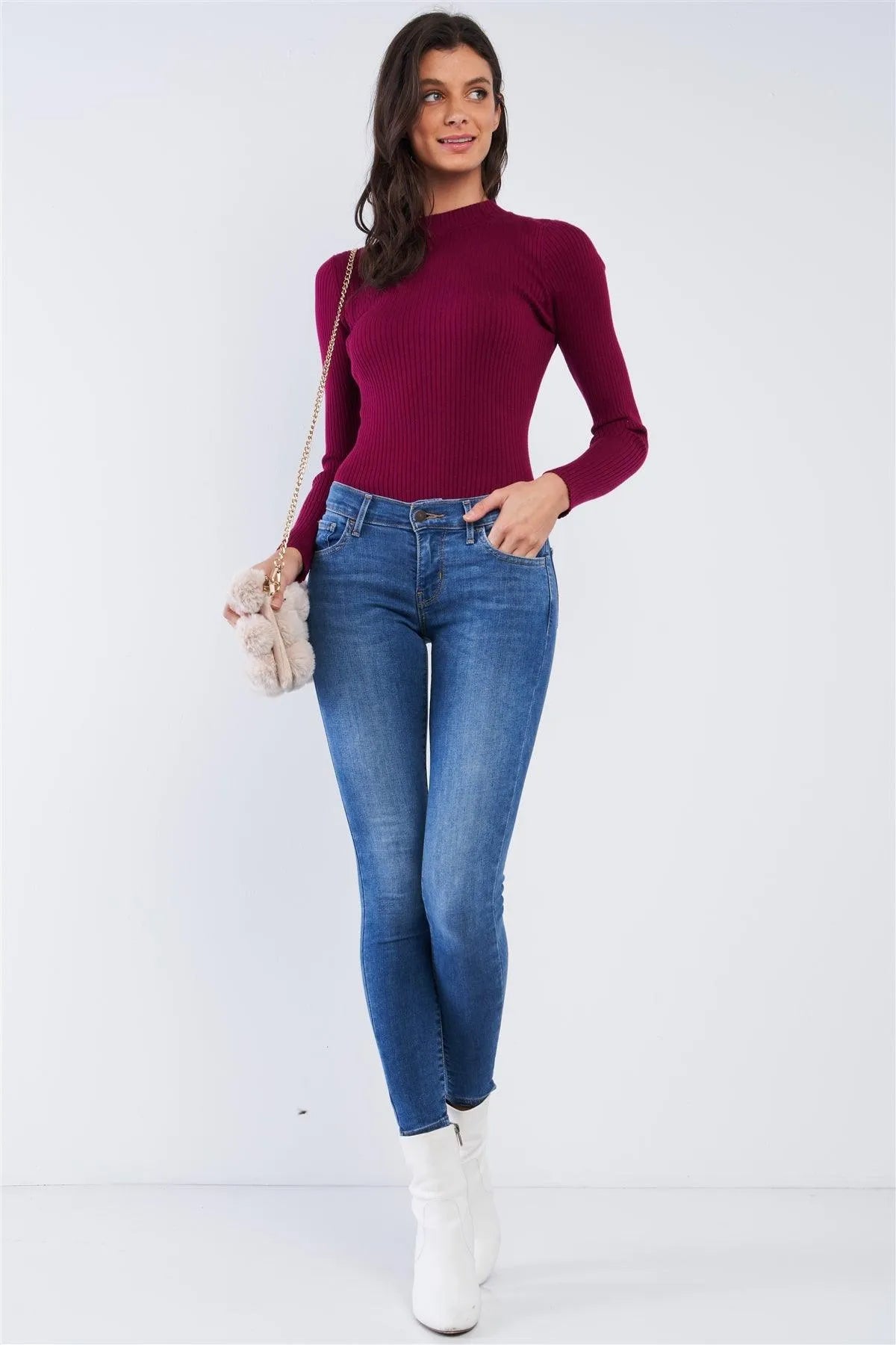 Burgundy Tight Fit Long Sleeve Semi-Turtleneck Ribbed Bodysuit /3-3
