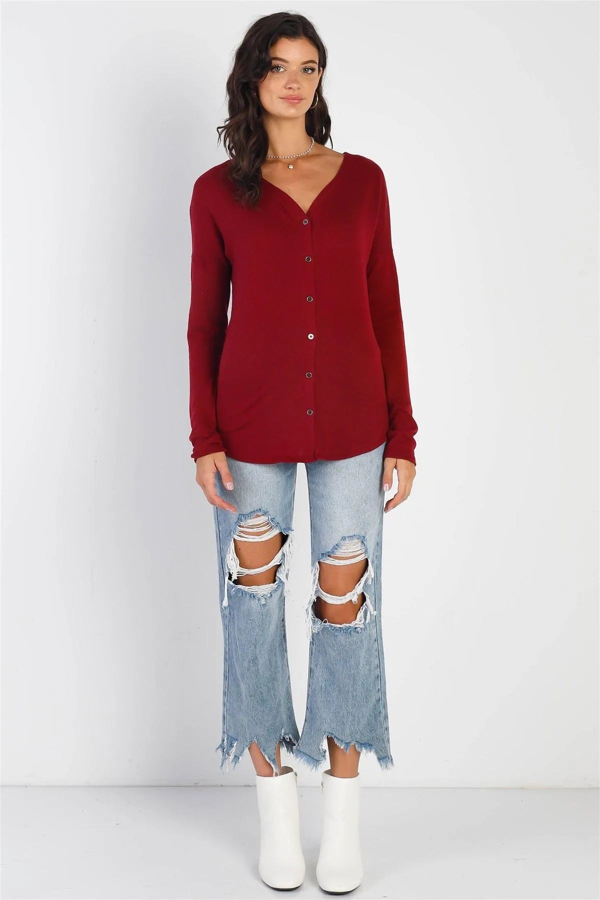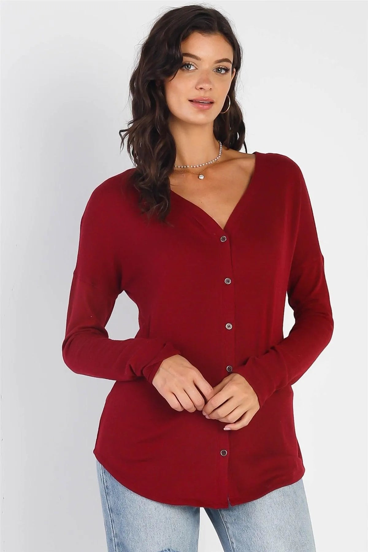 🖤 Item Features: Burgundy, solid color, v-neckline, button up front, long sleeve, relaxed fit, unlined, semi-sheer, stretchy, elegant, cozy, cute, trendy, stylish, fall/winter collection.