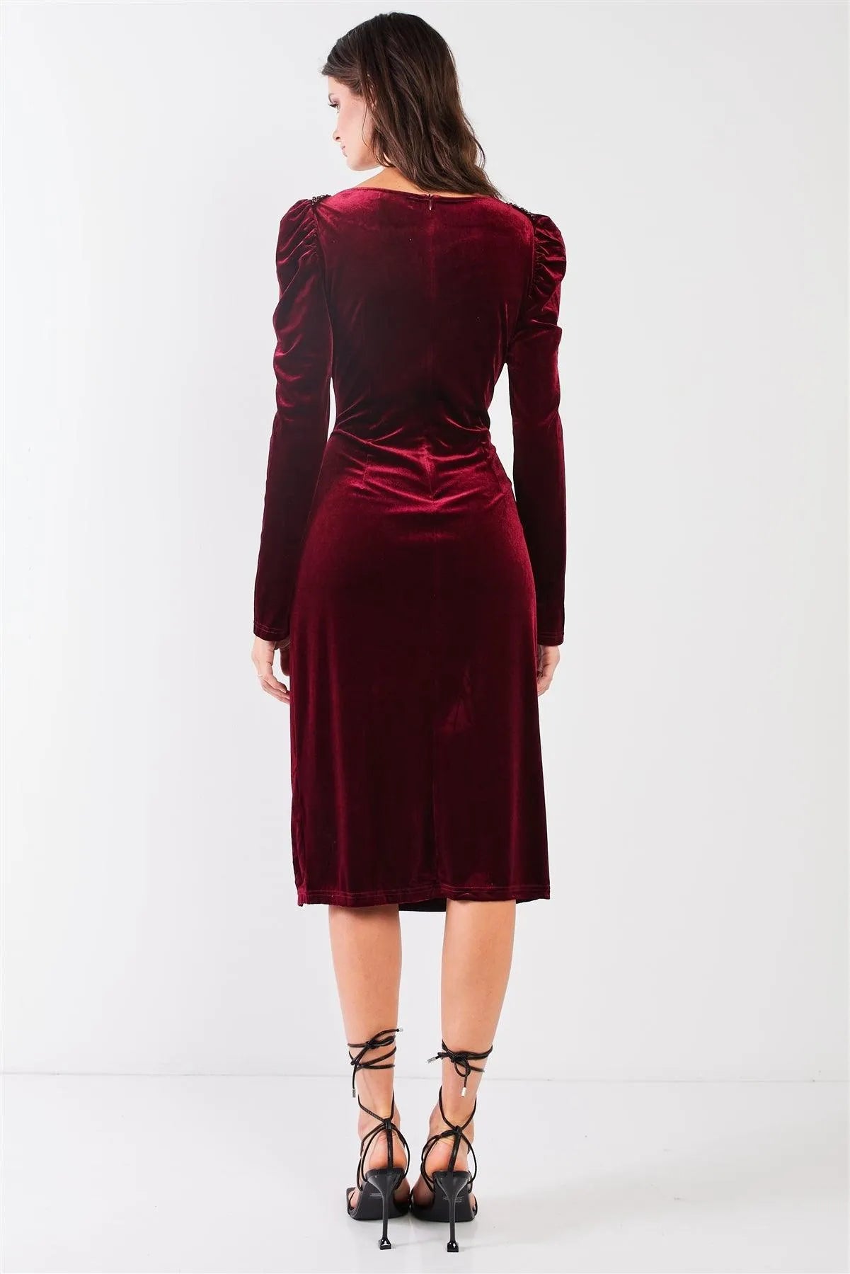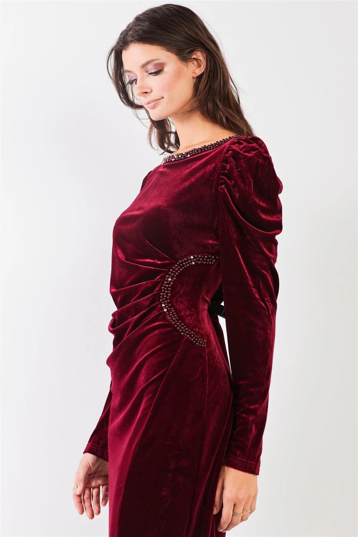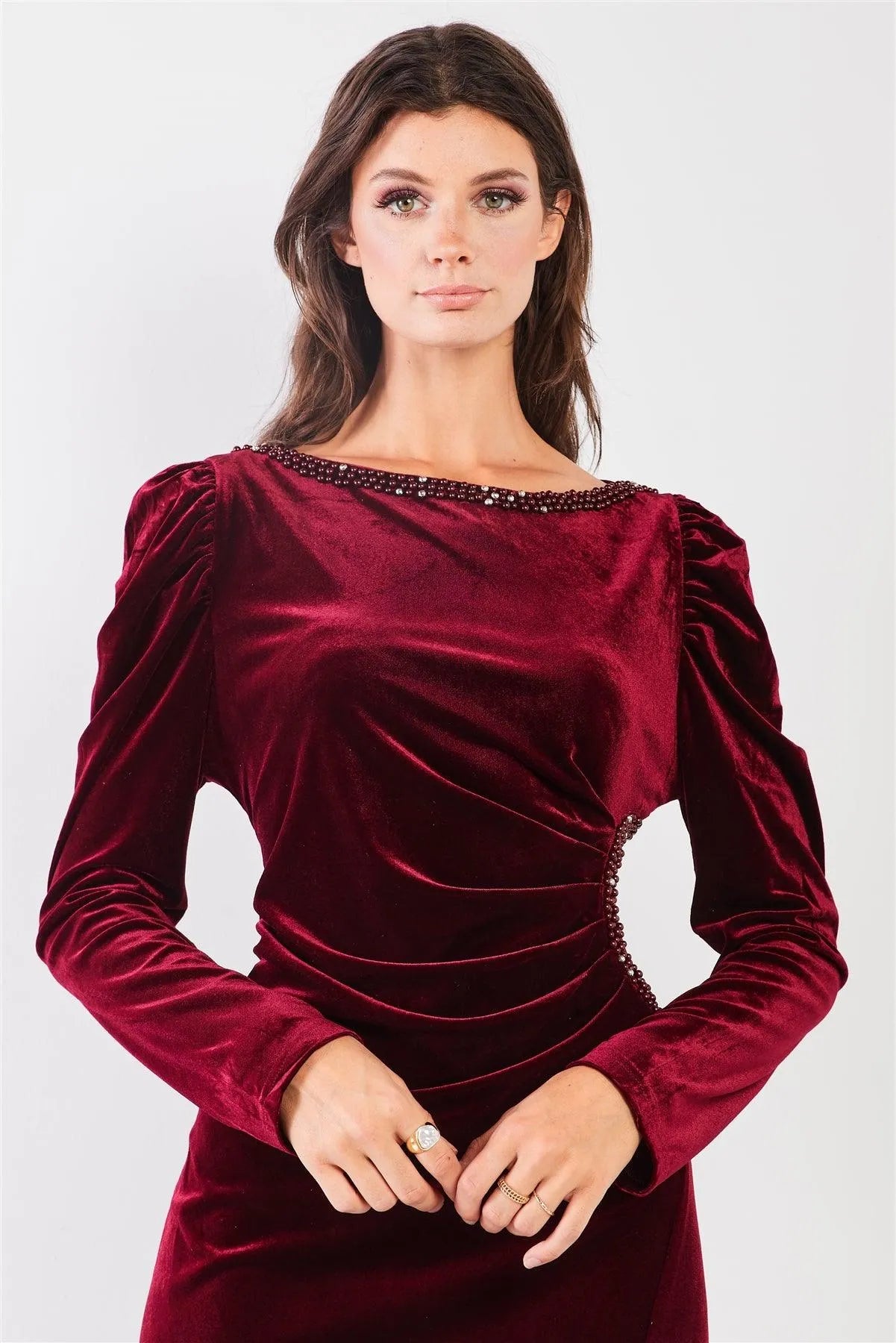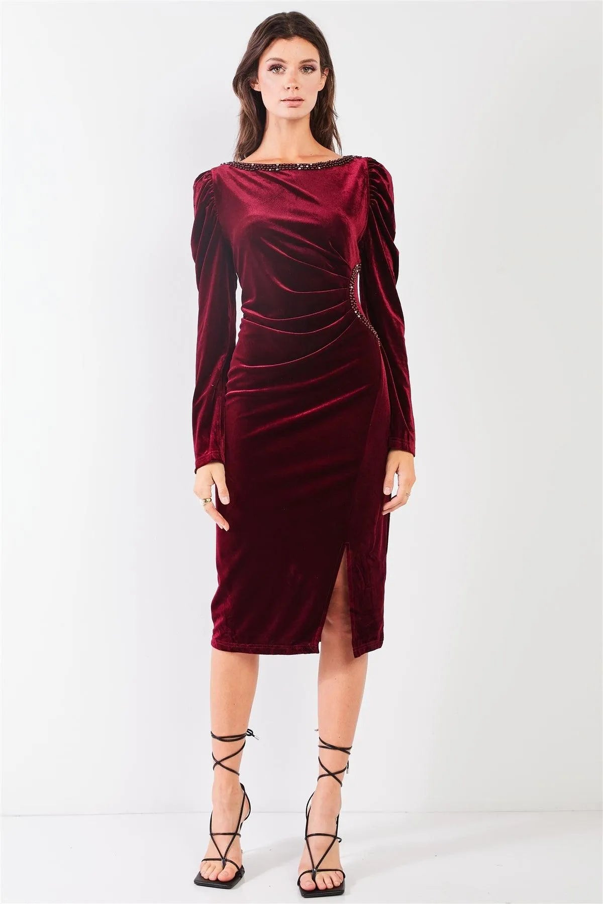 Burgundy Velvet Beaded Neckline Trim Juliet Long Sleeve Side Slit Midi Dress /1-1-1