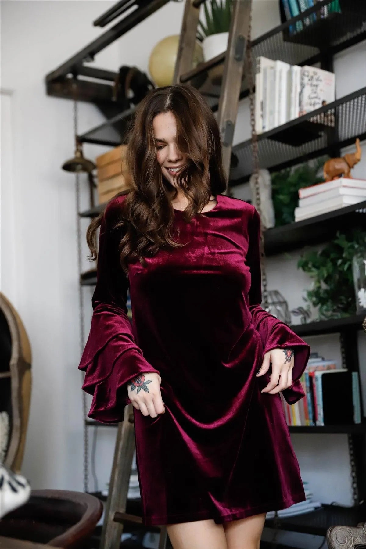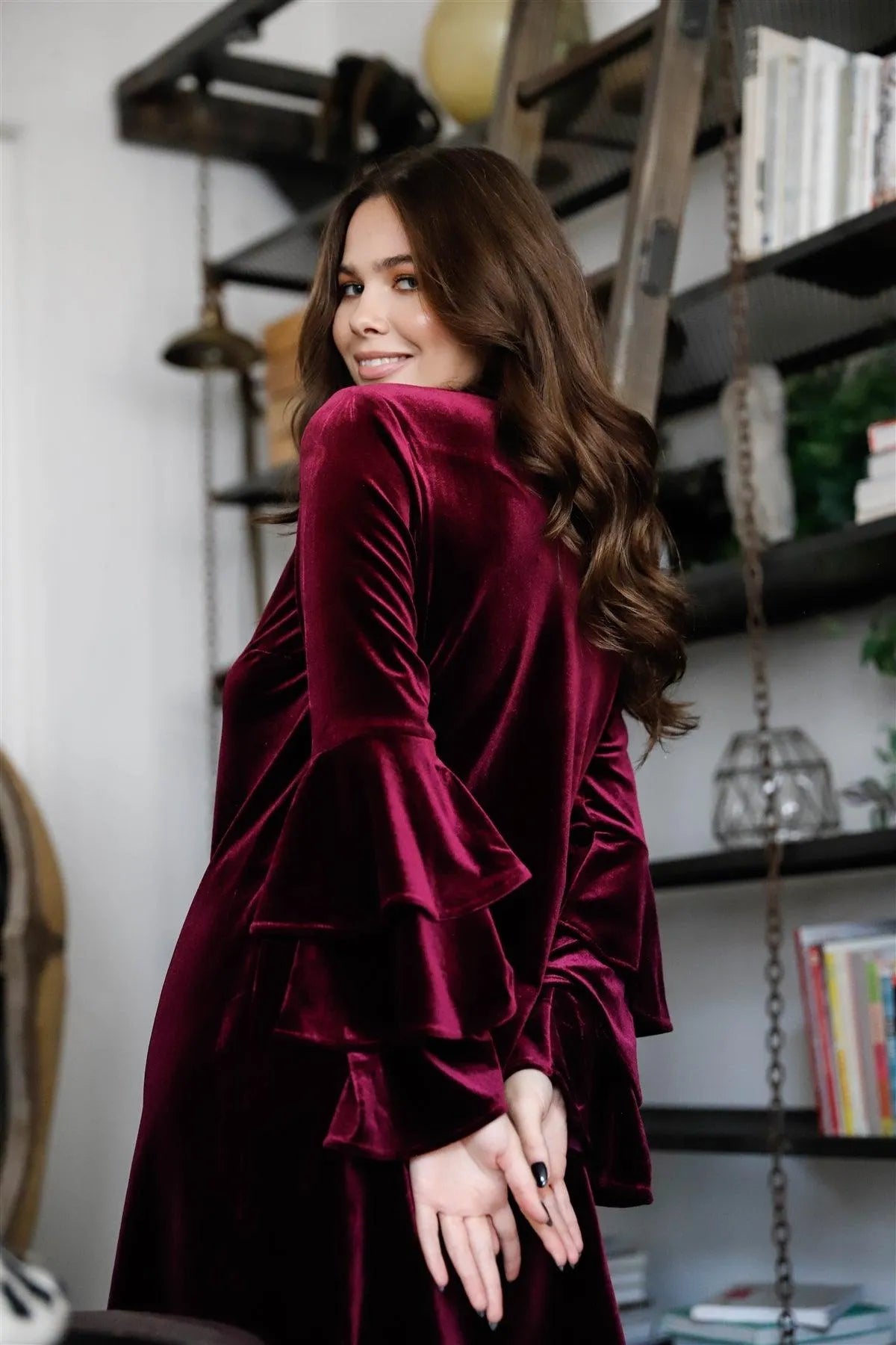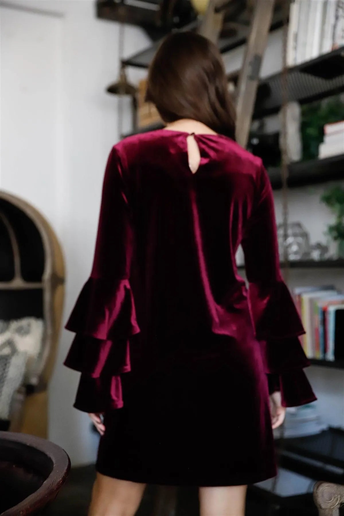 Burgundy Velvet Ruffled Long Sleeve Relaxed Mini Dress /1-1-1-1-1