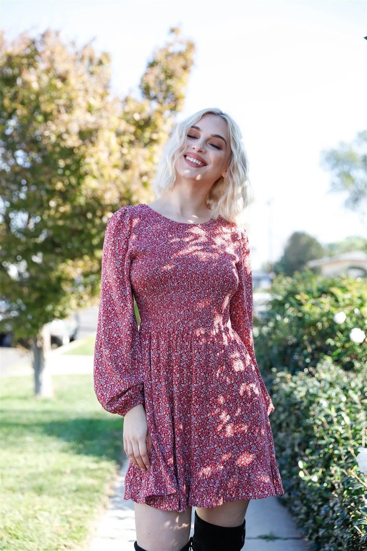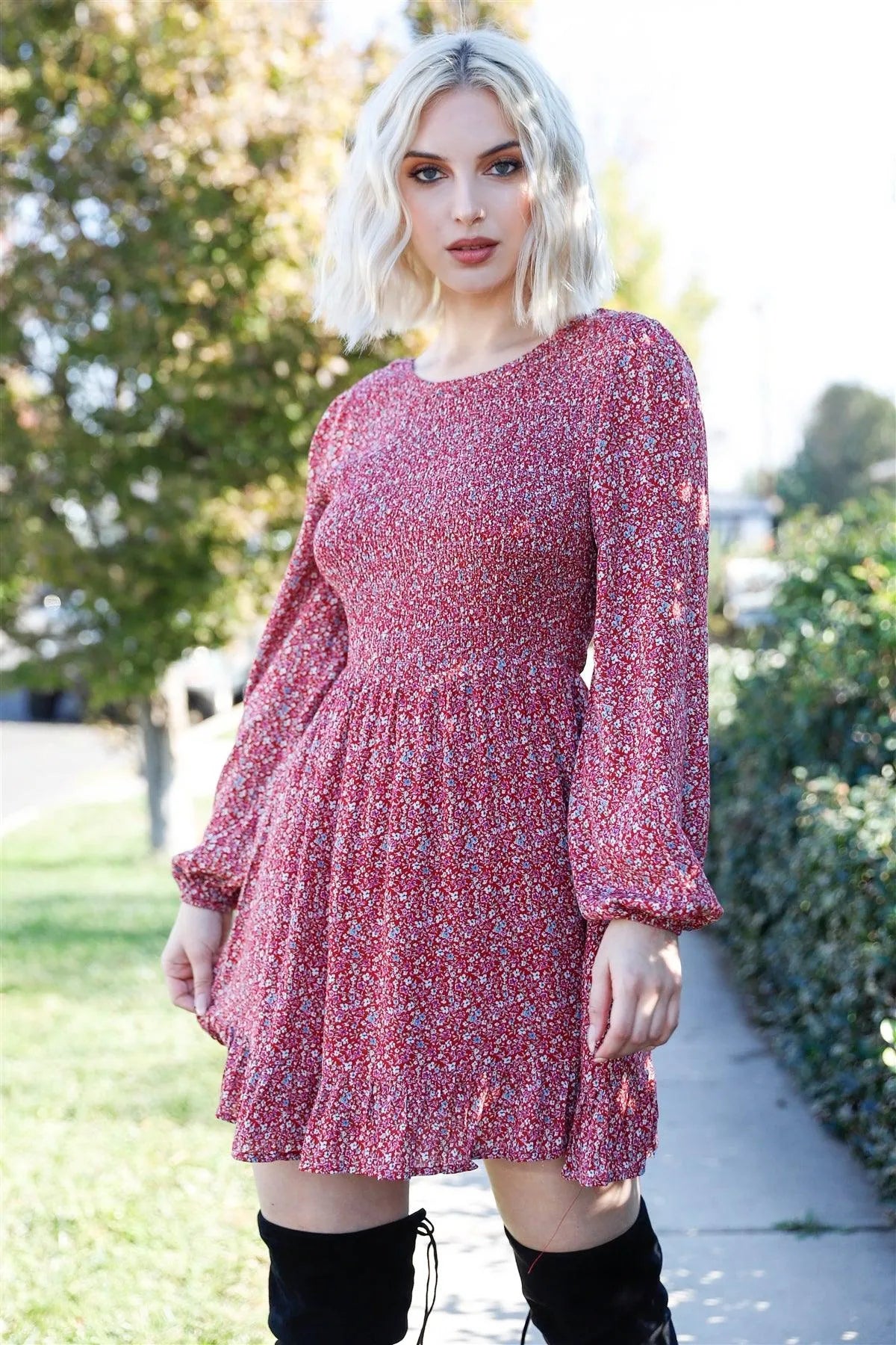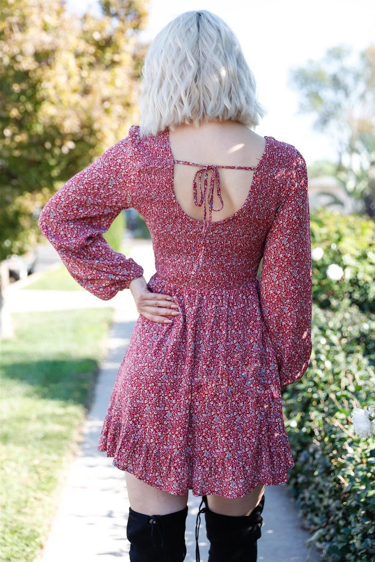🖤 Item Features: Burgundy & white, floral print, smocked bodice, balloon puff sleeves, elasticized cuffs, open back with self-tie detail, round neckline, mini length, lined, partially stretchy, girlish, cute, trendy, flowy, stylish, casual