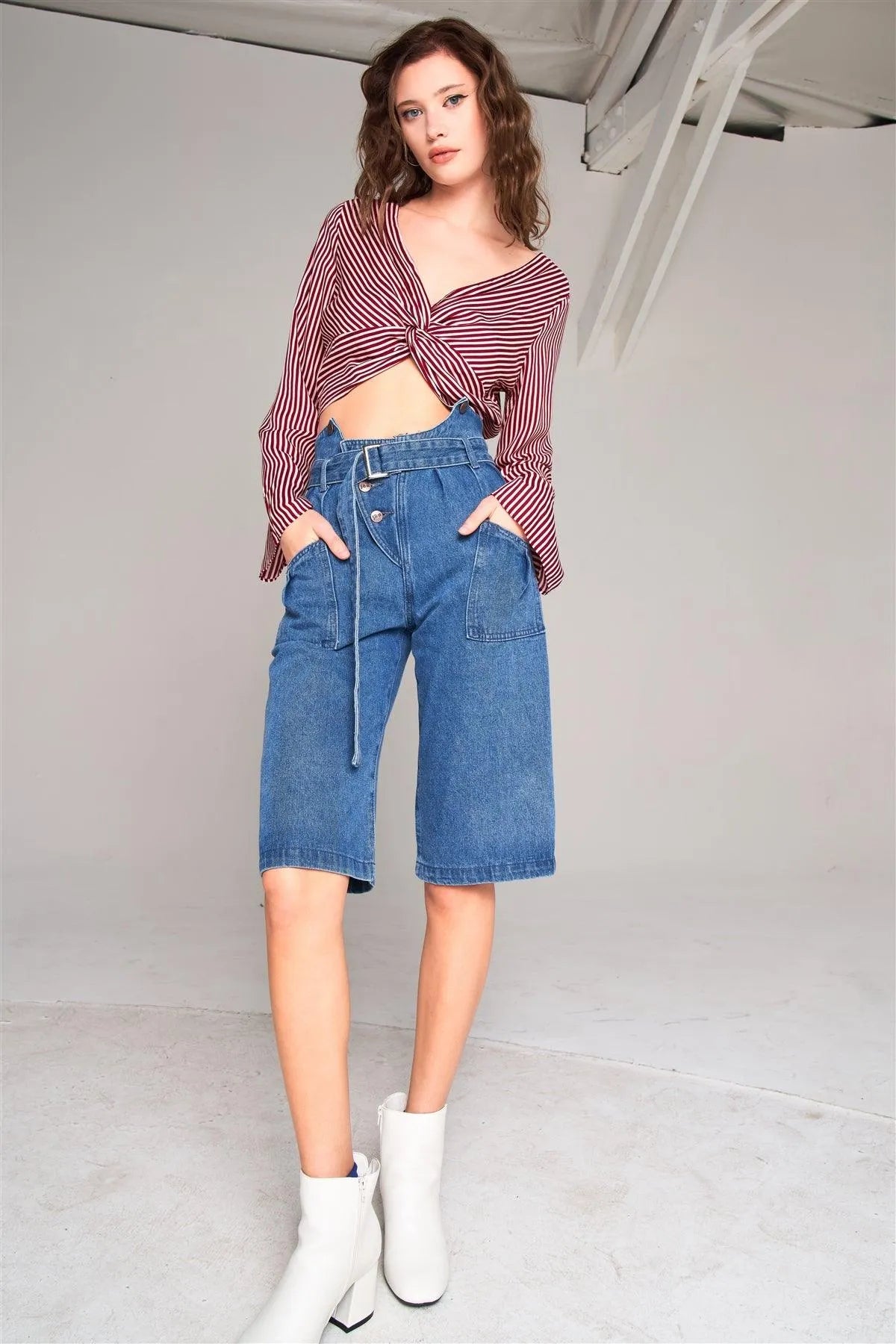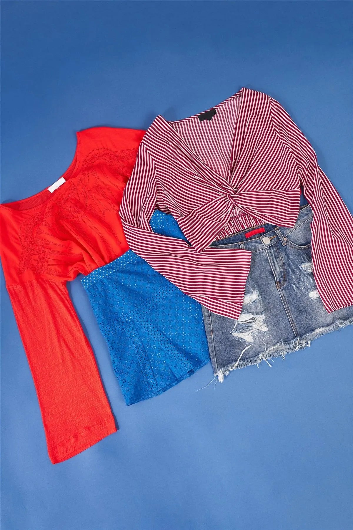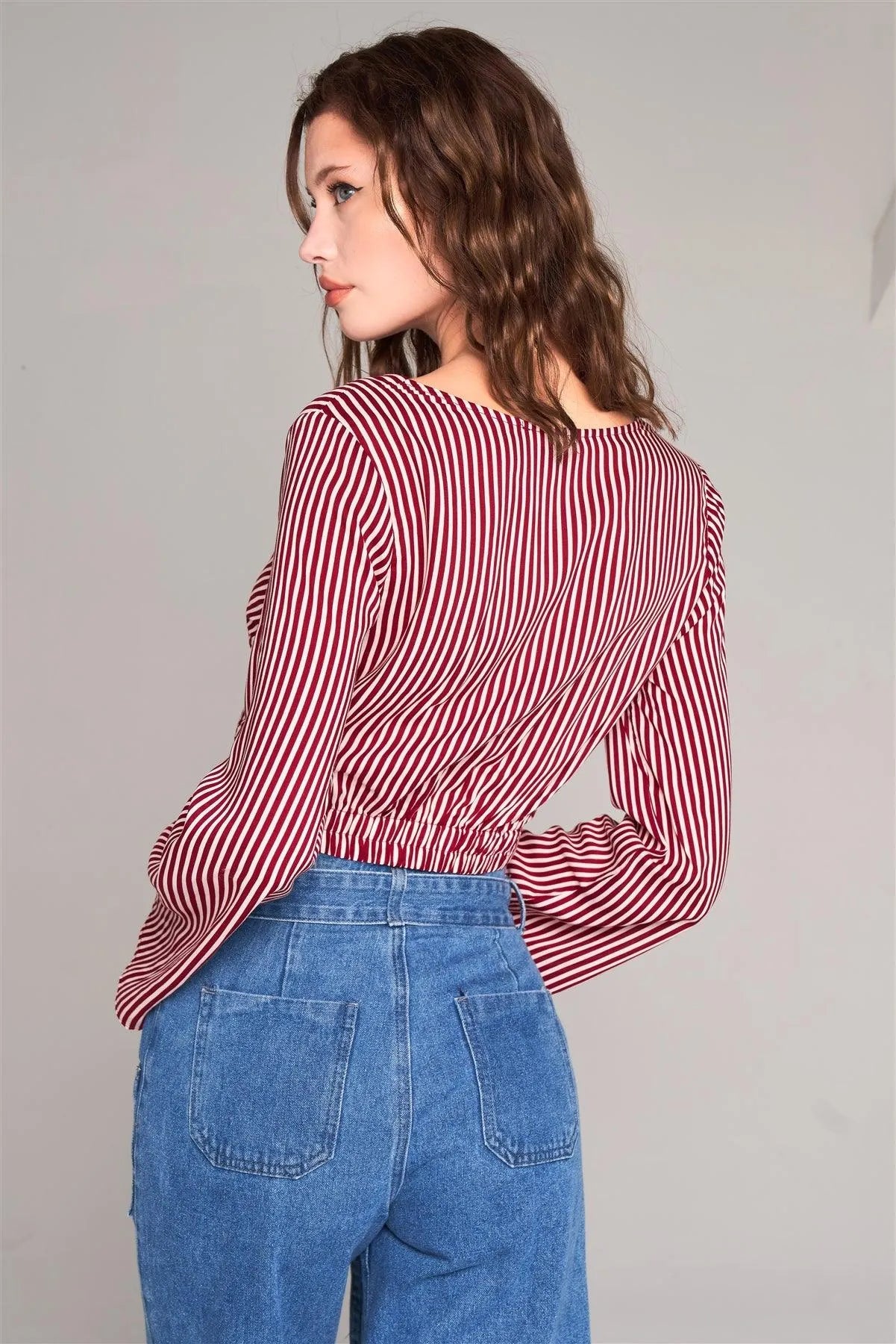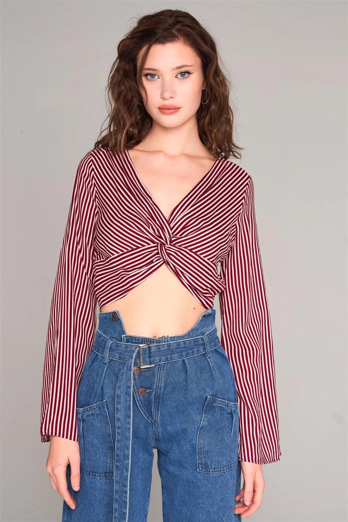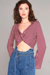 🖤Item Features: Burgundy & white, striped, long bell sleeve, v-neckline, front twist detail, cropped length, elasticated back, unlined, non-sheer, non-stretch, casual, trendy, retro, spring/summer collection