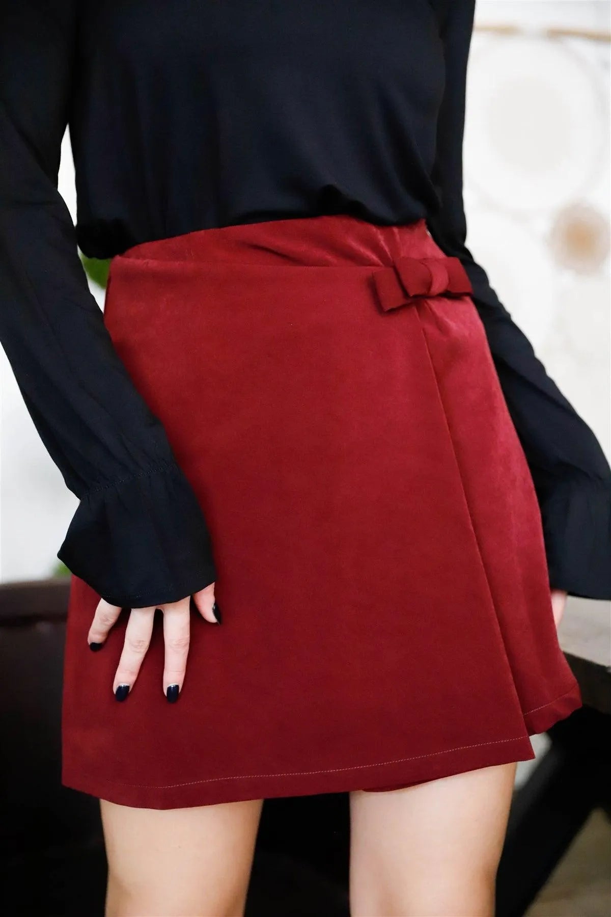 Burgundy Wrap Front Side Bow Detail Mini Skirt /2-2-2