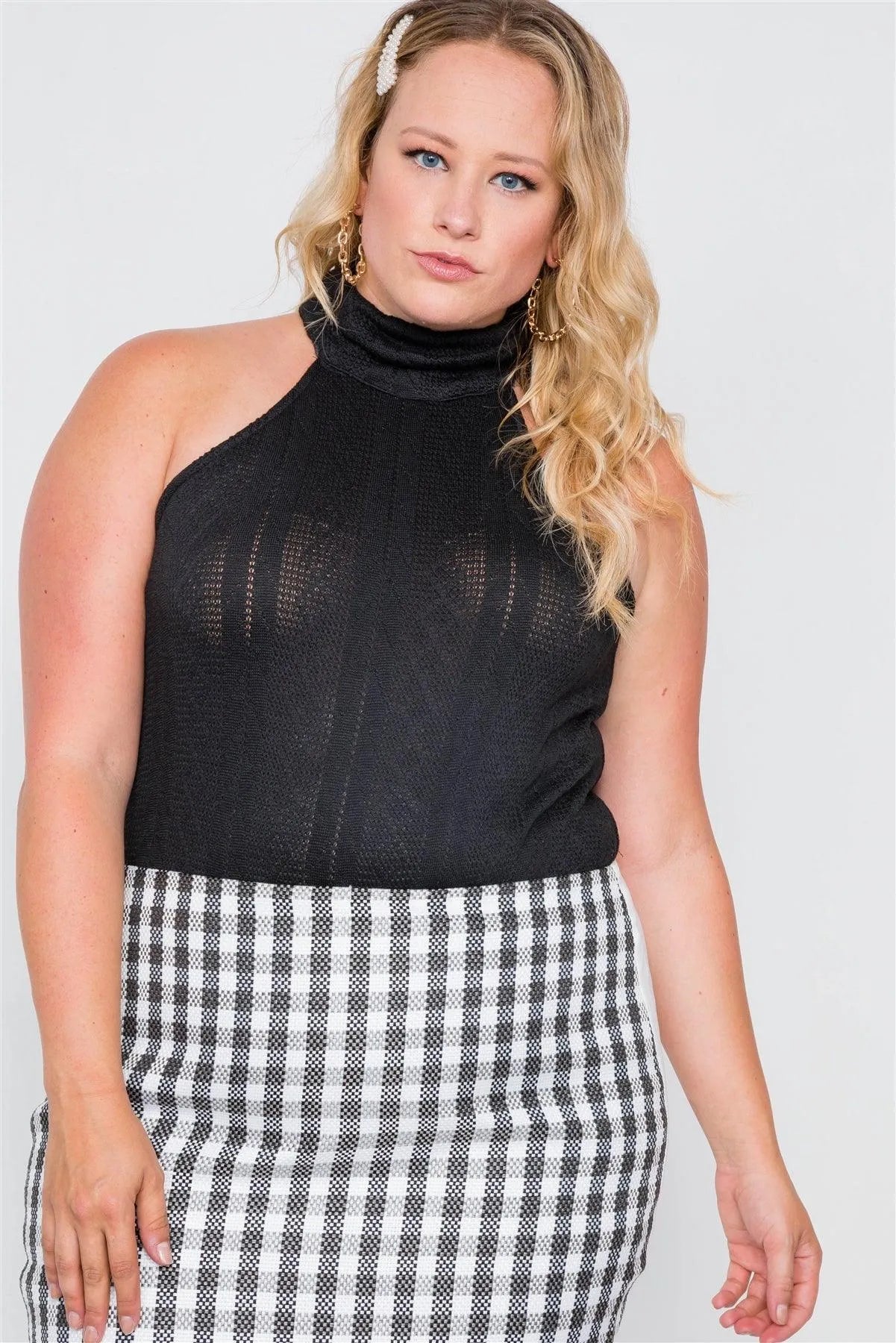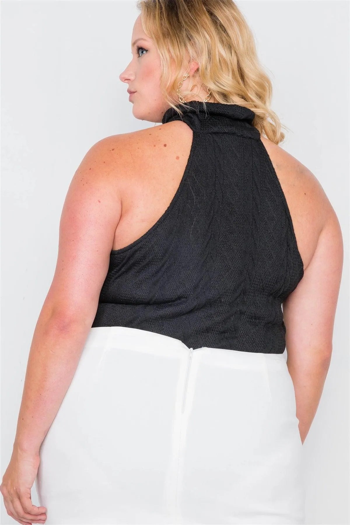 Plus Size Black Cable Knit Turtleneck Sleeveless Bodysuit /2-2-2