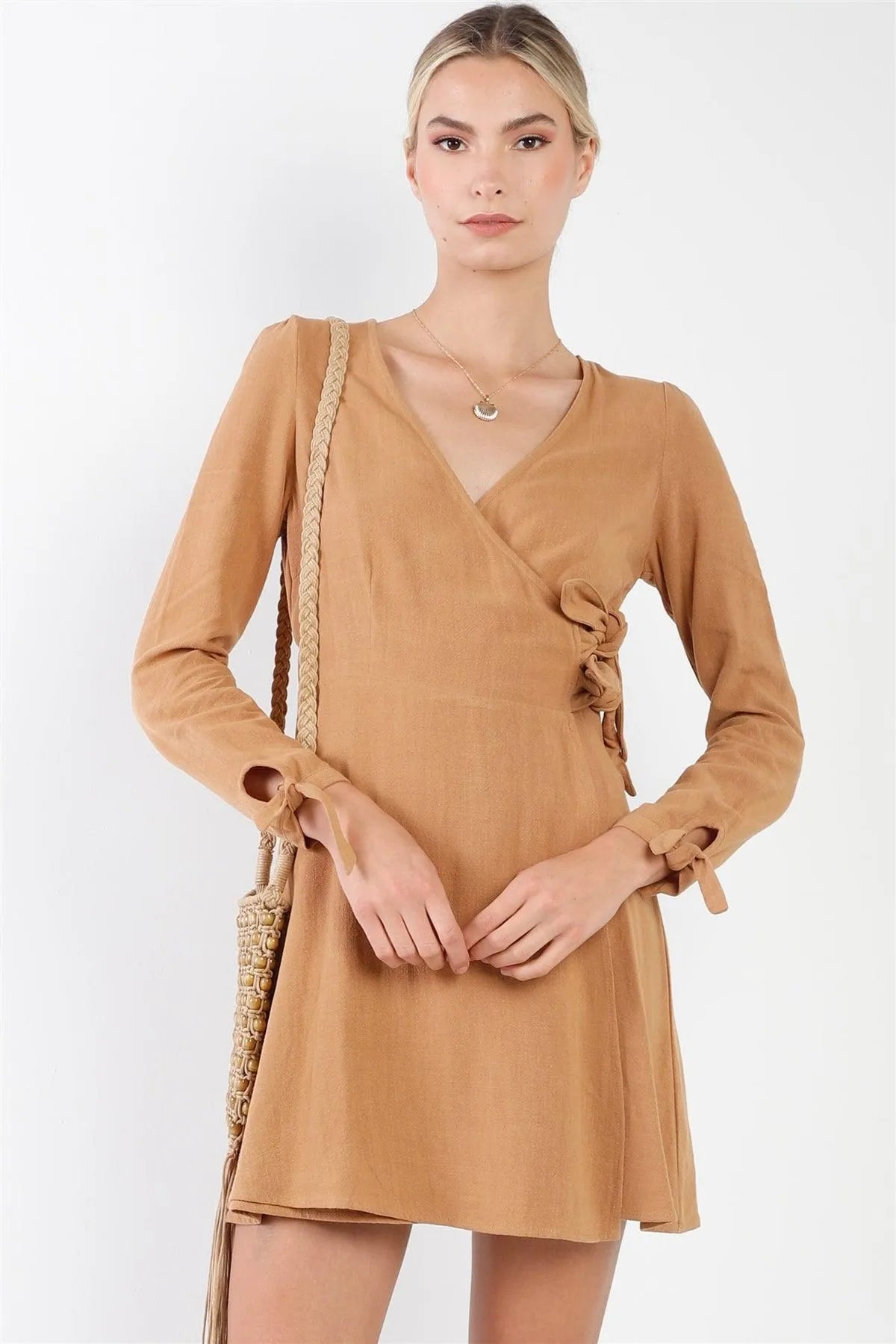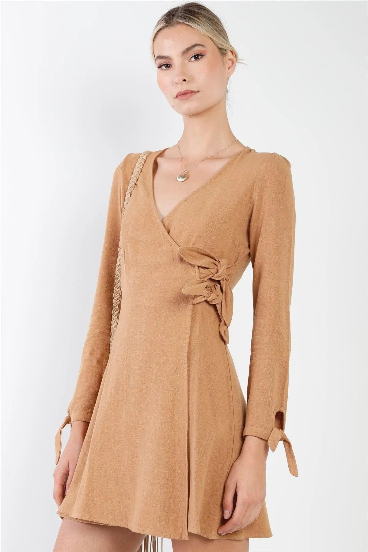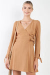 Camel Cotton V-Neck Wrap Boho Chic Mini Dress /2-2-2