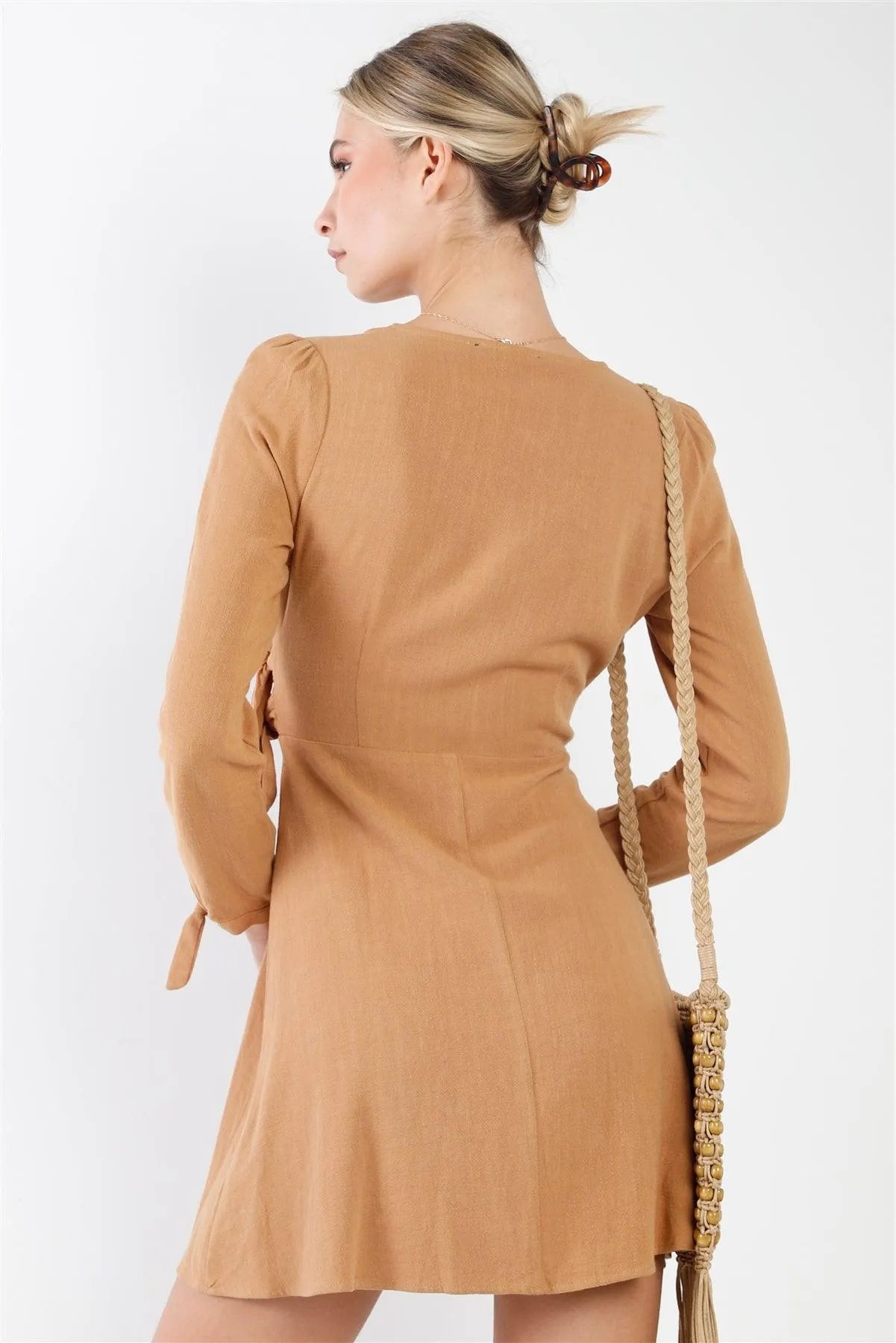 🖤Item features: Camel, solid color, full bow tie cuff sleeves, v-neckline, cotton, inside hidden button & side bow tie closure, unlined, cinched shoulder, mini length, unlined, stretchy, boho, chic, vintage