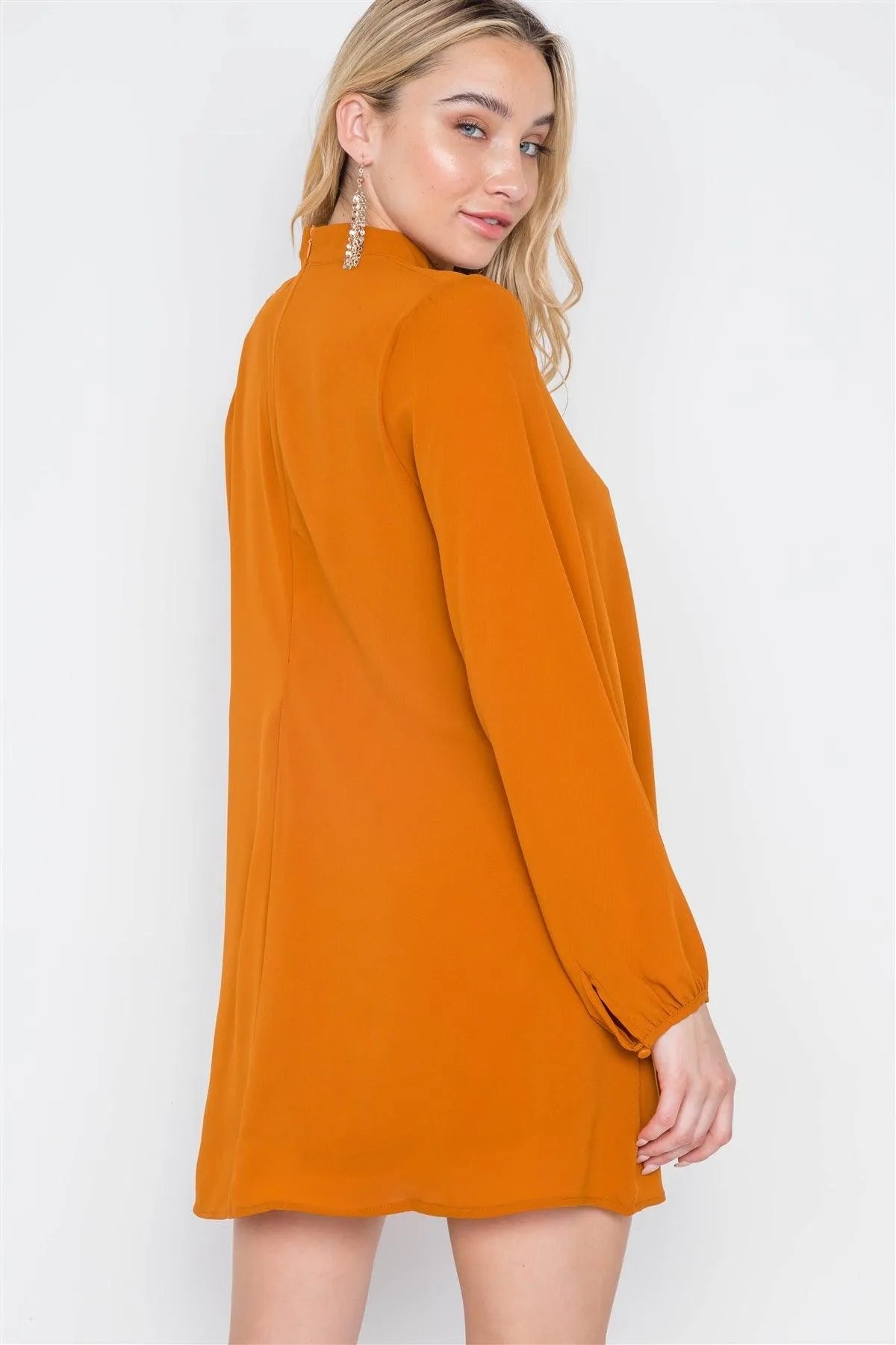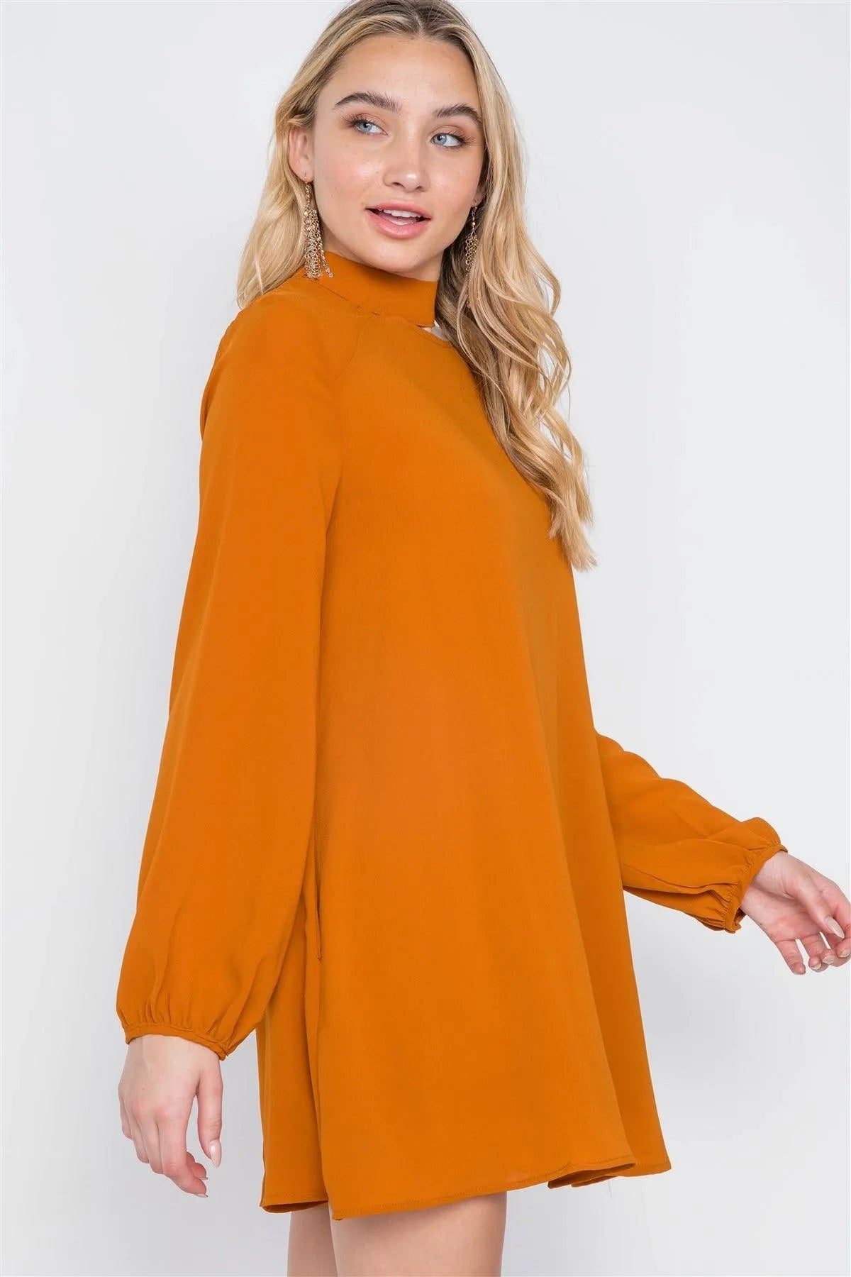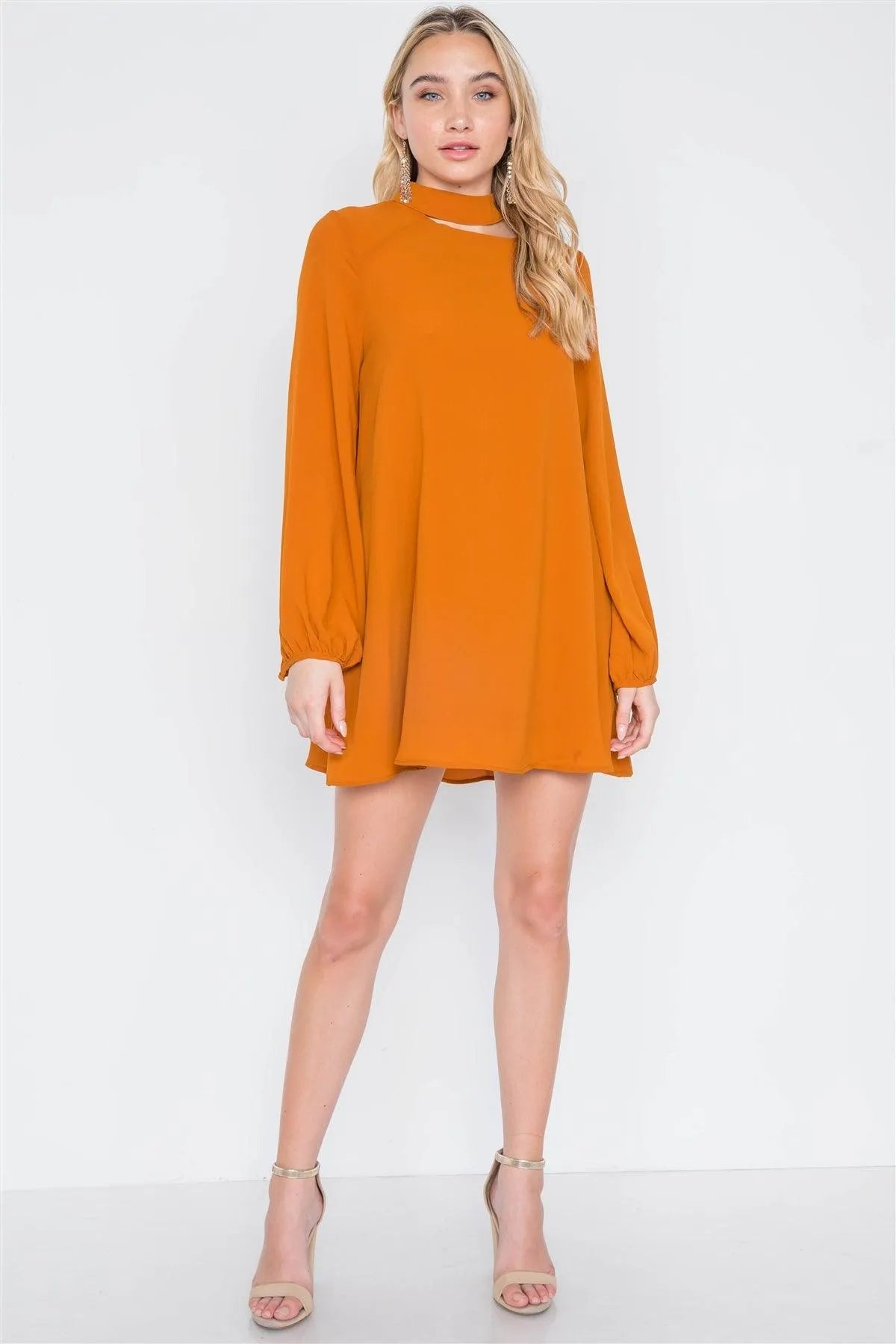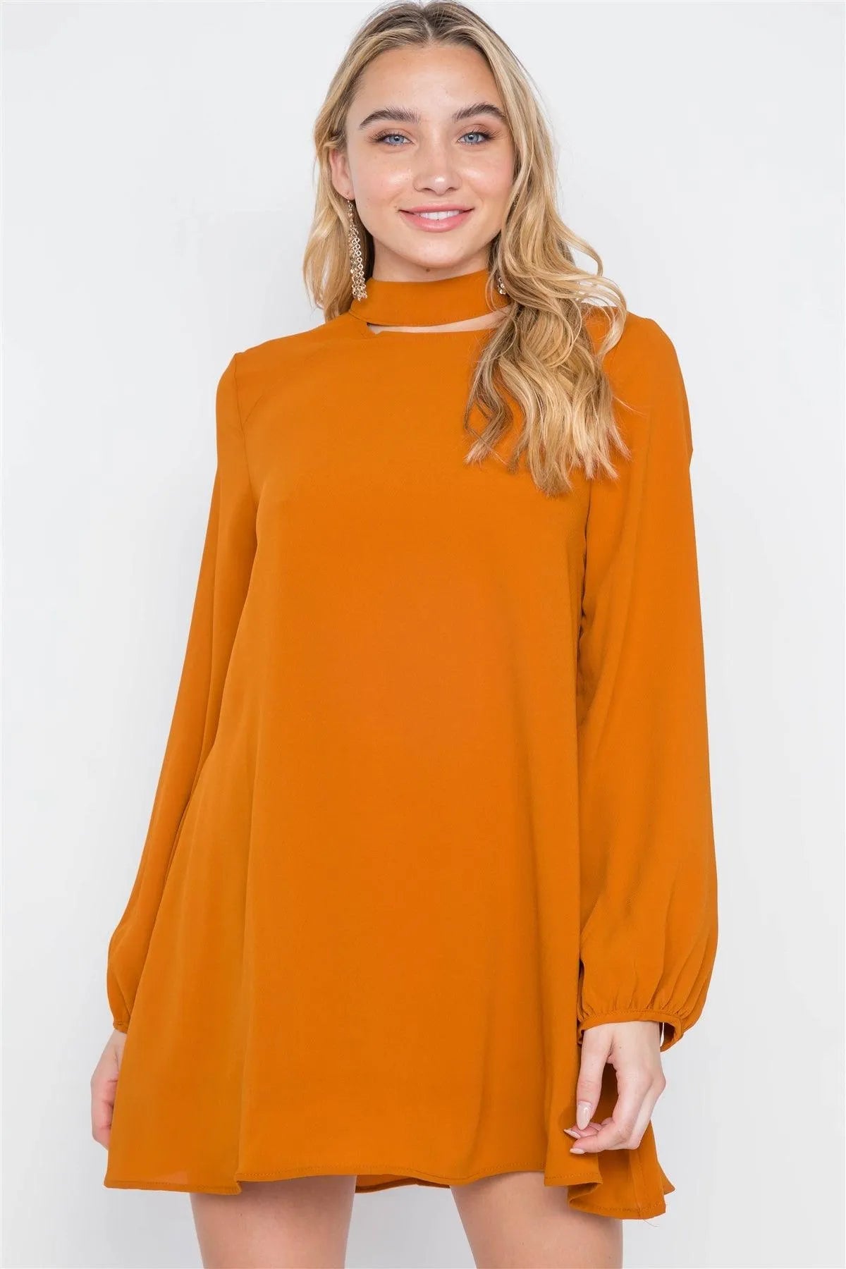 Camel Cut-Out Neck Solid Long Sleeve Dress /2-2-3
