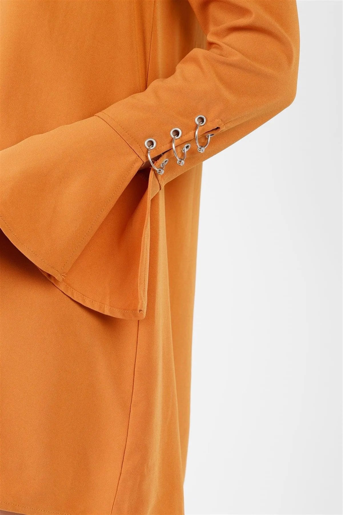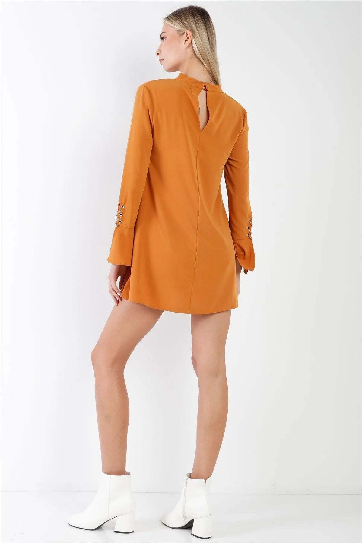 🖤 Item features: Camel, solid color, long sleeves with O-ring detailing at cuffs, mock neck with back button closure, V-cut out, side pockets, mini length, loose fit, unlined, non-stretchy, elegant, casual, trendy, edgy