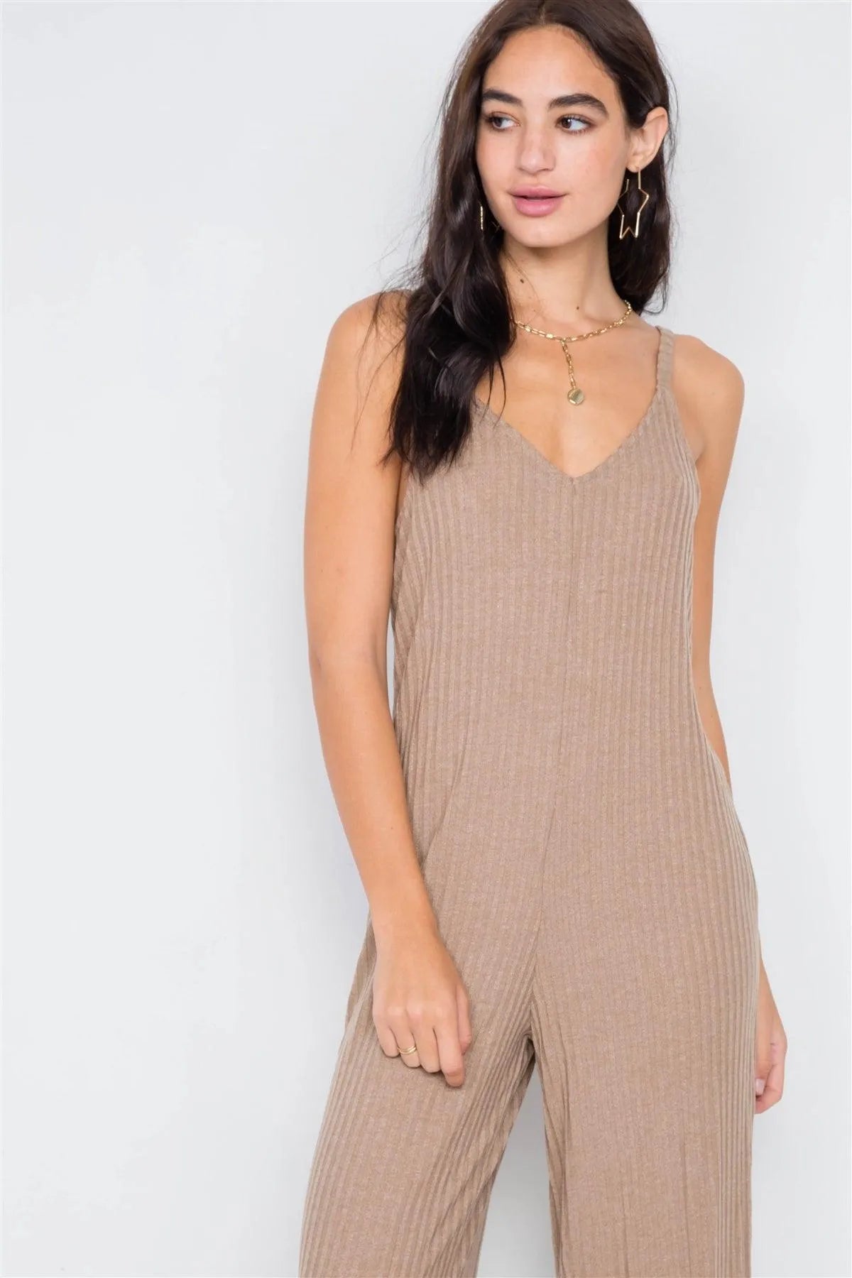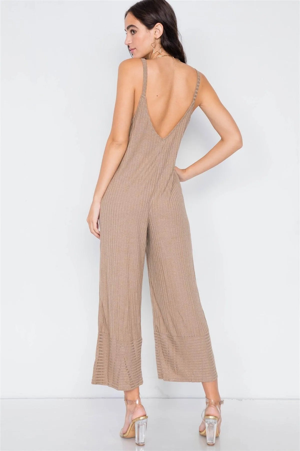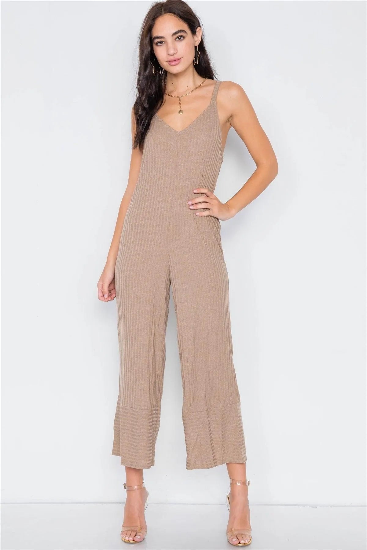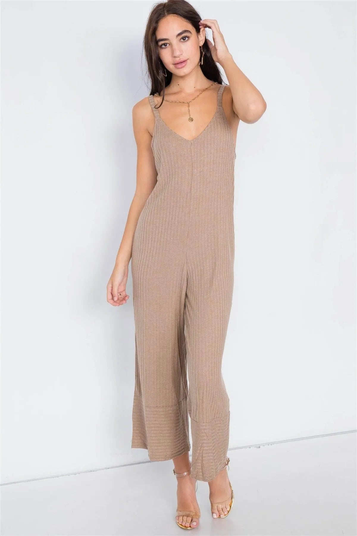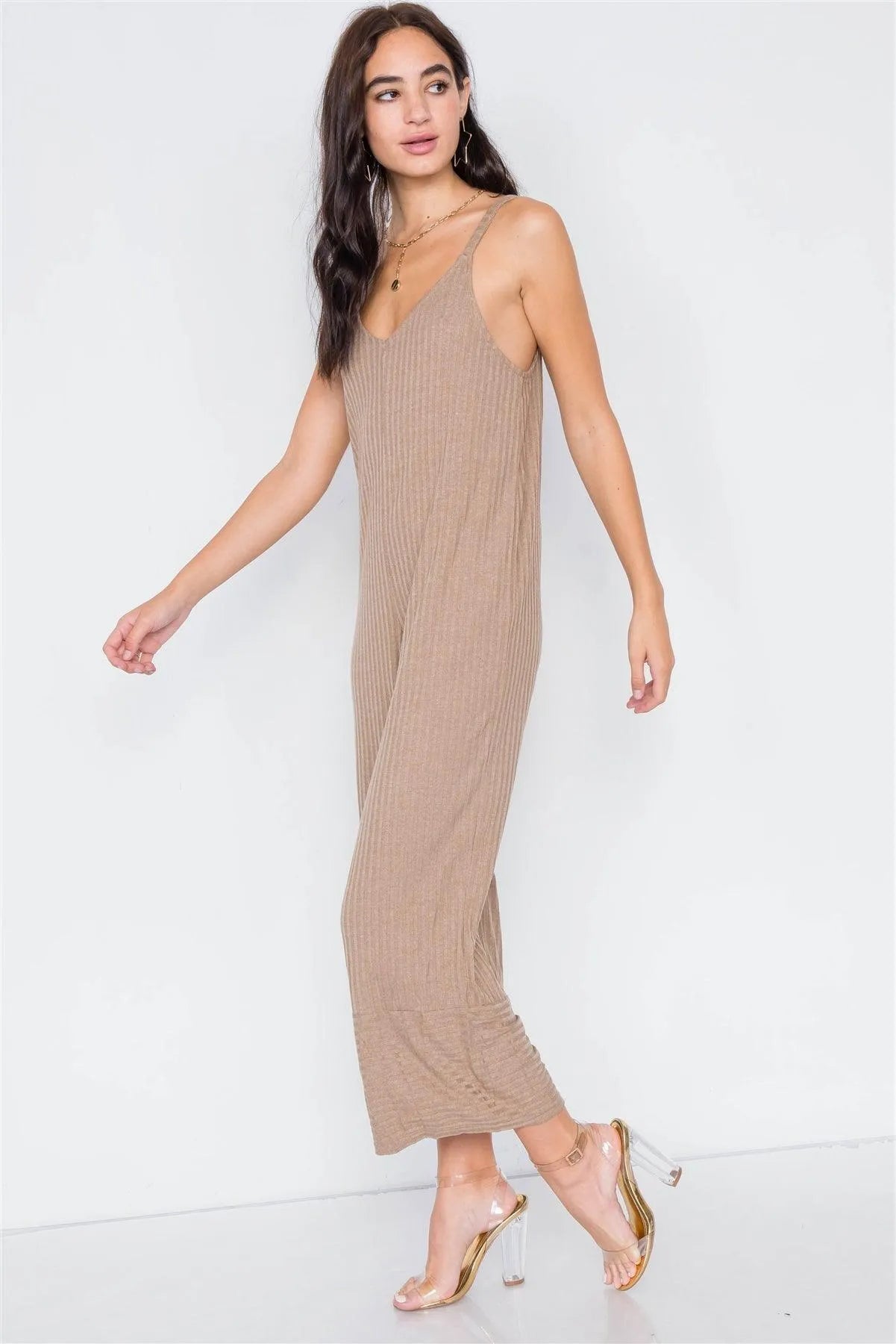 Camel V-Neck Ribbed Knit Gaucho Jumpsuit /4-2-1