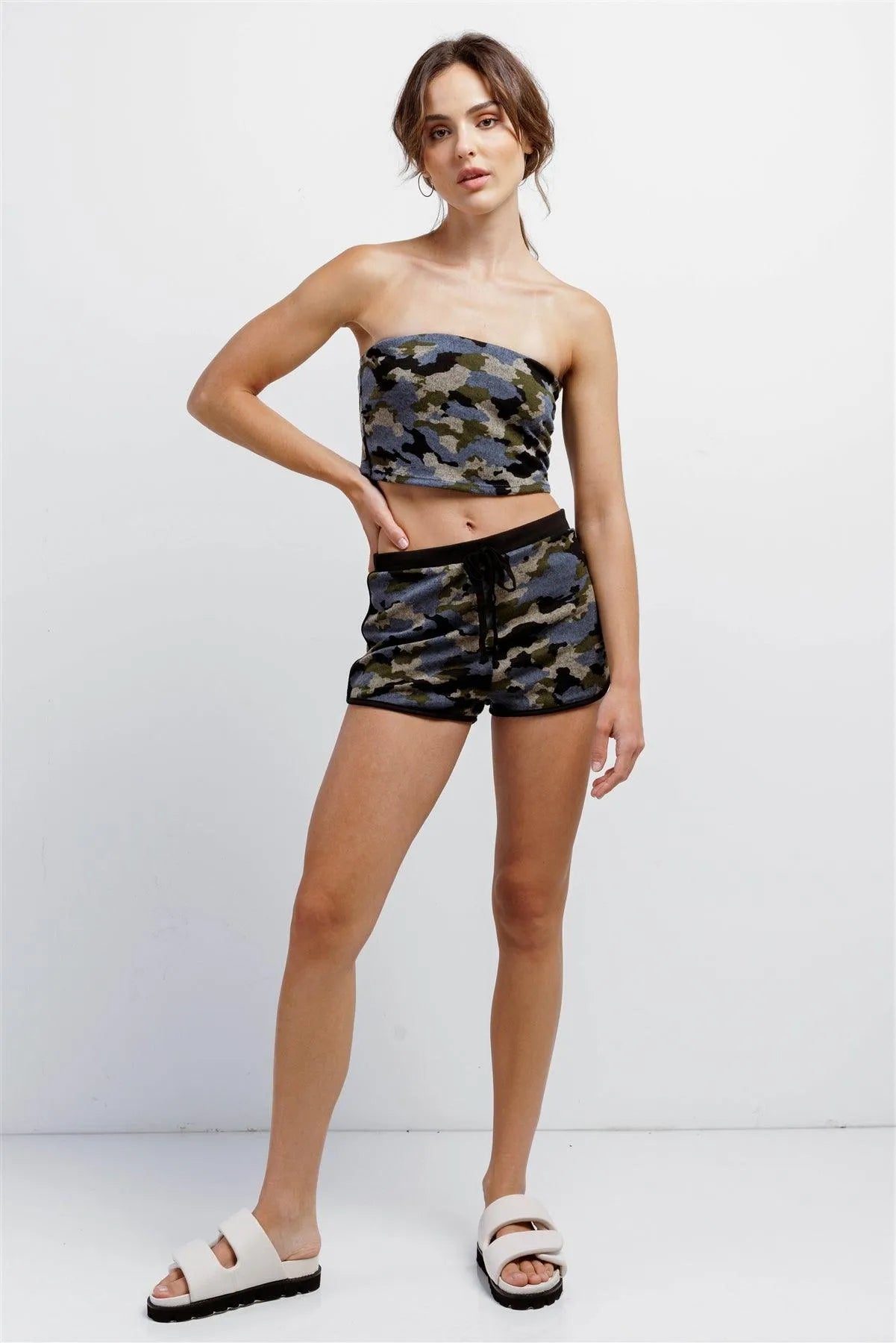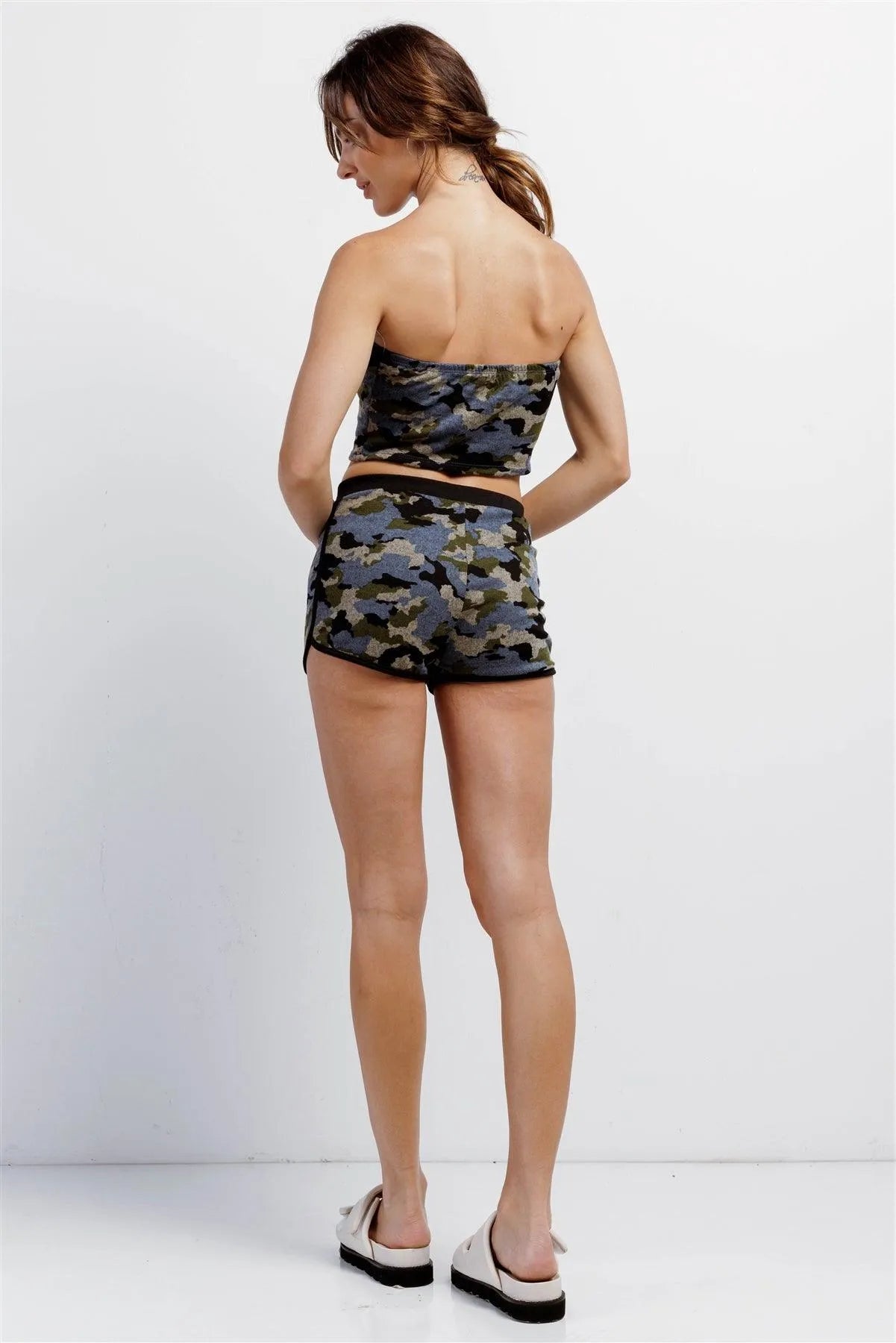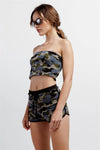 Blue Camo Knit Sleeveless Strapless Tube Crop Top & High Waist Self-Tie Sporty Mini Shorts Set /3-2-1
