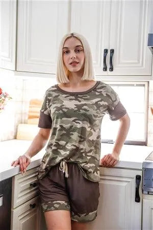 Women set: camo print, loose fit t-shirt, crew neckline, short sleeves, dropped shoulders, shorts, elasticized waistline with drawstring, stretchy, unlined, comfy, loungewear, stylish, trendy, must have