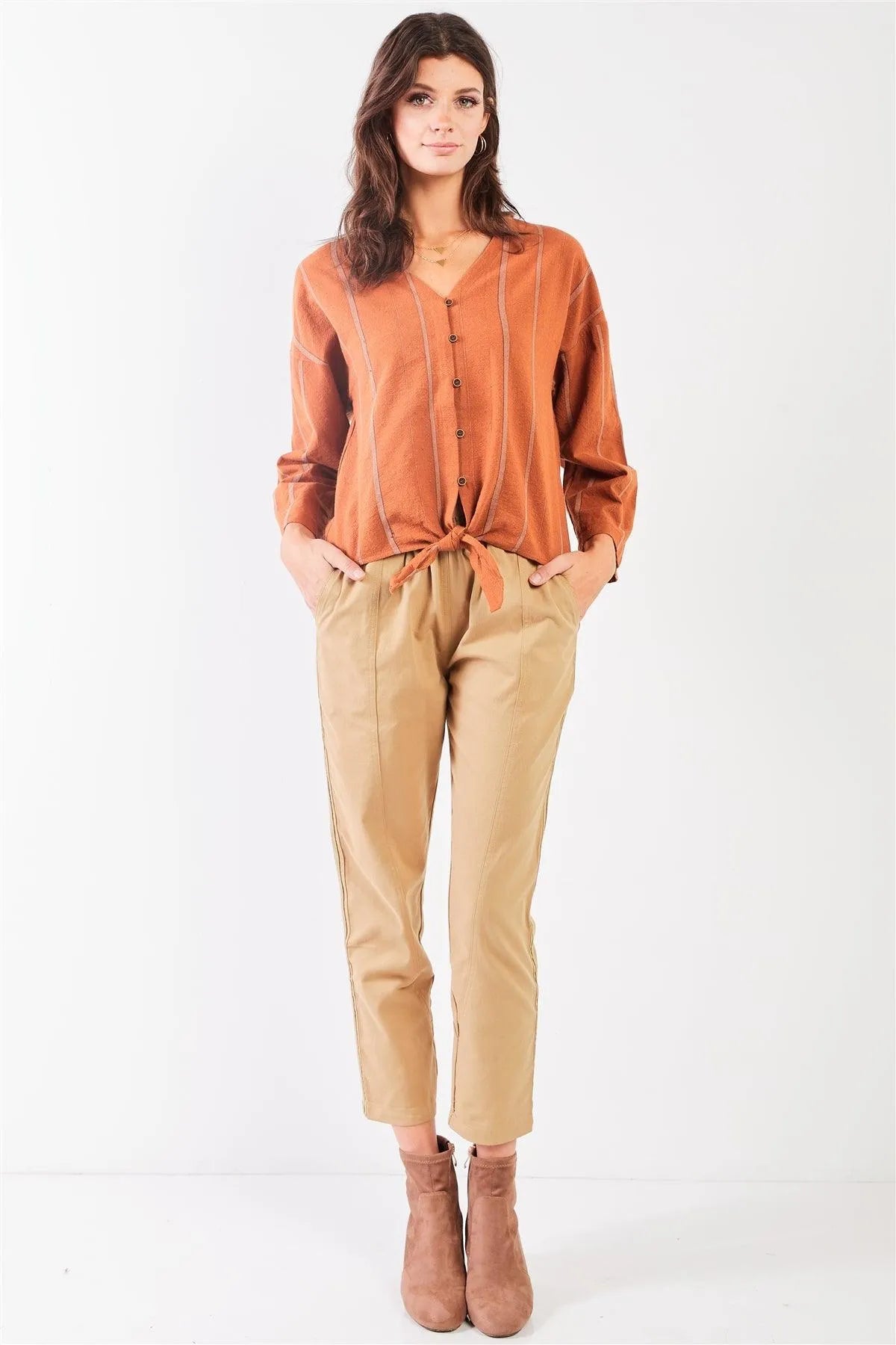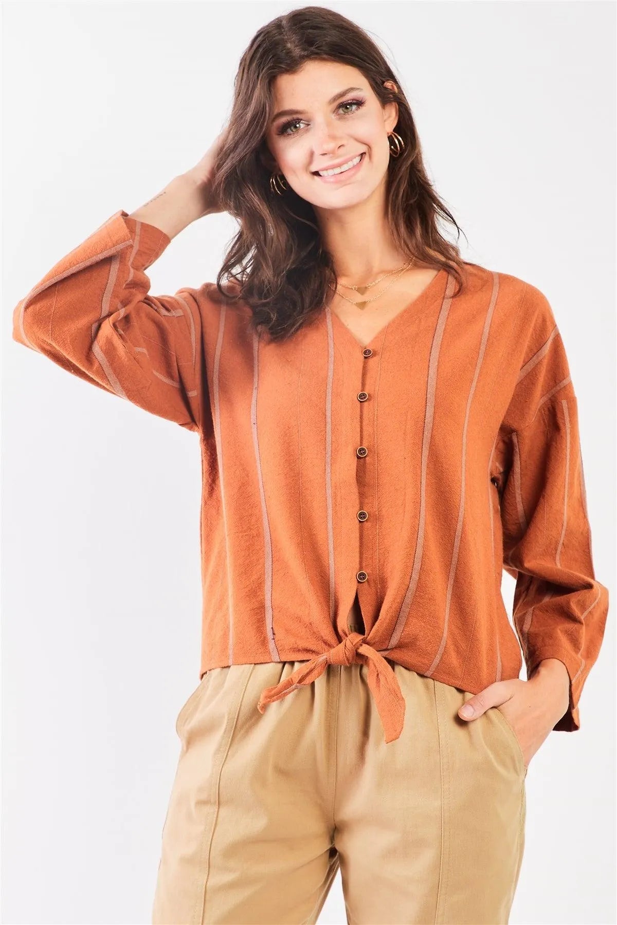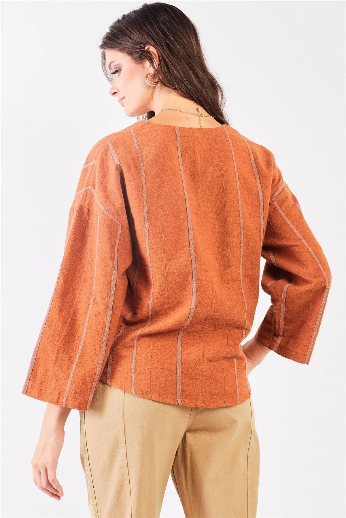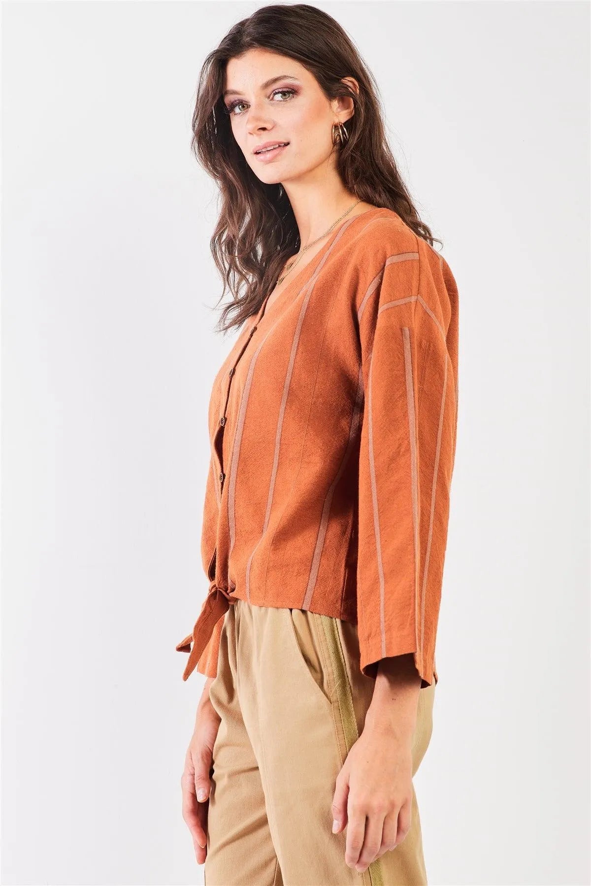 🖤Item Features: Carrot orange, light brown stripe pattern, V-neckline, elastic loop button-down front trim, self-tie bottom hem detail, wide long sleeve, relaxed fit, unlined, non-sheer, cotton, eco, breathable, natural, casual, fall/winter collection