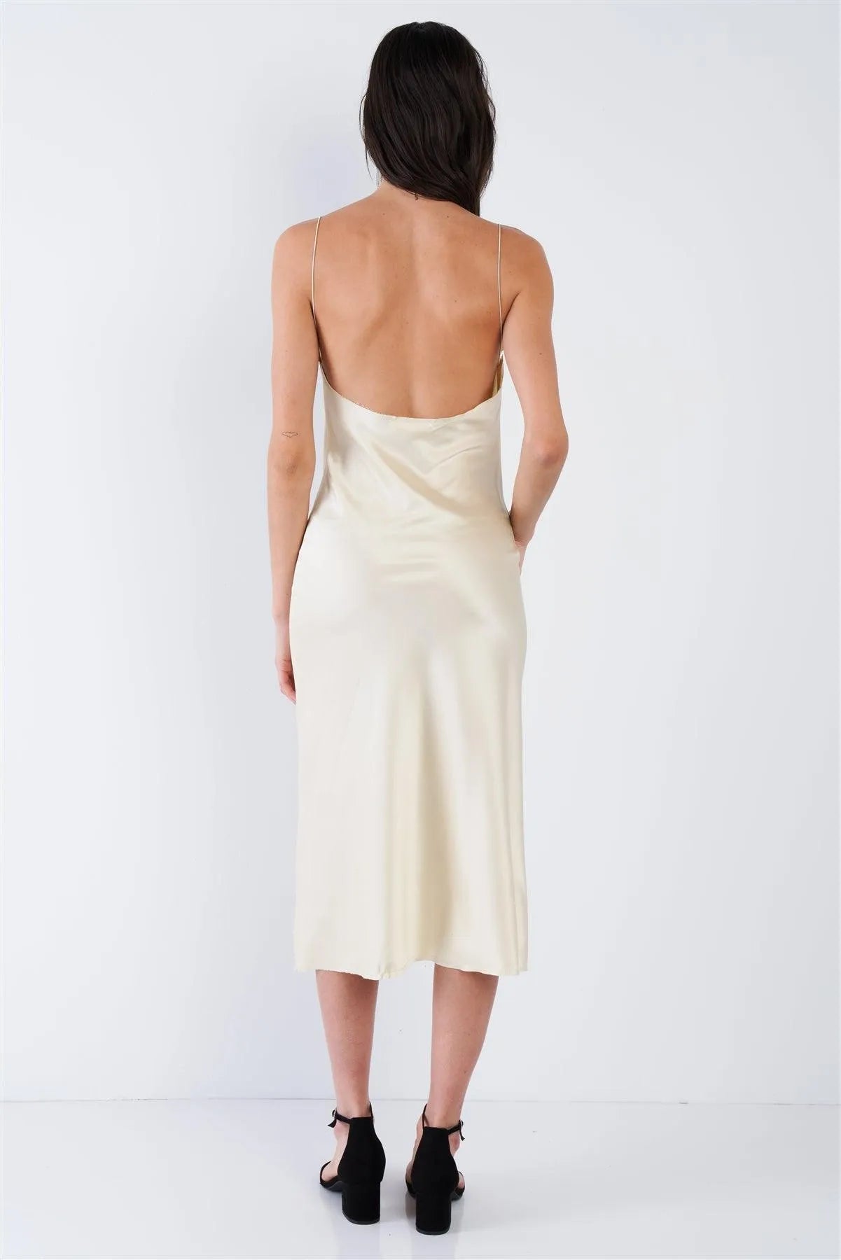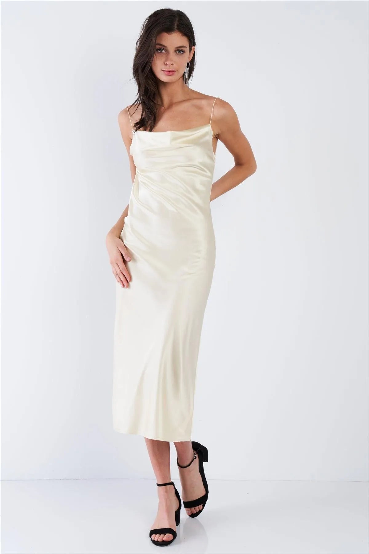 Dress Features: solid, cowl neck, retro chic, champagne yellow, spaghetti straps, raw cut hem/unfinished Trim Hem, club wear, vintage, unlined, some stretch. Model is 5'9 wearing a size Small ( Waist: 23.5", Bust: 32B, Hips: 36")Item Measurements: Length: 39" , Bust: 28"Item comes pre-packed with hang tagsTrue to size