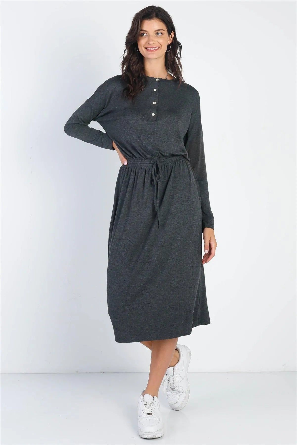 🖤 Item Features: Charcoal, solid color, button up detail round neckline, long sleeves, dropped shoulders, fitted elasticized waistline with adjustable drawstring, relaxed fit, midi length, not see through, semi-stretchy, unlined, casual, cute, everyday look.