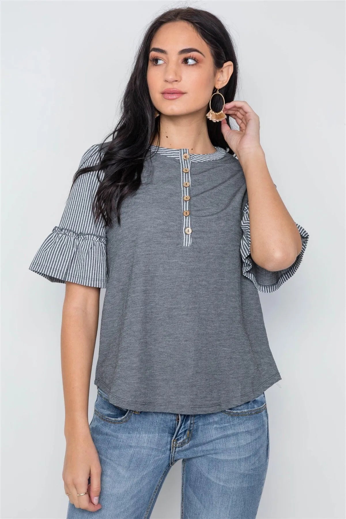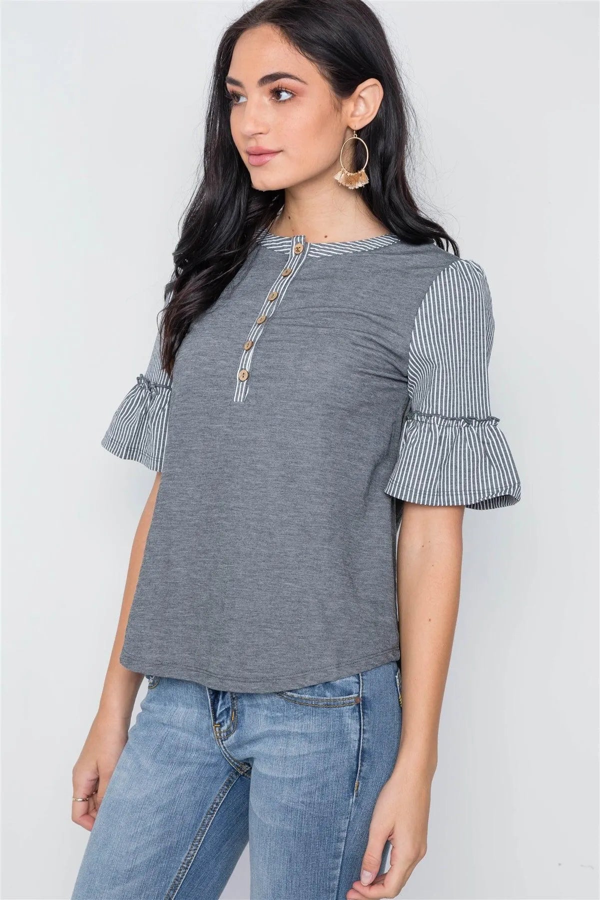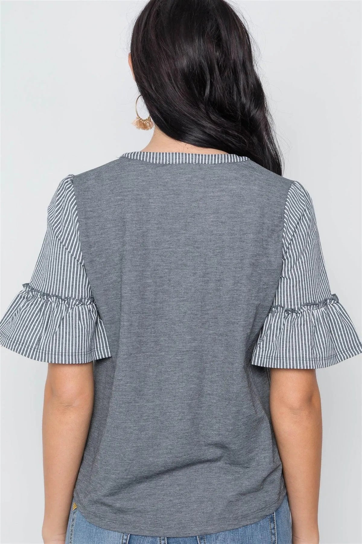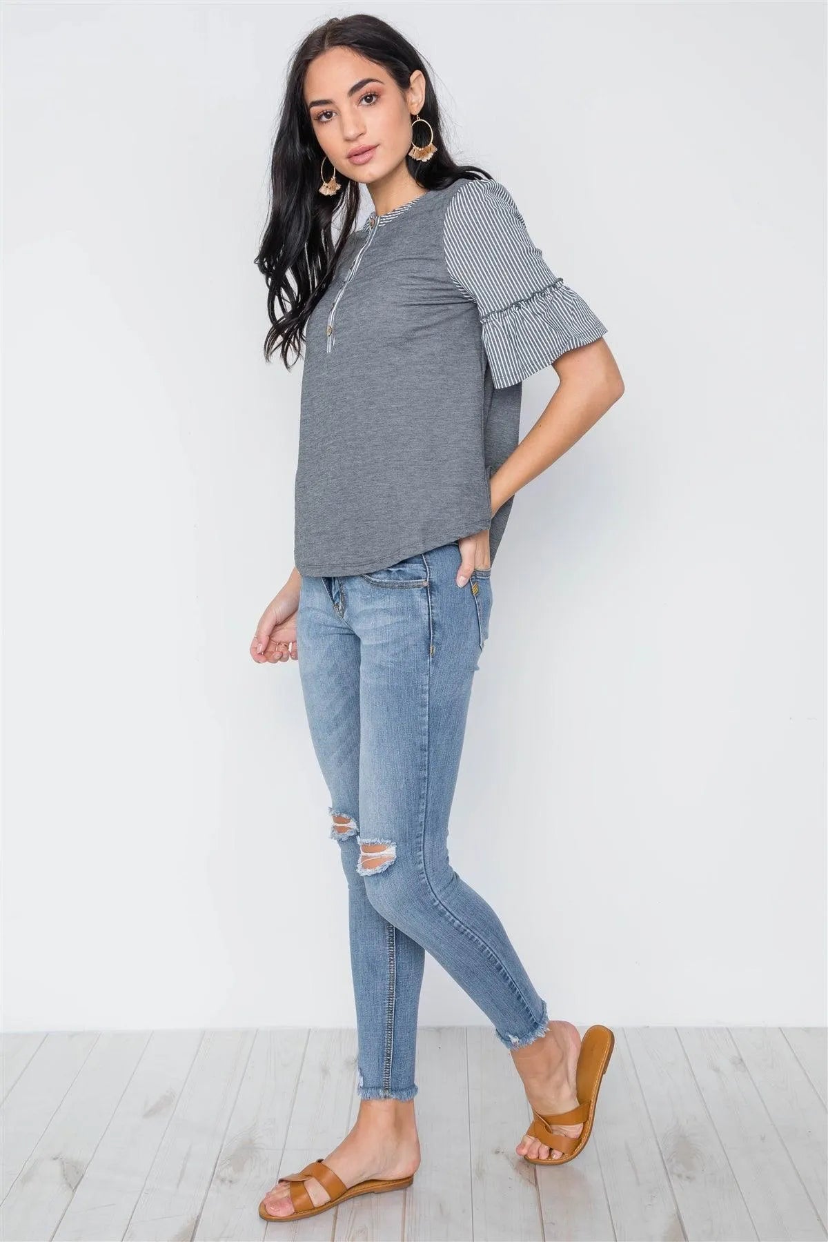Charcoal Contrast Stripe Ruffle Sleeves Boho Top / 1-2-2