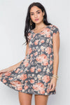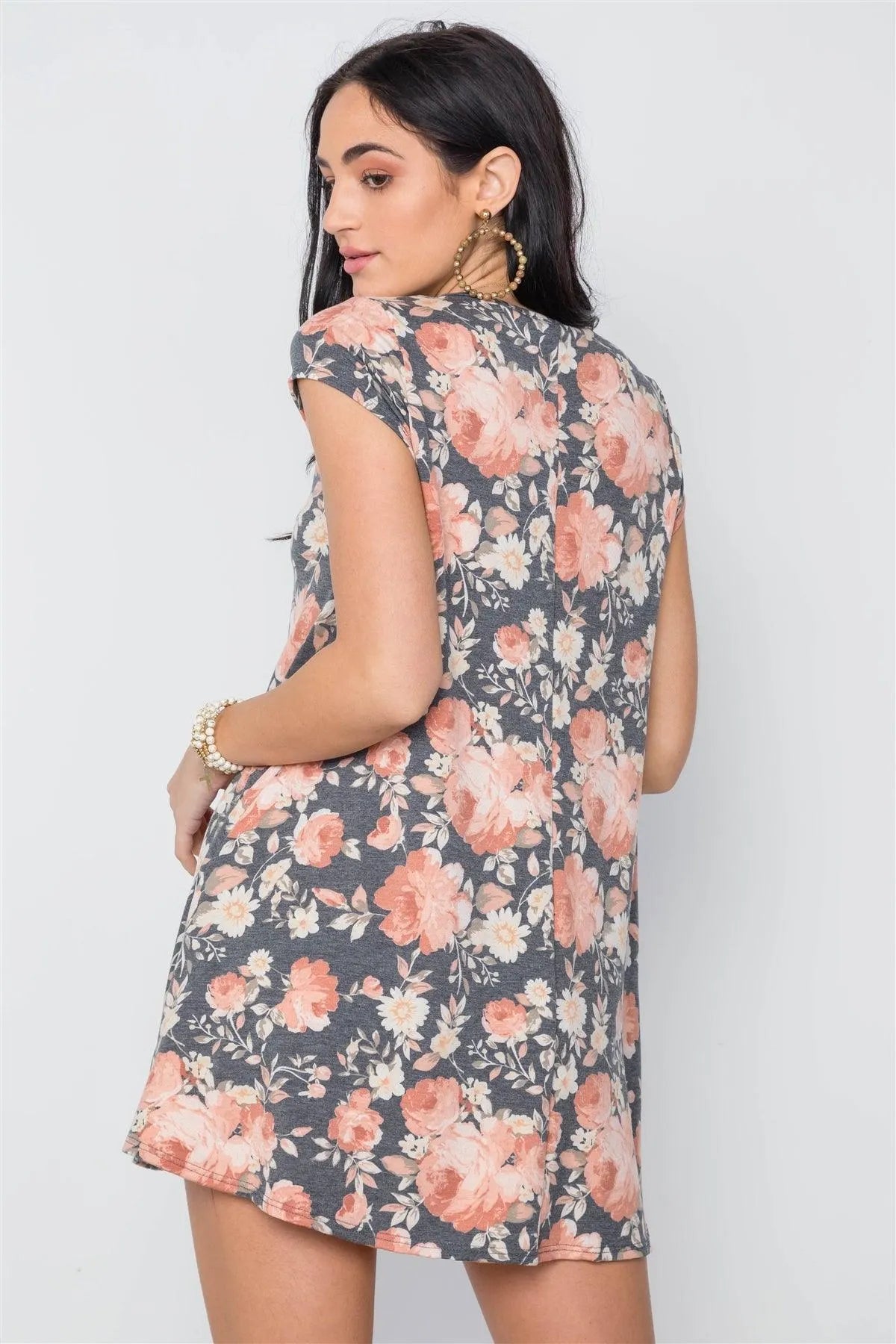 Charcoal Floral Print Short Sleeve Tunic Mini Dress / 1-2-1